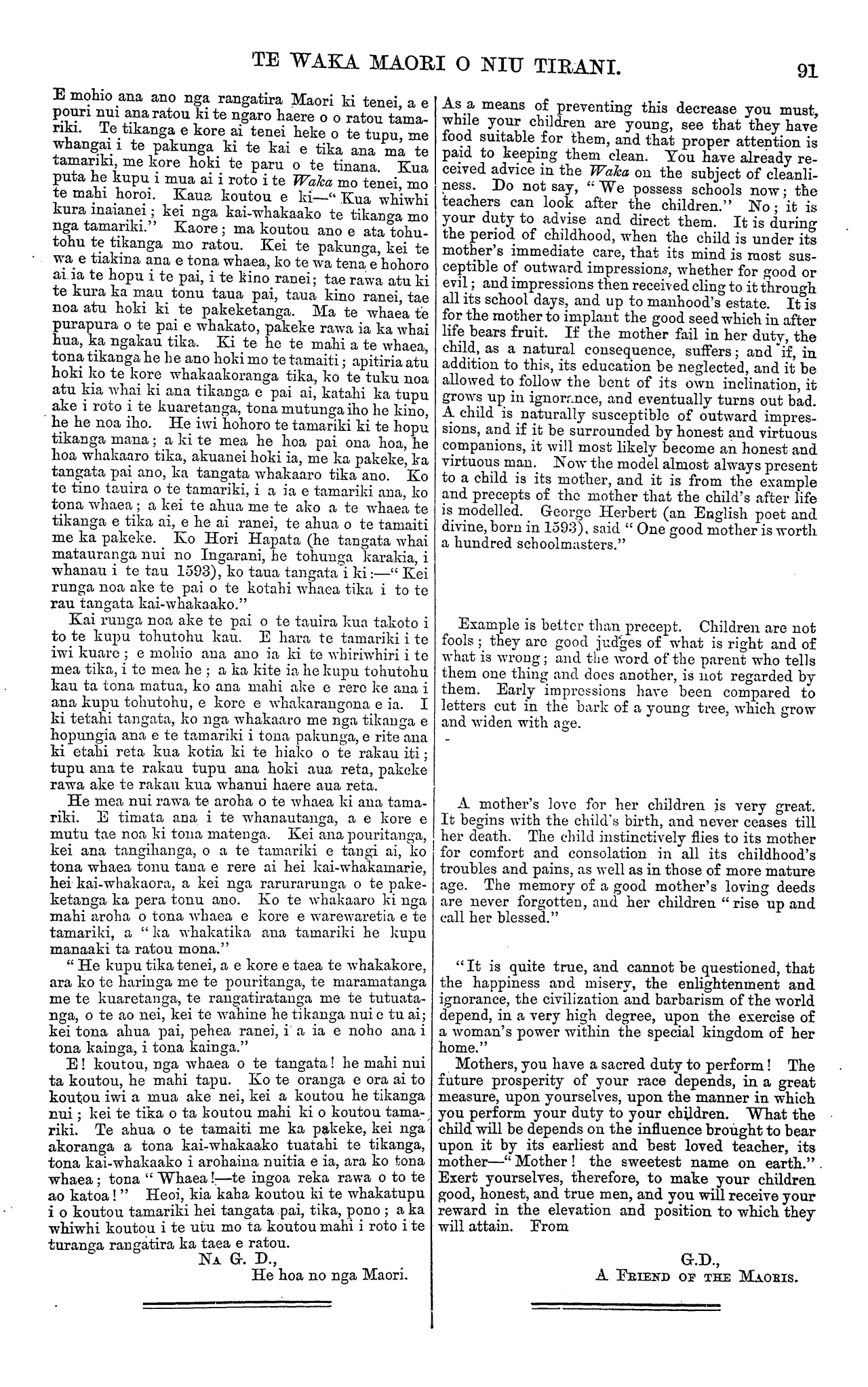 TE WAKA MAORI O NIU TIRANI. 91 E mohio ana ano nga rangatira Maori ki tenei, a e I pouri nui ana ratou ki te ngaro haere o o ratou tama- riki. Te tikanga e kore ai tenei heke o te tupu, me whangai i te pakunga ki te kai e tika ana ma te tamariki, me kore hoki te paru o te tinana. Kua puta he kupu i mua ai i roto i te Waka mo tenei, mo te mahi horoi. Kaua koutou e ki—" Kua whiwhi kura inaianei; kei nga kai-whakaako te tikanga mo nga tamariki." Kaore; ma koutou ano e ata tohu- tohu te tikanga mo ratou. Kei te pakunga, kei te wa e tiakina ana e tona whaea, ko te wa tena e hohoro ai ia te hopu i te pai, i te kino ranei; tae rawa atu ki te kura ka mau tonu taua pai, taua kino ranei, tae noa atu hoki ki te pakeketanga. Ma te whaea te purapura o te pai e whakato, pakeke rawa ia ka whai hua, ka ngakau tika. Ki te he te mahi a te whaea, tona tikanga he he ano hoki mo te tamaiti; apitiria atu hoki ko te kore whakaakoranga tika, ko te tuku noa atu kia whai ki ana tikanga e pai ai, katahi ka tupu ake i roto i te kuaretanga, tona mutunga iho he kino, he he noa iho. He iwi hohoro te tamariki ki te hopu tikanga mana; a ki te mea he hoa pai ona hoa, he hoa whakaaro tika, akuanei hoki ia, me ka pakeke, ka tangata pai ano, ka tangata whakaaro tika ano. Ko te tino tauira o te tamariki, i a ia e tamariki aua, ko tona whaea; a kei te ahua me te ako a te whaea te tikanga e tika ai, e he ai ranei, te ahua o te tamaiti me ka pakeke. Ko Hori Hapata (he tangata whai matauranga nui no Ingarani, he tohunga karakia, i whanau i te tau 1593), ko taua tangata i ki:—" Kei runga noa ake te pai o te kotahi whaea tika i to to rau tangata kai-whakaako." Kai runga noa ake te pai o te tauira kua takoto i to te kupu tohutohu kau. E hara te tamariki i te iwi kuare; e mohio ana ano ia ki to whiriwhiri i te mea tika, i to mea he; a ka kite ia he kupu tohutohu kau ta tona matua, ko ana mahi ake e rere ke aua i ana kupu tohutohu, e kore e whakarangona e ia. I ki tetahi tangata, ko nga whakaaro me nga tikanga e hopungia ana e te tamariki i tona pakunga, e rite ana ki etahi reta kua kotia ki te hiako o te rakau iti; tupu ana te rakau tupu ana hoki aua reta, pakeke rawa ake te rakau kua whanui haere aua reta. He mea nui rawa te aroha o te whaea ki ana tama- riki. E timata ana i te whanautanga, a e kore e mutu tae noa ki tona matenga. Kei ana pouritanga, kei ana tangihanga, o a te tamariki e tangi ai, ko tona whaea tonu tana e rere ai hei kai-whakamarie, hei kai-whakaora, a kei nga rarurarunga o te pake- ketanga ka pera tonu ano. Ko te whakaaro ki nga mahi aroha o tona whaea e kore e warewaretia e te tamariki, a " ka whakatika ana tamariki he kupu manaaki ta ratou mona." " He kupu tika tenei, a e kore e taea te whakakore, ara ko to haringa me te pouritanga, te maramatanga me te kuaretanga, te rangatiratanga me te tutuata- nga, o te ao nei, kei te wahine he tikanga nui e tu ai; kei tona ahua pai, pehea ranei, i a ia e noho ana i tona kainga, i tona kainga." E! koutou, nga whaea o te tangata! he mahi nui ta koutou, he mahi tapu. Ko te oranga e ora ai to koutou iwi a mua ake nei, kei a koutou he tikanga nui; kei te tika o ta koutou mahi ki o koutou tama- riki. Te ahua o te tamaiti me ka pakeke, kei nga akoranga a tona kai-whakaako tuatahi te tikanga, tona kai-whakaako i arohaina nuitia e ia, ara ko tona whaea; tona " Whaea!—te ingoa reka rawa o to te ao katoa! " Heoi, kia kaha koutou ki te whakatupu i o koutou tamariki hei tangata pai, tika, pono; a ka whiwhi koutou i te utu mo ta koutou mahi i roto i te turanga rangatira ka taea e ratou. NA G. D., He hoa no nga Maori. As a means of preventing this decrease you must, while your children are young, see that they have food suitable for them, and that proper attention is paid to keeping them clean. You have already re- ceived advice in the Waka on the subject of cleanli- ness. Do not say, " We possess schools now; the teachers can look after the children." No; it is your duty to advise and direct them. It is during the period of childhood, when the child is under its mother's immediate care, that its mind is most sus- ceptible of outward impressions, whether for good or evil; and impressions then received cling to it through all its school days, and up to manhood's estate. It is for the mother to implant the good seed which in after life bears fruit. If the mother fail in her duty, the child, as a natural consequence, suffers; and if, in addition to this, its education be neglected, and it be allowed to follow the bent of its own inclination, it grows up in ignorance, and eventually turns out bad. A child is naturally susceptible of outward impres- sions, and if it be surrounded by honest and virtuous companions, it will most likely become an honest and virtuous man. Now the model almost always present to a child is its mother, and it is from the example and precepts of the mother that the child's after life is modelled. George Herbert (an English poet and divine, born in 1593), said " One good mother is worth a hundred schoolmasters." Example is better than precept. Children are not fools; they are good judges of what is right and of what is wrong; and the word of the parent who tells them one thing and does another, is not regarded by them. Early impressions have been compared to letters cut in the bark of a young tree, which grow and widen with age. A mother's love for her children is very great. It begins with the child's birth, and never ceases till her death. The child instinctively flies to its mother for comfort and consolation in all its childhood's troubles and pains, as well as in those of more mature age. The memory of a good mother's loving deeds are never forgotten, and her children " rise up and call her blessed." "It is quite true, and cannot be questioned, that the happiness and misery, the enlightenment and ignorance, the civilization and barbarism of the world depend, in a very high degree, upon the exercise of a woman's power within the special kingdom of her home."