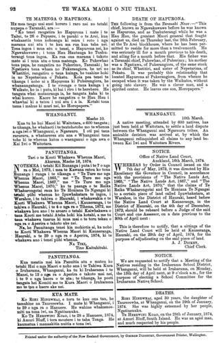 92 TE WAKA MAORI O NIU TIRANI. TE MATENGA O HAPURONA. HE mea tango mai enei korero i raro nei no tetahi nupepa Taranaki, ara:— "Ko tenei rangatira ko Hapurona i mate i te Taitei, te 26 o Pepuere, i te paraki o te Arei, kua whakaaetia tona nohoanga ki reira i roto i nga marama nui atu i te kau ma rua kua taha nei. Tona ingoa i mua atu o tenei, o Hapurona nei, ko Ngawakawawe; i tona Hau Hautanga ko Tuahu- terangi toua ingoa. Ka rua ona marama i takoto mate ai i mua atu o tona matenga. Ko Pukewhao tona papa, he rangatira no Pukerimu, Taranaki; he Ngatiawa tona whaea no Pukerangiora, he uri no Whatitiri, rangatira o taua kainga, he tuahine hoki ia no Nepetarima o Pekatu. Koia pea tenei te tikanga i noho ai a Hapurona ki Pukerangiora, he whanaungatanga. I te rironga o taua kainga i a Waikato, ko ia i puta, ki hai i riro i te herehere. He tangata whai matauranga ia, he tangata kaha ki te whai korero. Kaore he rangatira o te Hau Hau i whawhai ki a tatou i nui atu i a ia. Kotahi tona tama i mahue ki muri nei, ko Horopapera. WHANGANUI. Maehe 10. Kua tu he hui Maori ki Waitotara, e 600 tangata; te tikanga, he whakaoti i te tautohetohe mo te whenua a nga iwi o Whanganui, o Ngarauru. I oti pai taua raruraru, a whakarerea atu ana e Whanganui tana tohe ki te whenua katoa o waenganui o nga awa o Kai Iwi o Waitotara. PANUITANGA. Tari o te Kooti Whakawa Whenua Maori, Akarana, Maehe 16, 1874. NOTEMEA i tetahi Kii Runanga i puta i te 7 o nga ra o Mei, 1873, i mea te Kawana ratou ko tona Runanga i runga i te tikanga o " Te Ture mo nga Whenua Maori, 1865," me "Te Ture mo nga Whenua Maori, 1867," me " Te Ture mo nga Whenua Maori, 1870," ko te paanga o te Raika Whakarongotai raua ko Te Honiana Te Ngangai ki tetahi piihi whenua ko Ipuwhakatara te ingoa, i 'Warahoe, i te takiwa o Hauraki, i whakawakia e te Kooti Whakawa Whenua Maori, i Kauaeranga, i te takiwa o Hauraki, i te 4 o nga ra o Tihema, 1872, me whakawa hou ano i te aroaro o tetahi Kaiwhakawa o taua Kooti me tetahi Ateha hoki kia kotahi, a me tu taua whakawa tuarua ki mua mai o te toru tekau o nga ra o Aperira e takoto ake nei. Na, he Panuitanga tenei kia mohiotia ai, ka noho te Kooti Whakawa Whenua Maori ki Kauaeranga, Hauraki, a te 29 o nga ra o Aperira, 1874, ki te whakawa ano i tenei piihi whenua. NA TIKI, Tino Kaituhituhi. PANUITANGA. Kua meatia mai kia Panuitia atu e matou ko tetahi Hui o nga Maori e noho ana i te Takiwa Kura o Iruharama, Whanganui, ka tu ki Iruharama i te Manei, te 13 o nga ra o Aperira e takoto mai nei, i te 9 o nga haora o te ata; te tikanga, he pooti tangata hei Komiti mo te Kura Maori o Iruharama mo te tau e haere ake nei. KUA MATE. Ko RIHI HINEWHAI, e toru te kau ona tau, he tamahine na Taurerewha. I mate ki Whanganui, i te 29 o nga ra o Hanuere. He wahine whakamoe- miti na tona iwi, na Ngatiuenuku. Ko TE HEREWINI KOAO, i te 28 o Hanuere, 1874, ki Amuri Bluff, i tera moutere i te taha Tonga. He kaumatua i manaakitia nuitia e tona iwi. DEATH OF HAPURONA. THE following is from the Taranaki News:—" This chief, known as Ngawakawawe before he was known as Hapurona, and as Tuahuterangi while he was a Hau Hau, the greatest Maori general that fought against us, died on Thursday last, the 26th February, at the Te Arei blockhouse, where he has been per- mitted to reside for more than a twelvemonth. He was seriously ill for a month previous to his death, and ailing for a month before that. His father was a Taranaki chief, Pukewhao, of Pukerimu; his mother was a Ngatiawa, of Pukerangiora, of the same stock as its chief, Whatitiri, and sister of Nepetarima, of Pekatu. It was probably this relationship that located Hapurona at Pukerangiora, from whence he escaped when it was taken by the Waikatos, without going into slavery. He was a clever man, and a spirited orator. He leaves one son, Horopapera." WHANGANUI. 10th March. A native meeting, attended by 600 natives, ha» just been held at Waitotara, to settle a land dispute between the Whanganui and Ngarauru tribes. An amicable decision was arrived at, by which the Whanganui relinquished all claims to any land be- tween Kai Iwi and Waitotara Rivers. NOTICE. Office of Native Land Court, Auckland, 16th March, 1874. WHEREAS by Order in Council issued on the 7th day of May, 1873, it was directed by His Excellency the Governor in Council, in accordance with the provisions of " The Native Lands Act, 1865," "The Native Lands Act, 1867," and "The Native Lands Act, 1870," that the claims of Te Raika Whakarongotai and Te Honiana Te Ngangai to a certain piece of land called Ipuwhakatara, at Warahoe, in the District of Hauraki, heard before the Native Land Court at Kauaeranga, in the District of Hauraki, on the 4th day of December, 1872, should be reheard before a Judge of the said Court and one Assessor, on a date previous to the 30th of April next: This is therefore to notify, that a sittings of the Native Land Court will be held- at Kauaeranga, Hauraki, on the 29th day of April, 1874, for the purpose of adjudicating on the said piece of land. A. J. DICKEY, Chief Clerk. NOTICE. We are requested to notify that a Meeting of the Natives residing in the Iruharama School District, Whanganui, will be held at Iruharama, on Monday, the 13th day of April next, at 9 o'clock a.m., for the purpose of electing a School Committee for the Iruharama Native, School. DEATHS. RIHI HINEWHAI, aged 30 years, the daughter of Taurerewha, at Whanganui, on the 29th of January, 1874. She was highly esteemed by her people, Ngatiuenuku. TE HEREWINI KOAO, on the 28th of January, 1874, at Amuri Bluff, South Island. He was an aged man, and much respected by his people. Printed under the authority of the New Zealand Government, by GEORGE DIDSBURY, Government Printer, Wellington.