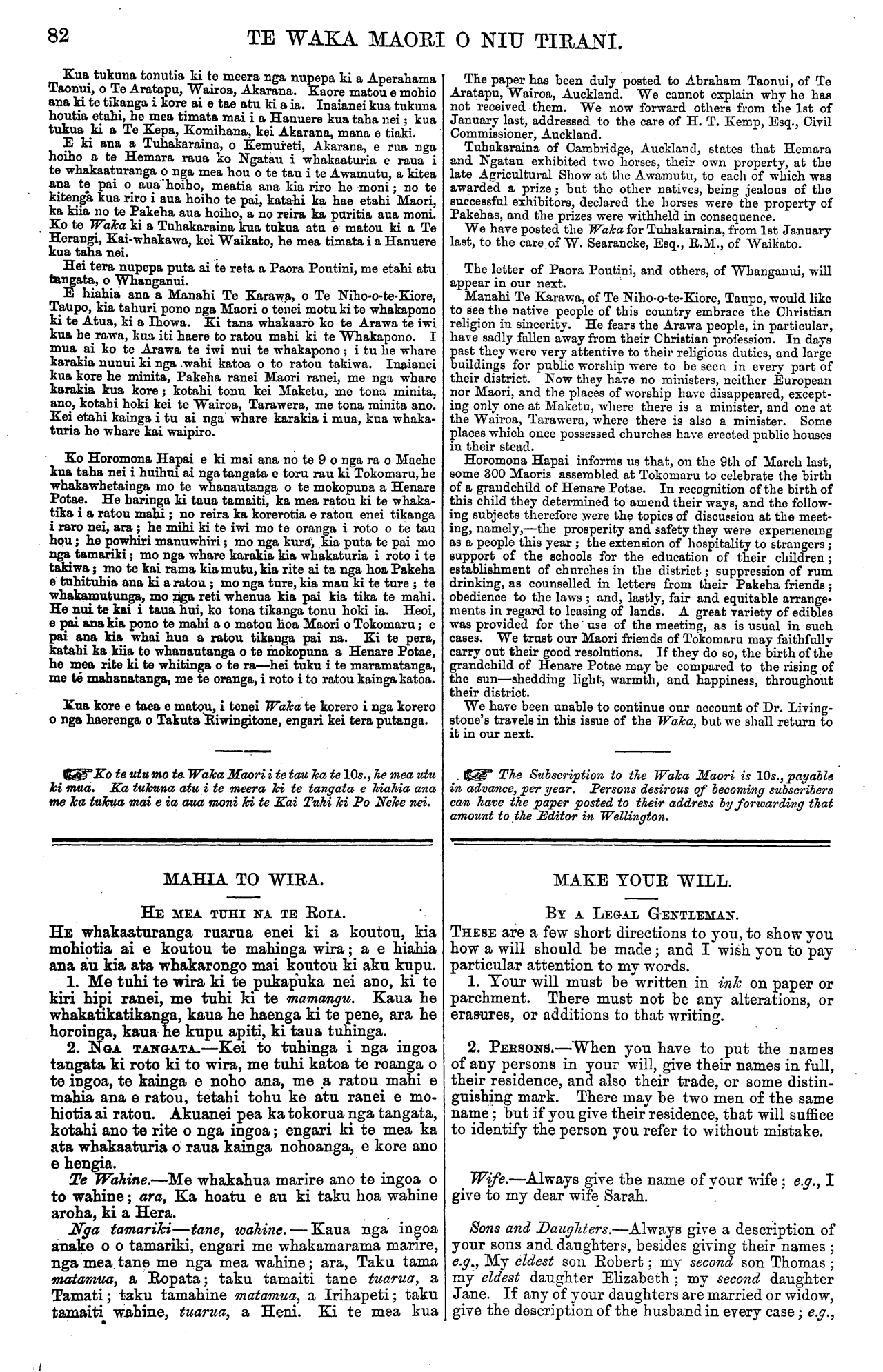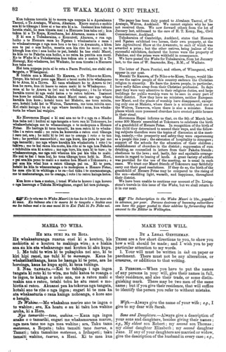 82 TE WAKA MAORI O NIU TIRANI. Kua tukuna tonutia ki te meera nga nupepa ki a Aperahama Taonui, o Te Aratapu, Wairoa, Akarana. Kaore matou e mohio ana ki te tikanga i kore ai e tae atu ki a ia. Inaianei kua tukuna houtia etahi, he mea timata mai i a Hanuere kua taha nei; kua tukua ki a Te Kepa, Komihana, kei Akarana, mana e tiaki. E ki ana a Tuhakaraina, o Kemureti, Akarana, e rua nga hoiho a te Hemara raua ko Ngatau i whakaaturia e raua i te whakaaturanga o nga mea hou o te tau i te Awamutu, a kitea aua te pai o aua hoiho, meatia ana kia riro he moni; no te kitenga kua riro i aua hoiho te pai, katahi ka hae etahi Maori, ka kiia no te Pakeha aua hoiho, a no reira ka puritia aua moni. Ko te Waka ki a Tuhakaraina kua tukua atu e matou ki a Te Herangi, Kai-whakawa, kei Waikato, he mea timata i a Hanuere kua taha nei. Hei tera nupepa puta ai te reta a Paora Poutini, me etahi atu tangata, o Whanganui. E hiahia ana a Manahi Te Karawa, o Te Niho-o-te-Kiore, Taupo, kia tahuri pono nga Maori o tenei motu ki te whakapono ki te Atua, ki a Ihowa. Ki tana whakaaro ko te Arawa te iwi kua he rawa, kua iti haere to ratou mahi ki te Whakapono. I mua ai ko te Arawa te iwi nui te whakapono; i tu he whare karakia nunui ki nga wahi katoa o to ratou takiwa. Inaianei kua kore he minita, Pakeha ranei Maori ranei, me nga whare karakia kua kore; kotahi tonu kei Maketu, me tona minita, ano, kotahi hoki kei te Wairoa, Tarawera, me tona minita ano. Kei etahi kainga i tu ai nga whare karakia i mua, kua whaka- turia he whare kai waipiro. Ko Horomona Hapai e ki mai ana no te 9 o nga ra o Maehe kua taha nei i huihui ai nga tangata e toru rau ki Tokomaru, he whakawhetainga rno te whanautanga o te mokopuna a Henare Potae. He haringa ki taua tamaiti, ka mea ratou ki te whaka- tika i a ratou mahi; no reira ka korerotia e ratou enei tikanga i raro nei, ara; he mihi ki te iwi mo te oranga i roto o te tau hou; he powhiri manuwhiri; mo nga kura, kia puta te pai mo nga tamariki; mo nga whare karakia kia whakaturia i roto i te takiwa; mo te kai rama kia mutu, kia rite ai ta nga hoa Pakeha e" tuhituhia ana ki a ratou; mo nga ture, kia mau ki te ture; te whakamutunga, mo nga reti whenua kia pai kia tika te mahi. He nui te kai i taua hui, ko tona tikanga tonu hoki ia. Heoi, e pai ana kia pono te mahi a o matou hoa Maori o Tokomaru; e pai ana kia whai hua a ratou tikanga pai na. Ki te pera, katahi ka kiia te whanautanga o te mokopuna a Henare Potae, he mea rite ki te whitinga o te ra—hei tuku i te maramatanga, me te mahanatanga, me te oranga, i roto i to ratou kainga katoa. Kua kore e taea e matou, i tenei Waka te korero i nga korero o nga haerenga o Takuta Riwingitone, engari kei tera putanga. Ko te utu mo te. Waka Maori i te tau ka te 10s., he mea utu Id mua. Ka tukuna atu i te meera ki te tangata e Mahia ana me ka tukua mai e ia aua moni ki te Kai Tuhi ki Po Neke nei. MAHIA TO WIRA. HE MEA TUHI NA. TE ROIA. HE whakaaturanga ruarua enei ki a koutou, kia mohiotia ai e koutou te mahinga wira; a e hiahia ana au kia ata whakarongo mai koutou ki aku kupu. 1. Me tuhi te wira ki te pukapuka nei ano, ki te kiri hipi ranei, me tuhi ki te mamangu. Kaua he whakatikatikanga, kaua he haenga ki te pene, ara he horoinga, kaua he kupu apiti, ki taua tuhinga. 2. NGA TANGATA.—Kei to tuhinga i nga ingoa tangata ki roto ki to wira, me tuhi katoa te roanga o te ingoa, te kainga e noho ana, me a ratou mahi e mahia ana e ratou, tetahi tohu ke atu ranei e mo- hiotia ai ratou. Akuanei pea ka tokorua nga tangata, kotahi ano te rite o nga ingoa; engari ki te mea ka ata whakaaturia o raua kainga nohoanga, e kore ano e hengia. Te Wahine.—Me whakahua marire ano te ingoa o to wahine; ara, Ka hoatu e au ki taku hoa wahine aroha, ki a Hera. Nga tamariki—tane, wahine.—Kaua nga ingoa anake o o tamariki, engari me whakamarama marire, nga mea. tane me nga mea wahine; ara, Taku tama matamua, a Ropata; taku tamaiti tane tuarua, a Tamati; taku tamahine matamua, a Irihapeti; taku tamaiti wahine, tuarua, a Heni. Ki te mea kua The paper has been duly posted to Abraham Taonui, of Te Aratapu, Wairoa, Auckland. We cannot explain why ho has not received them. We now forward others from the 1st of January last, addressed to the care of H. T. Kemp, Esq., Civil Commissioner, Auckland. Tuhakaraina of Cambridge, Auckland, states that Hemara and Ngatau exhibited two horses, their own property, at the late Agricultural Show at the Awamutu, to each of which was awarded a prize; but the other natives, being jealous of the successful exhibitors, declared the horses were the property of Pakehas, and the prizes were withheld in consequence. We have posted the Waka for Tuhakaraina, from 1st January last, to the care of W. Searancke, Esq., R.M., of Waikato. The letter of Paora Poutini, and others, of Whanganui, will appear in our next. Manahi Te Karawa, of Te Niho-o-te-Kiore, Taupo, would like to see the native people of this country embrace the Christian religion in sincerity. He fears the Arawa people, in particular, have sadly fallen away from their Christian profession. In days past they were very attentive to their religious duties, and large buildings for public worship were to be seen in every part of their district. Now they have no ministers, neither European nor Maori, and the places of worship have disappeared, except- ing only one at Maketu, where there is a minister, and one at the Wairoa, Tarawera, where there is also a minister. Some places which once possessed churches have erected public houses in their stead. Horomona Hapai informs us that, on the 9th of March last, some 300 Maoris assembled at Tokomaru to celebrate the birth of a grandchild of Henare Potae. In recognition of the birth of this child they determined to amend their ways, and the follow- ing subjects therefore were the topics of discussion at the meet- ing, namely,—the prosperity and safety they were experiencing as a people this year; the extension of hospitality to strangers; support of the schoo