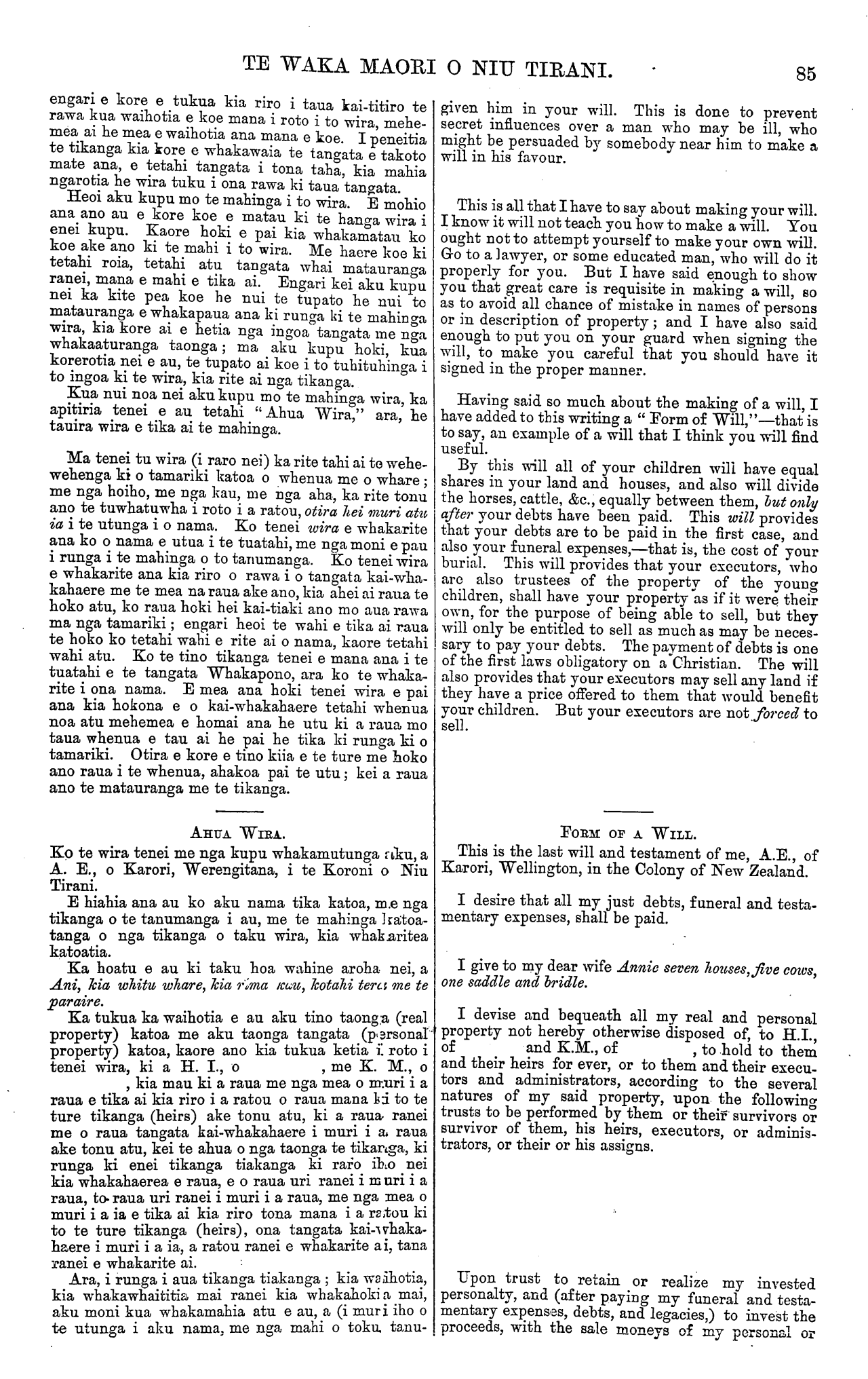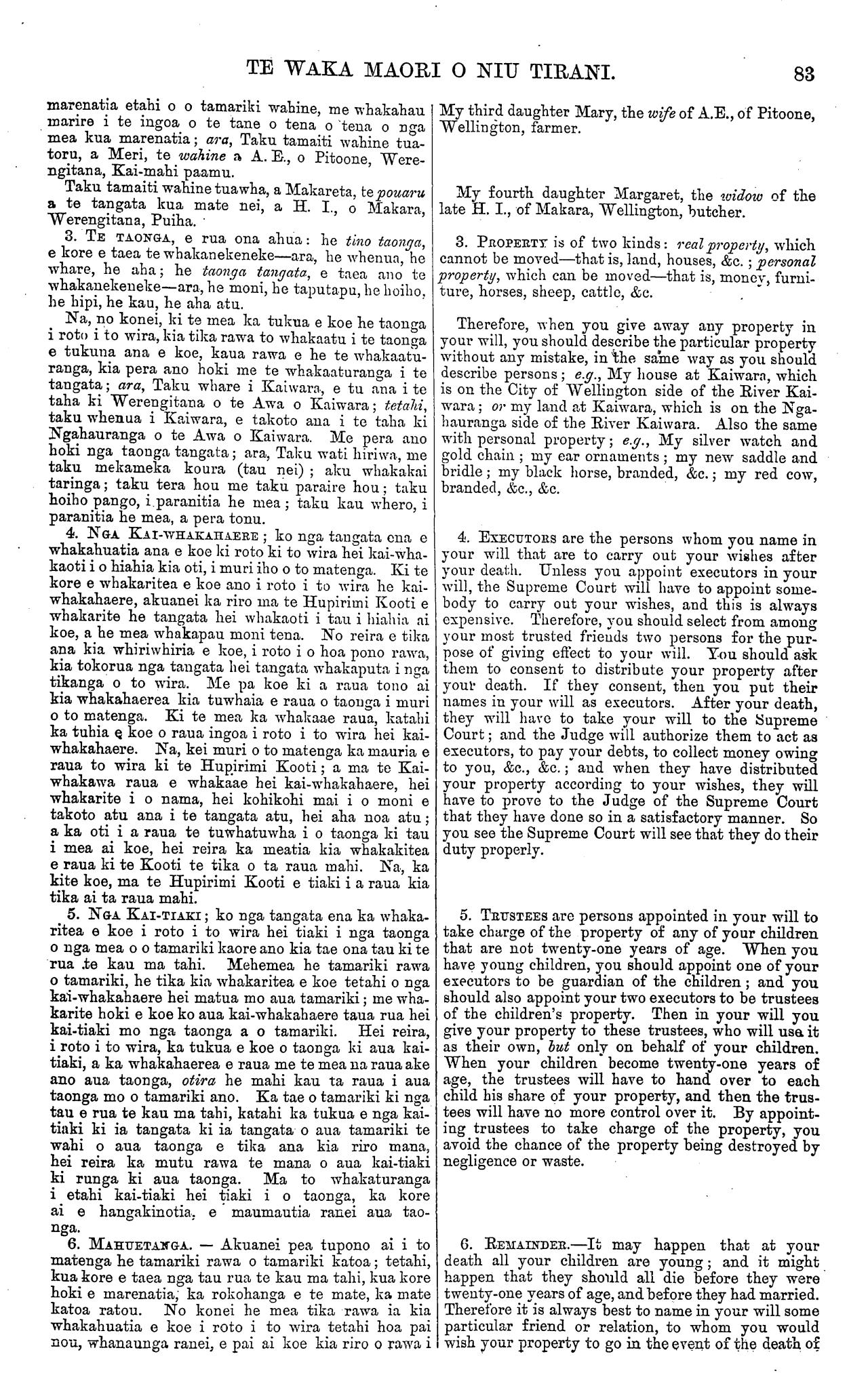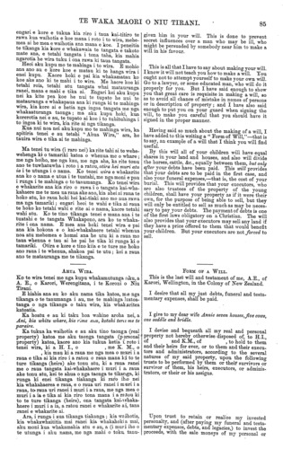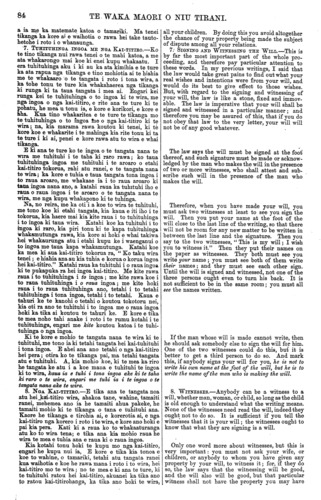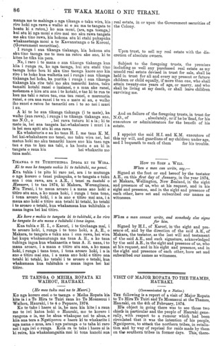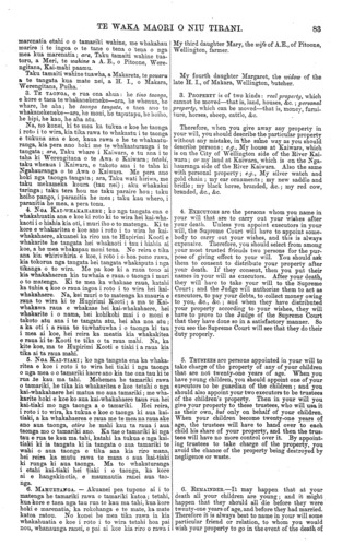 86 TE WAKA MAORI O NIU TIRANI. manga me te mahinga o nga tikanga o taku wira, kia riro hoki nga rawa e waiho ai e au ma te tangata te hoatu ki a ratou,) ko aua moni, (ara, nga toenga,) hui atu ki nga moni e riro mai mo aku rawa tangata me aku tino rawa, kia hokona atu ki etahi pukapuka whakaaetanga moni a te Kawanatanga o te Koroni, (Government securities). I runga i aua tikanga tiakanga, kia hokona atu aku tino taonga me te mea na ratou ake ano, ki te kitea he tika kia pera. Na, i raro i te mana o aua tikanga tiakanga kua kiia i runga ra, ko nga taonga, hui atu etahi tino taonga hoko hou ki aku tino taonga kaore ano kia riro i te hoko kua waihotia nei i runga i aua tikanga tiakanga hei hoko, ka puritia i runga i aua tikanga tiakanga kia rite tahi mo aku tamariki katoa, taku tamaiti kotahi ranei o inaianei, o a mua ake ranei, mehemea e hira atu ana i te kotahi, e tae ki te rua te kau ma tahi o ratou tau, ona tau ranei, e marenatia ranei, e ora ana ranei i te wa e mate ai au, e waiho iho ranei e ratou he tamariki ora i te ao nei i muri i au. A ki te he aua tikanga tiakanga (i te mate), ka waiho (aua rawa), i runga i te tikanga tiakanga ano, mo N.O., o hei rawa tuturu ki a ia; ki te mate ia, hei ana tangata kai-whakahaere i muri i a ia hei mea apiti atu ki ona rawa. Ka whakaturia e au ko taua H. I. me taua K. M. hei kai-whakahaere mo tenei, mo taku wira nei, hei matua hoki mo aku tamariki kaore ano kia taea nga tau e rua te kau ma tahi, a ka hoatu e au ki ia tangata o raua kia hei whakarite mo tana mahi. TIKANGA O TE TUHITUHINGA INGOA KI TE WIRA. Ki te mea he tangata mohio ki te tuhituhi, me penei. KUA tuhia i te pito ki raro nei, ara i te mutunga o nga korero o tenei pukapuka, e te tangata e tuku ana i ona rawa, ara a A.E., i tenei ra tuatahi o Hanuere, i te tau 1874, ki Makara, Werengitana, Niu Tirani, i to maua aroaro i a maua ano hoki e titiro atu ana, a ko maua hoki, i runga i tana tono, i tona aroaro hoki, i a ia ano e titiro mai ana, i a maua ano hoki e titiro ana tetahi ki tetahi, ko tetahi i te aroaro o tetahi, kua whakamaua kua tuhituhia o maua ingoa hei kai titiro. Ka kore e mohio te tangata ki te tuhituhi, a ka riro he tangata ke atu mana e tuhituhi i tona ingoa. Kua tuhia e H. I, o Karori, i te tirohanga mai, i te aroaro hoki, i runga i te tono hoki, a A, E, o Makara, te tangata e tuku ana i ona rawa, hei wira hei kupu whakamutunga ma taua A. E., a ko taua tuhinga ingoa kua whakaaetia e taua A. E. nana, i to maua aroaro, i a maua e titiro atu ana, a ko maua hoki, i runga i tana tono, i tona aroaro hoki, i a ia ano e titiro mai ana, i a maua ano hoki e titiro ana tetahi ki tetahi, ko tetahi i te aroaro o tetahi, kua whakamaua kua tuhituhia o maua ingoa hei kai titiro. TE TAENGA, O MEIHA ROPATA KI WAIHOU, HAURAKI. (He mea tuku mai na te Maori.) KG nga korero enei o te taenga o Meiha Ropata kia kite ia i a Te Hira te Tuiri raua ko Te Moananui i Waihou, Hauraki, i te 4 o Pepuere, I874. Ko te take i haere ai ia, he mea kia kite i a raua me te iwi katoa hoki o Hauraki, mo te korero i rangona e ia, me he ahua whakapae nei te ahua, e kiia ana tera a Ngatiporou e haere ki te whakarite i nga nama o mua, ara i nga patunga o te taha ki raro nei i nga iwi o runga. Koia ra te take i haere ai ia ki reira, kia whakahangaitia mai ki tona kanohi aua real estate, in or upon the Government securities of the Colony. Upon trust, to sell my real estate with the dis- cretion of absolute owners. Subject to the foregoing trusts, the premises including as well any purchased real estate as my unsold real estate devised in trust for sale, shall be held in trust for all and every my present or future children or child equally, if more than one, who shall attain twenty-one years of age, or marry, and who shall be living at my death, or shall leave children surviving me. And on failure of the foregoing trusts, in trust for N.O., of absolutely, or if he be dead, for his executors or administrators for the benefit of his estate. I appoint the said H.I. and K.M. executors of this my will, and guardians of my children under age, and I bequeath to each of them for his trouble. HOW TO SIGN A WlLL. When a man can write, say,— Signed at the foot or end hereof by the testator A.E., on this first day of January, in the year 1874, at Makara, Wellington, New Zealand, in the sight and presence of us, who at his request, and in his sight and presence, and in the sight and presence of each other, have set and subscribed our names as witnesses. When a man cannot write, and somebody else signs for him. Signed by H.I., of Karori, in "the sight and pre- sence of, and by the direction of the said A.E., of Makara, the testator, as the last will and testament of the said A.E., and such signature, acknowledged by the said A.E., in the sight and presence of us, who at his request, and in his sight and presence, and in the sight and presence of each other, have set and subscribed our names as witnesses. VISIT OF MAJOR ROPATA TO THE THAMES HAURAKI. (Communicated by a Native.) THE following is a report of a visit of Major Ropata to Te Hira Te Tuiri and Te Moananui at the Thames, Hauraki, on the 4th of February, 1874. His object in going there was to see those two chiefs in particular and the people of Hauraki gene- rally, with respect to a rumour which had been circulated that it was the intention of his people, Ngatiporou, to attack the northern tribes, in retalia- tion and by way of reprisal for raids made by them on the southern tribes in former days. This, there-