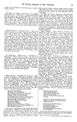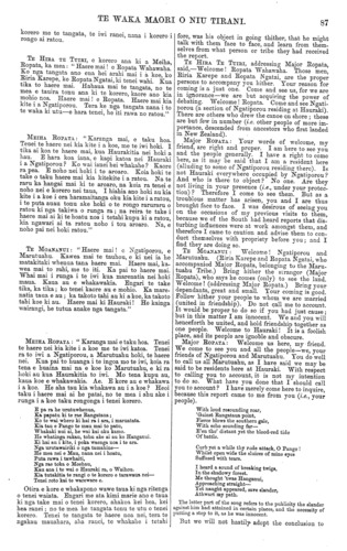 TE WAKA MAORI O NIU TIRANI. 87 korero me te tangata, te iwi ranei, nana i korero i rongo ai ratou. TE HIRA TE TUIRI, e korero ana ki a Meiha, Ropata, ka mea: " Haere mai! e Ropata Wahawaha. Ko nga tangata ano ena hei arahi mai i a koe, ko Riria Karepe, ko Ropata Ngatai, ki tenei wahi. Kua tika to haere mai. Hahaua mai te tangata, no te mea e tauira tonu ana ki te korero, kaore ano kia mohio noa. Haere mai! e Ropata. Haere mai kia kite i a Ngatiporou. Tera ke nga tangata nana i to te waka ki utu—e hara tenei, he iti rawa no ratou." MEIHA ROPATA: "Karanga mai, e taku hoa. Tenei te haere nei kia kite i a koe, me te iwi hoki. I tika ai koa te haere mai, kua Haurakitia nei hoki a hau. E hara koa iana, e kapi katoa nei Hauraki i a Ngatiporou? Ko wai ianei hei whakahe? Kaore ra pea. E noho nei hoki i to aroaro. Koia hoki te take o taku haere mai kia kitekite i a ratou. Na te raru ka hangai mai ki te aroaro, na koia ra tenei e noho nei e korero nei taua, I hiahia ano hoki au kia kite i a koe i era haramaitanga oku kia kite i a rat o u, i te puta auau tonu ake hoki o te rongo raruraru o ratou ki nga takiwa o runga ra; na reira te take i haere mai ai ki te hoatu noa i tetahi kupu ki a ratou, kia ngawari ai ta ratou noho i tou aroaro. Na, e noho pai nei hoki ratou." TE MOANANUI: " Haere mai! e Ngatiporou, e Marutuahu. Kawea mai te tauhou, e ki nei ia he matakitaki whenua tana haere mai. Haere mai, ka- wea mai to rahi, me to iti. Ka pai to haere mai. Whai mai i runga i te iwi kua marenatia nei hoki maua. Kaua au e whakawakia. Engari te take tika, ka tika; ko tenei kaore au e mohio. Ka mare- natia taua e au; ka takoto tahi au ki a koe, ka takoto tahi koe ki au. Haere mai ki Hauraki! He kainga wairangi, he tutua anake nga tangata." MEIHA ROPATA: " Karanga mai e taku hoa. Tenei te haere nei kia kite i a koe me te iwi katoa. Tenei ra to iwi a Ngatiporou, a Marutuahu hoki, te haere nei. Kua pai to huanga i te ingoa mo te iwi, koia ra tena e huaina mai na e koe ko Marutuahu, e ki ra hoki au kua Haurakitia to iwi. Mo tena kupu au, kaua koe e whakawakia. Ae. E kore au e whakawa i a koe. He aha tau kia whakawa au i a koe? Heoi taku i haere mai ai he patai, no te mea i ahu ake i runga i a koe taku rongonga i tenei korero. E pa ra he urutuwhenua, Ka papatu ki te rae Rangataua; Ko te wai whero ki hai ra i i maruatata. Kia tau e Pango te mau mai to patu, Whakaki nui ai, he wai kai aku kamo. He whatinga rakau, tohu ake ai au ko Hanganui. Ki hai au i kite, i poka waenga noa i te ara. Nga urutawairiki o nga tamahine— He mea nei e Mau, nana nei i hoatu, Puta rawa i tawhaiti, Nga rae toka o Moehau, Kau ana i te wai o Hauraki ra, o Waihou. Kia tutakitia te rangi o te korero e tarawaua nei— Tenei roto kai te wareware e. Otira e kore e whakapono wawe taua ki nga ritenga o tenei waiata. Engari me ata kimi marie ano e taua ki nga take mai o tenei korero, ahakoa kei hea, kei hea ranei; no te mea he tangata tonu te utu o tenei korero. Tenei te tangata te haere noa nei, tera te ngakau mauahara, aha ranei, te whakahe i tetahi fore, was his object in going thither, that he might talk with them face to face, and learn from them- selves from what person or tribe they had received the report. TE HIRA TE TUIRI, addressing Major Ropata, said,—Welcome! Ropata Wahawaha. Those men, Riria Karepe and Ropata Ngatai; are the proper persons to accompany you hither. Your reason for coming is a just one. Come and see us, for we are in ignorance—we are but acquiring the power of debating. Welcome! Ropata. Come and see Ngati- porou (a section of Ngatiporou residing at Hauraki). There are others who drew the canoe on shore; these are but few in number (i.e. other people of more im- portance, descended from ancestors who first landed in New Zealand). Major ROPATA: Your words of welcome, my friend, are right and proper. I am here to see you and the people generally. I have a right to come here, as it may be said that I am a resident here (alluding to some of Ngatiporou residing there). Is not Hauraki everywhere occupied by Ngatiporou? And who is there to object? No one. Are they not living in your presence (i.e., under your protec- tion)? Therefore I come to see them. But as a troublous matter has arisen, you and I are thus brought face to face. I was desirous of seeing you on the occasions of my previous visits to them, because we of the South had heard reports that dis- turbing influences were at work amongst them, and therefore I came to caution and advise them to con- duct themselves with propriety before you; and I find they are doing so. TE MOANANUI: Welcome! Ngatiporou and Marutuahu. (Riria Karepe and Ropata Ngatai, who accompanied Major Ropata, belonging tu the Maru- tuahu Tribe.) Bring hither the stranger (Major Ropata), who says he comes (only) to see the land. Welcome! (addressing Major Ropata.) Bring your dependants, great and small. Your coming is good. Follow hither your people to whom we are married (united in friendship). Do not call me to account. It would be proper to do so if you had just cause; but in this matter I am innocent. We and you will henceforth. be united, and hold friendship together as one people. Welcome to Hauraki! It is a foolish place, and its people are ignoble and obscure. Major ROPATA: Welcome us here, my friend. We come to see you and all the people—we, your friends of Ngatiporou and Marutuahu. You do well to call us all Marutuahu, as I have said we may be said to be residents here at Hauraki. With respect to calling you to account, it is not my intention to do so. What have you done that I should call you to account? I have merely come here to inquire, because this report came to me from you (i.e., your people). With loud resounding roar, 'Gainst Rangataua point, Fierce blows the southern gale, With echo sounding far— E'en tho' distant yet the blood -red tide Of battle. Curb yet a while thy rude attack, O Pango ! Whilst open wide the sluices of mine eyes Suffused with tears. I heard a sound o