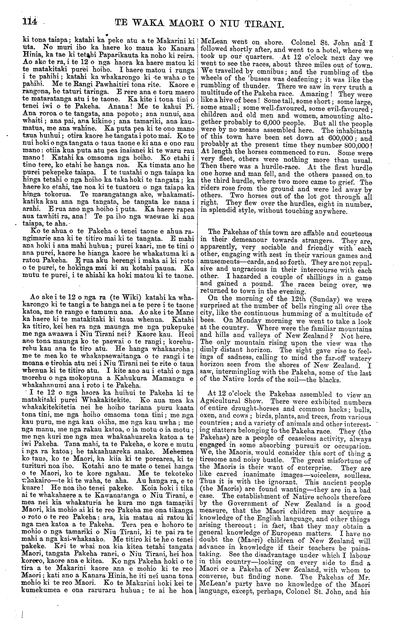 ll4 TE WAKA MAORI O NIU TIRANI. ki tona taiapa; katahi ka peke atu a te Makarini ki uta. No muri iho ka haere ko maua ko Kanara Hinia, ka tae ki tetahi Paparikauta ka noho ki reira. Ao ako te ra, i te 12 o nga haora ka haere matou ki te matakitaki purei hoiho. I haere matou i runga i te pahihi; katahi ka whakarongo ki te waha o te pahihi. Me te Rangi Pawhaitiri tona rite. Kaore e rangona, he taturi taringa. E rere ana e toru maero te mataratanga atu i te taone. Ka kite i tona tini o tenei iwi o te Pakeha. Anana! Me te kahui Pi. Ana roroa o te tangata, ana popoto; ana nunui, ana whaiti; ana pai, ana kikino; ana tamariki, ana kau- matua, me ana wahine. Ka puta pea ki te ono mano taua huihui; otira kaore he tangata i poto mai. Ko te nui hoki o nga tangata o taua taone e ki ana e ono rau mano: otiia kua puta atu pea inaianei ki te waru rau mano ! Katahi ka omaoma nga hoiho. Ko etahi i tino tere, ko etahi he hanga noa. Ka timata ano he purei pekepeke taiapa. I te tuatahi o nga taiapa ka hinga tetahi o nga hoiho ka taka hoki te tangata ; ka haere ko etahi, tae noa ki te tuatoru o nga taiapa ka hinga tokorua. Te marangatanga ake, whakamati- katika kau ana nga tangata, he tangata ke nana i arahi. E rua ano nga hoiho i puta. Ka haere rapea aua tawhiti ra, ana! Te pa iho nga waewae ki aua taiapa, te aha. Ko te ahua o te Pakeha o tenei taone e ahua ra- ngimarie ana ki te titiro mai ki te tangata. E mahi ana hoki i ana mahi huhua; purei kaari, me te tini o ana purei, kaore he hianga kaore he whakatuma ki a ratou Pakeha. E rua aku herengi i maka ai ki roto o te purei, te hokinga mai ki au kotahi pauna. Ka mutu te purei i te ahiahi ka hoki matou ki te taone. Ao ake i te 12 o nga ra (te Wiki) katahi ka wha- karongo ki te tangi a te hanga nei a te pere i te taone katoa, me te rango e tamumu ana. Ao ake i te Mane ka haere ki te matakitaki ki taua whenua. Katahi ka titiro, kei hea ra nga maunga me nga pukepuke me nga awaawa i Niu Tirani nei ; Kaore kau. Heoi ano tona maunga ko te paewai o te rangi; korehu- rehu kau ana te tiro atu. He hanga whakaaroha; me te mea ko te whakapaewaitanga o te rangi i te moana e tirohia atu nei i Niu Tirani nei te rite o taua whenua ki te titiro atu. I kite ano au i etahi o nga morehu o nga mokopuna a Kahukura Mamangu e whakahanumi ana i roto i te Pakeha. I te 12 o nga haora ka huihui te Pakeha ki te matakitaki purei Whakakitekite. Ko aua mea ka whakakitekitetia nei he hoiho tariana puru kaata tona tini, me nga hoiho omaoma tona tini; me nga kau puru, me nga kau okiha, me nga kau uwha ; me nga manu, me nga rakau katoa, o ia motu o ia motu ; me nga kuri me nga mea whakaahuareka katoa a te iwi Pakeha. Tana mahi, ta te Pakeha, e kore e mutu i nga ra katoa; he takaahuareka anake. Mehemea ko taua, ko te Maori, ka kiia ki te porearea, ki te turituri noa iho. Kotahi ano te mate o tenei hanga o te Maori, ko te kore ngahau. Me te tekoteko whakairo—te ki te waha, te aha. Au hanga ra, e te kuare! He noa iho tenei pakeke. Koia hoki i tika ai te whakahaere a te Kawanatanga o Niu Tirani, e mea nei kia whakaturia he kura mo nga tamariki Maori, kia mohio ai ki te reo Pakeha me ona tikanga o roto o te reo Pakeha; ara, kia matau ai ratou ki nga mea katoa a te Pakeha. Tera pea e hohoro te mohio o nga tamariki o Niu Tirani, ki te pai ra te mahi a nga kai-whakaako. Me titiro ki te he o tenei pakeke. Kai te whai noa kia kitea tetahi tangata Maori, tangata Pakeha ranei, o Niu Tirani, hei hoa korero, kaore ana e kitea. Ko nga Pakeha hoki o te tira a te Makarini kaore ana e mohio ki te reo Maori; kati ano a Kanara Hinia, he iti nei uana tona mohio ki te reo Maori. Ko te Makarini hoki kei te kumekumea e ona raruraru huhua; te ai he hoa McLean went on shore. Colonel St. John and I followed shortly after, and went to a hotel, where we took up our quarters. At 12 o'clock next day we went to see the races, about three miles out of town. We travelled by omnibus ; and the rumbling of the wheels of the busses was deafening; it was like the rumbling of thunder. There we saw in very truth a multitude of the Pakeha race. Amazing ! They were like a hive of bees! Some tall, some short; some large, some small; some well-favoured, some evil-favoured ; children and old men and women, amounting alto- gether probably to 6,000 people. But all the people were by no means assembled here. The inhabitants of this town have been set down at 600,000 ; and probably at the present time they number 800,000! At length the horses commenced to run. Some were very fleet, others were nothing more than usual. Then there was a hurdle-race. At the first hurdle one horse and man fell, and the others passed on to the third hurdle, where two more came to grief. The riders rose from the ground and were led away by others. Two horses out of the lot got through all right. They flew over the hurdles, eight in number, in splendid style, without touching anywhere. The Pakehas of this town are affable and courteous in their demeanour towards strangers. They are, apparently, very sociable and friendly with each other, engaging with zest in their various games and amusements—cards, and so forth. They are not repul- sive and ungracious in their intercourse with each other. I hazarded a couple of shillings in a game and gained a pound. The races being over, we returned to town in the evening. On the morning of the 12th (Sunday) we were surprised at the number of bells ringing all over the city, like the continuous humming of a multitude of bees. On Monday morning we went to take a look at the country. Where were the familiar mountains and hills and valleys of New Zealand ; Not here. The only mountain rising upon the view was the dimly distant horizon. The sight gave rise to feel- ings of sadness, calling to mind the far-off watery horizon seen from the shores of New Zealand. I saw, intermingling with the Pakeha, some of the last of the Native lords of the soil—the blacks. At 12 o'clock the Pakehas assembled to view an Agricultural Show. There 