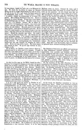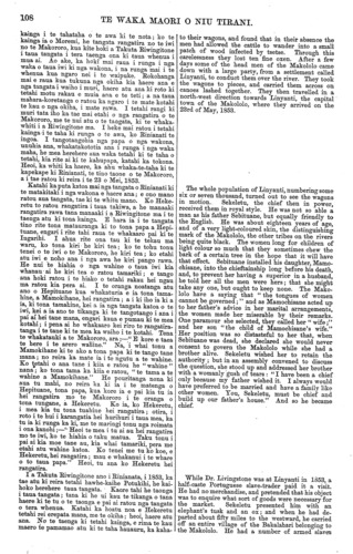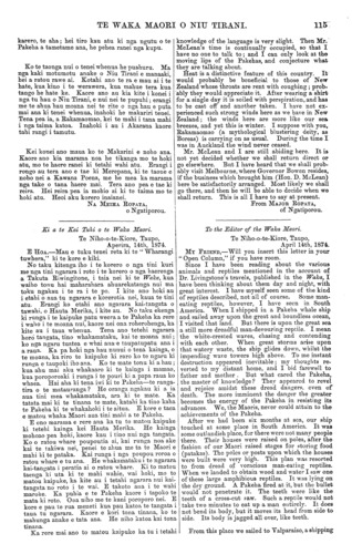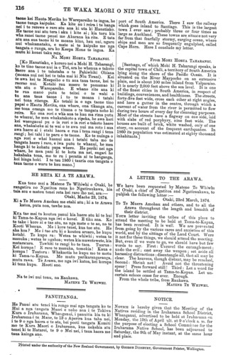 116 TE WAKA MAORI O NIU TIRANI taone kei Hauta Merika ko Warepareiho te ingoa, he taone tunga kaipuke. Ka kite au i reira i te hanga nei i te rerewe e rere atu ana ki uta ki Hanatiako. He taone nui atu tera i aku i kite ai; kia toru kia wha ranei taone penei me Akarana ka rite. E tata atu ana aua taone ki te moana kino, hau nui, ngaru nui whakamataku, e mate ai te kaipuke me nga tangata o runga, ara ko Keepa Hone te ingoa. Ka mutu ki konei taku reta. NA MOHI HORUA TAHARANGI. [Ko Hanatiako, e korero nei a Mohi H. Taharangi, ko te tino taone nui ia o Tiri, ara he whenua e takoto haere ana i te tahataha o te Pahiwhiki Ohiana (moana nui nei kei te taha mai ki Niu Tirani). Kei te awa kei te Meepoiho e tu ana taua taone, kei te raorao nui. Kotahi rau maero te pamamao ki uta atu o Warepareiho. E whano rite ana ki te rua mano putu te teitei o te wahi e tu ana taua taone i to te moana i tatahi nei tona ritenga. Ko tetahi ia o nga taone tino papai o Hauta Merika, ona whare, ona tikanga atu, me tona oranga mo te tinana o te tangata noho ki reira. Ko ona rori e wha aua te kau ma rima putu te whanui, he mea whakatakoto a ripeka, he awa keri kei waenganui pu o ia rori o ia rori e takoto haere ana, whakaheke ai te wai o te awa nui ma roto i aua awa haere ai i etahi haora e rua i tena rangi i tena rangi; hei tahi i te paru o te taone. Ko te nuinga o nga rori e whai huanui ana i tetahi taha mo te tangata haere i raro, e iwa putu te whanui, he mea hanga ki te kohatu papa whero. He periki nei nga whare, he mea pani ki te kota ma nei, engari he hakahaka tona, mo te ru i peratia ai te hanganga, koi hinga hoki. I te tau 1860 i tauria ona tangata o taua taone e waru te kau mano.] HE RETA KI A TE ARAWA. Kua tono mai a Matene Te Wihiwhi o Otaki, he rangatira no Ngatitoa raua ko Ngatiraukawa, kia taia atu e matou tenei reta kei raro iho nei, ara:— Otaki, Maehe 23,1874. Ki a Te Muera Amohau me etahi atu; ki a te Arawa katoa, puta noa, tawhe noa. KUA tae mai ta koutou panui kia haere atu ki te hui ki Tama-te-Kapua nga iwi o konei. E tika ana. Ko te take i kore ai e tae atu, na nga mate o te ao, na te Kooti Whenua. Me i kore tenei, kua tae atu. He aha koa ? Me i tae atu ki o koutou aroaro, he kupu kotahi. Te kupu ra: Wetea te whiwhi; wetea te manuka ; wetea te ngahoa; wetea kia mawetewete, kia mataratara. Tawhiti te rangi ko te taea. Tuarua : Kei korapa ! E rere te manuka, tomokia! Kaua e korapa ! Tuatoru : Whakaotia he kupu mo te motu ki Tama-te-Kapua. Me mutu parikarangaranga, mutu rawa. Te A rawa, me nga iwi katoa, kei korapa ki tena kupu. Heoti ano. Na te iwi nui tonu, na Raukawa. MATENE TE WHIWHI. PANUITANGA He Panui atu tenei kia rongo mai nga, tangata ko te Hui a nga tangata Maori e noho ana i te Takiwa Kura o Iruharama, Whanganui, i panuitia kia tu ki Iruharama i te, Mane, te 13 o Aperira kua taha nei, i te 9 o nga haora o te ata, hei pooti tangata Komiti mo te Kura Maori o Iruharama, kua nekehia atu tenei ki te Hatarei, te 9 o Mei nei, i taua haora me taua kainga ano. port of South America. There I saw the railway which goes inland to Santiago. This is the largest town I ever saw; probably three or four times as large as Auckland. These towns are situate not very far from that fearfully stormy, surging ocean, where ships and men are so frequently engulfed, called Cape Horn. Here I conclude my letter. From MOHI HORUA. TAHARANGI. [Santiago, of which Mohi H. Taharangi speaks, is the capital town of Chili, a territory of South America lying along the shore of the Pacific Ocean. It is situated on the River Maypocho on an extensive plain, and is about 100 miles inland from Valparaiso. It is nearly 2,000 feet above the sea level. It is one of the finest cities in South America, in respect of buildings, conveniences, and healthiness. The streets, forty-five feet wide, cross each other at right angles, and have a gutter in the centre, through which a current of water from the river is permitted to flow during two hours of every day for cleansing purposes. Most of the streets have a flagway on one side, laid with slabs of red porphyry, nine feet wide. The houses are built of brick, white washed, only of one story, on account of the frequent earthquakes. In 1860 its population was estimated at eighty thousand inhabitants.] A LETTER TO THE ARAWA. We have been requested by Matene Te Whiwhi of Otaki, a chief of Ngatitoa and Ngatiraukawa, to publish the following letter :— Otaki, 23rd March, 1874. To Te Muera Amohau and others, and to all the Arawa throughout the length and breadth of their district. YOUR letter inviting the tribes of this place to attend the meeting to be held at Tama-te-Kapua, has been received. It is well. We are prevented from going by the various cares and anxieties of this world, and by the sittings of the Land Court. Were it not for these things, we should attend the meeting. But, even if we were to go, we should have but few words to say. First: Unravel the entanglement; undo the evil; cast away the weapon ; act aside all harassing distractions ; disentangle all, that all may bo clear. The heavens, though distant, may be reached, Second : Shrink not! Avoid not the threatening spear ! Press forward still! Third : Let a word for the island be settled at Tama-te-Kapua. Let un- certain echoes cease for ever. Enough. From the whole tribe, from Raukawa. MATENE TE WHIWHI. NOTICE. NOTICE is hereby given that the Meeting of the Natives residing in the Iruharama School District, Whanganui, advertised to be held at Iruharama on Monday, the 13th of April ult. at 9 o'clock a. m. for the purpose of electing a School Committee for the Iruharama Native School, has been adjourned to Saturday, the 9th of May instant, at the same hour and place. Printed under the authority of the New Zealand Government, by GEORGE DIDSBURY, Government Printer, Wellington.