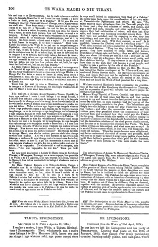 106 TE WAKA MAORI O NIU TIRANI. kia mai ana e te Kawanatanga. Ko te wahi whenua e mahia ana e te tangata Maori he iti nei i roto i te tau kotahi ; e kore e kaha te mahi, pera me ta te Pakeha." E ki ana kia ata whakaaro ona iwi i Taranaki ki enei tikanga, ara a Ngatiruanui me etahi atu. Tana kupu tenei:—" Heoi nga iwi nui te taonga i mua ai ko nga iwi o Taranaki; he nui te kau, te hoiho, te poaka; he kaata a ratou, he parau, he aha noa atu; he maara witi a ratou, he mira huri paraoa, kua nui haere te moni a te tangata. Ki hai i ngata, na te mahi whakararu ki te pakanga kua hoki ratou ki te timatanga whakatuputupu mai ai i te taonga. Ka tupu ranei ; e kore ranei e tupu ? No te mea kei te hoki haere te tangata ki te kore i naianei." Heoi tena. Katahi ka korero a Te Wehi ki te pai me te rangatiratanga o Ngaitahu. Ana kupu :—Ka, nui te kaha ki nga mahi katoa, ka nui te hipi, te kau, te hoiho ; ka nui te witi, te oti, te paare; ka nui te mohio o taua iwi ki te kokoti hipi, ka taea te 120 hipi ma te tangata i te ra kotahi; kaore hoki ratou e kai ana i te rama; he iwi pai rawa ratou, me nga wahine, pai katoa, ataahua ana, me nga tamariki ka nui te ora. Kia penei tonu te pai i roto i nga tau katoa me nga tau kua pahure ake nei, heoi, ka tupu tenei iwi hei iwi nui, hei hoa mo nga Pakeha." Ko Hare Takerei Kapara e whakaatu mai ana i te taenga atu a te Kerehi ki nga hoia Maori i te Niho-o-te-Kiore karakia ai. He nui tona whakapai ki tenei, a e mea ana ia ki nga Minita o te Rongo Pai kia kaua e mutu te haere ki reira, kaua ratou e whakarerea a mua ake nei, no te mea kua kore noa atu e kau- whautia ki a ratou nga Kupu o te Atua, i te takiwa i mua atu o te Kerehi na. Tenei kua tae mai te reta a Hamiora, he whakapai ki te taenga o te Kawana ki Tauranga, me ana kupu whakaaroha ki nga iwi Maori e noho ana i taua takiwa. E ki mai ana a Henare Kingi Tipuaki o Torere, Opotiki, ka toru nga wahine i mate i taua kainga i te rangi kotahi, i & Maehe kua taha nei ; a he ana te manawa i te nui o te tangata haere mai ki te uhunga, ara ki te tangi, he ra he whakaeke he ra he whakaeke, nawai a mimiti ana te kai, mimiti ana te poaka, me nga kai katoa. Noho nui ana nga ingoa o nga tangata whenua i roto i nga pukapuka nama a nga Pakeha mo te waipiro ma nga tangihanga; a no te mutunga o nga tangihanga, no te haerenga o nga tangata, katahi ka rapu nga whakaaro ki te paunga o ana kai, ki te mea hoki hei whakarite i nga waipiro a te Pakeha. E mea ana a Henare he tika kia whakamutua rawatia tenei hanga te haere nui mai o te tangata ki te tangihanga, ko nga tangata tino whanaunga o te tupapaku anake e haere mai; a e mea ana ia kia puta i roto i te Waka he kupu whakahe ma matou ki taua tikanga. Kua korero ano matou i mua ki te he o taua mea, a kia pehea atu he kupu ma matou inaianei ? He ritenga tawhito ia na nga Maori, mea ake ka mahue, pera me etahi atu ritenga tawhito kua mahue. A te wa e tino marama ai nga iwi ki nga tikanga, e mohio ai ki nga tikanga nui o te moni raua ko te kai, hei reira ratou te kore ai e pai kia maumautia a ratou mea ki nga tangata whakaaro nui ki te kai mo a ratou puku, nui atu i te aroha ki te tupapaku. Te whakatauki a aua tu tangata, koia tenei;—"He nui tupapaku, he nui kai." Tana pai hoki tena. Ko nga moni kua homai e Apiata Te Hame raua ko Kerehona Piwaka, o Whangara, Turanga, mo a raua nupepa, kua panuitia i te Waka o te 7 o Aperira, a ko nga nupepa ki a raua, timata i te Nama 5, kua tukua mariretia ki te kainga i whakaatu mai ai e te Warahi. Ko Hare Takerei Kapara o te Niho-o-te-Kiore, Taupo, e whakahe ana ki te tikanga e moe nei nga wahine Maori i te Pakeha. E whakaaroaro aua ia na nga matua, na o ratou tamahine ranei, te he; otira ki tana i mohio ai na nga matua te tino he. E ki ana ia e hara ta te Pakeha i te tohe hai wahine tuturu mana; he mau noa tana i te wahine a he mahue te mutunga. Ahakoa kua whanau he tamariki, ka mahue ano ratou tahi ko te whaea. Tana e tino whakahe ana ko te tikanga e tuku nei i nga wahine kaore ano kia pakeke kia moea ana e te Pakeha, e ki ana he mahi he rawa tenei na nga matua me te Pakeha ano hoki. Ko te utu mo te Waka Maori i te tau ko te 10s., he mea utu lei mua. Ka tukuna atu i te meera ki te tangata e hiahia ana me ka tukua mai e ia aua moni ki te Kai Tuhi ki Po Neke nei. TAKUTA RIWINGITONE. (He Toanga no te Waka o Aperira 21, 1874.) I waiho e matou, i tera Waka, a Takuta Riwingi- tone i Pamanguato. Heoi, whakarerea ana e ratou taua kainga i te 28 o Hanuere 1853, haere atu ana na runga i nga whenua raki, nga parae onepu wera is very small indeed in comparison with that of a Pakeha.' He urges these facts upon the consideration of his own tribe at Taranaki—the Ngatiruanui and. others. He says, "No tribes enjoyed more advantages than the Taranaki people did in times past ; they had numbers of cattle, and horses, and pigs ; they had carts, ploughs, and other agricultural imple- ments ; they had cultivations of wheat, and they had flour mills, and money was becoming abundant among them. But they were not satisfied, and, by engaging in war, they lost everything ; and now they have to go back to the beginning and make a fresh start. Will they succeed, or not ? It is doubtful, because the (Native) race is dwindling away." Te Wehi then launches out into a panegyric on the Ngaitahu, the South Island Natives. " They are very industrious and pros- perous; they have numbers of sheep, cattle, and horses; abundance of wheat, oats, and barley ; they are skilful shearers, they can shear 120 sheep per man in a day ; and they do not drink rum; they are a fine race ; their women are all pretty, and their children healthy. If they advance in the future as they have done in the past, they will become a great people, and worthy to take a position by the side of the Pakehas." Hare Takerei Kapara informs us that the Rev. Mr. Grace has visited the Native contingent at Te Niho-o-te-Kiore, and conducted Divine Service there. He expresses his pleasure at this, and hopes they may n