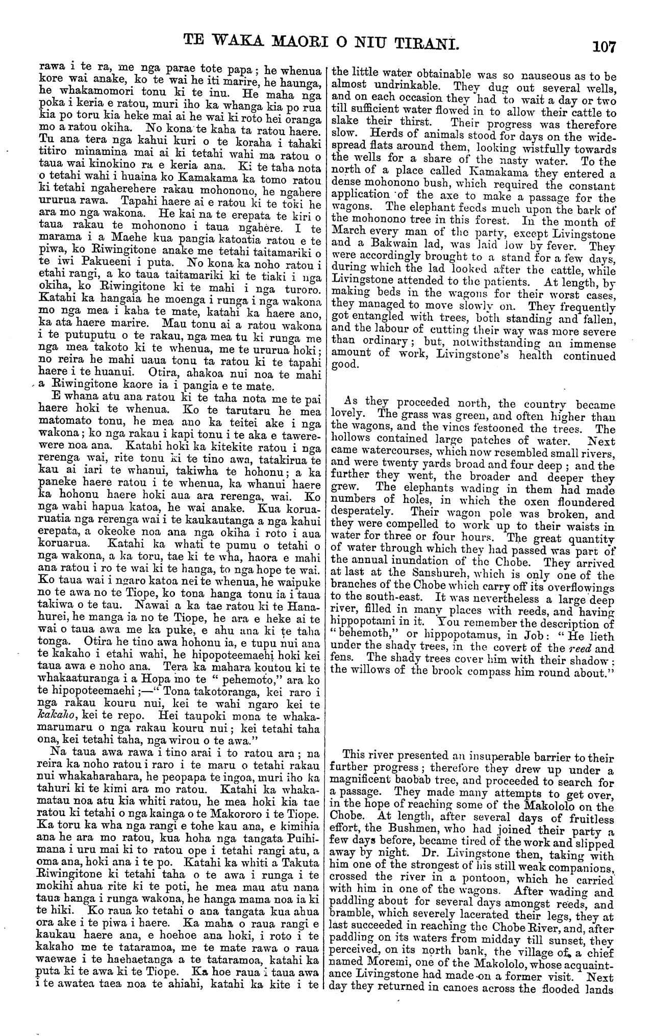 TE WAKA MAORI O NIU TIRANI. 107 rawa i te ra, me nga parae tote papa; he whenua kore wai anake, ko te wai he iti marire, he haunga, he whakamomori tonu ki te inu. He maha nga poka i keria e ratou, muri iho ka whanga kia po rua kia po toru kia heke mai ai he wai ki roto hei oranga mo a ratou okiha. No kona te kaha ta ratou haere. Tu ana tera nga kahui kuri o te koraha i tahaki titiro minamina mai ai ki tetahi wahi ma ratou o taua wai kinokino ra e keria ana. Ki te taha nota o tetahi wahi i huaina ko Kamakama ka tomo rato u ki tetahi ngaherehere rakau mohonono, he ngahere ururua rawa. Tapahi haere ai e ratou ki te toki he ara mo nga wakona. He kai na te erepata te kiri o taua rakau te mohonono i taua ngahere. I te marama i a Maehe kua pangia katoatia ratou e te piwa, ko Riwingitone anake me tetahi taitamariki o te iwi Pakueeni i puta. No kona ka noho ratou i etahi rangi, a ko taua taitamariki ki te tiaki i nga okiha, ko Riwingitone ki te mahi i nga turoro. Katahi ka hangaia he moenga i runga i nga wakona mo nga mea i kaha te mate, katahi ka haere ano, ka ata haere marire. Mau tonu ai a ratou wakona i te putuputu o te rakau, nga mea tu ki runga me nga mea takoto ki te whenua, me te ururua hoki; no reira he mahi uaua tonu ta ratou ki te tapahi haere i te huanui. O tira, ahakoa nui noa te mahi .. a Riwingitone kaore ia i pangia e te mate. E whana atu aua ratou ki te taha nota me te pai haere hoki te whenua. Ko te tarutaru he mea matomato tonu, he mea ano ka teitei ake i nga wakona; ko nga rakau i kapi tonu i te aka e tawere- were noa ana. Katahi hoki ka kitekite ratou i nga rerenga wai, rite tonu ki te tino awa, tatakirua te kau ai iari te whanui, takiwha te hohonu; a ka paneke haere ratou i te whenua, ka whanui haere ka hohonu haere hoki aua ara rerenga, wai. Ko nga wahi hapua katoa, he wai anake. Kua korua- ruatia nga rerenga wai i te kaukautanga a nga kahui erepata, a okeoke noa ana nga okiha i roto i aua koruarua. Katahi ka whati te pumu o tetahi o nga wakona, a ka toru, tae ki te wha, haora e mahi ana ratou i ro te wai ki te hanga, to nga hope te wai. Ko taua wai i ngaro katoa nei te whenua, he waipuke no te awa no te Tiope, ko tona hanga tonu ia i taua takiwa o te tau. Nawai a ka tae ratou ki te Hana- hurei, he manga ia no te Tiope, he ara e heke ai te wai o taua awa me ka puke, e ahu ana ki te taha tonga. Otira he tino awa hohonu ia, e tupu nui ana te kakaho i etahi wahi, he hipopoteemaehi hoki kei taua awa e noho ana. Tera ka mahara koutou ki te whakaaturanga i a Hopa ino te " pehemoto," ara ko te hipopoteemaehi;—" Tona takotoranga, kei raro i nga rakau kouru nui, kei te wahi ngaro kei te kakaho, kei te repo. Hei taupoki mona te whaka- marumaru o nga rakau kouru nui; kei tetahi taha ona, kei tetahi taha, nga wirou o te awa." Na taua awa rawa i tino arai i to ratou ara na reira ka noho ratou i raro i te maru o tetahi rakau nui whakaharahara, he peopapa te ingoa, muri iho ka tahuri ki te kimi ara mo ratou. Katahi ka whaka- matau noa atu kia whiti ratou, he mea hoki kia tae ratou ki tetahi o nga kainga o te Makororo i te Tiope. Ka toru ka wha nga rangi e tohe kau ana, e kimihia ana he ara mo ratou, kua hoha nga tangata Puihi- mana i uru mai ki to ratou ope i tetahi rangi atu, a oma ana, hoki ana i te po. Katahi ka whiti a Takuta Riwingitone ki tetahi taha o te awa i runga i te mokihi ahua rite ki te poti, he mea mau atu nana taua hanga i runga wakona, he hanga mama noa ia ki te hiki. Ko raua ko tetahi o ana tangata kua ahua ora ake i te piwa i haere. Ka maha o raua rangi e kaukau haere ana, e hoehoe ana hoki, i roto i te kakaho me te tataramoa, me te mate rawa o raua waewae i te haehaetanga a te tataramoa, katahi ka puta ki te awa ki te Tiope. Ka hoe raua i taua awa i te awatea taea noa te ahiahi, katahi ka kite i te the little water obtainable was so nauseous as to be almost undrinkable. They dug out several wells, and on each occasion they had to wait a day or two till sufficient water flowed in to allow their cattle to slake their thirst. The ir progress was therefore slow. Herds of animals stood for days on the wide- spread flats around them, looking wistfully towards the wells for a share of the nasty water. To the north of a place called Kamakama they entered a dense mohonono bush, which required the constant application of the axe to make a passage for the wagons. The elephant feeds much upon the bark of the mohonono tree in this forest. In the mouth of March every man of the party, except Livingstone and a Bakwain lad, was laid low by fever. They were accordingly brought to a stand for a few days, during which the lad looked after the cattle, while Livingstone attended to the patients. At length, by making beds in the wagons for their worst cases, they managed to move slowly on. They frequently got entangled with trees, both standing and fallen, and the labour of cutting their way was more severe than ordinary; but, notwithstanding an immense amount of work, Livingstone's health continued good. As they proceeded north, the country became lovely. The grass was green, and often higher than the wagons, and the vines festooned the trees. The hollows contained large patches of water. Next came watercourses, which now resembled small rivers, and were twenty yards broad and four deep ; and the further they went, the broader and deeper they grew. The elephants wading in them had made numbers of holes, in which the oxen floundered desperately. Their wagon pole was broken, and they were compelled to work up to their waists in water for three or four hours. The great quantity of water through which they had passed was part of the annual inundation of the Chobe. They arrived at last at the Sanshureh, which is only one of the branches of the Chobe which carry off its overflowings to the south-east. It was nevertheless a large deep river, filled in many places with reeds, and having hippopotami in it. You remember the description of " behemoth," or hippopotamus, in Job : " He lieth under the