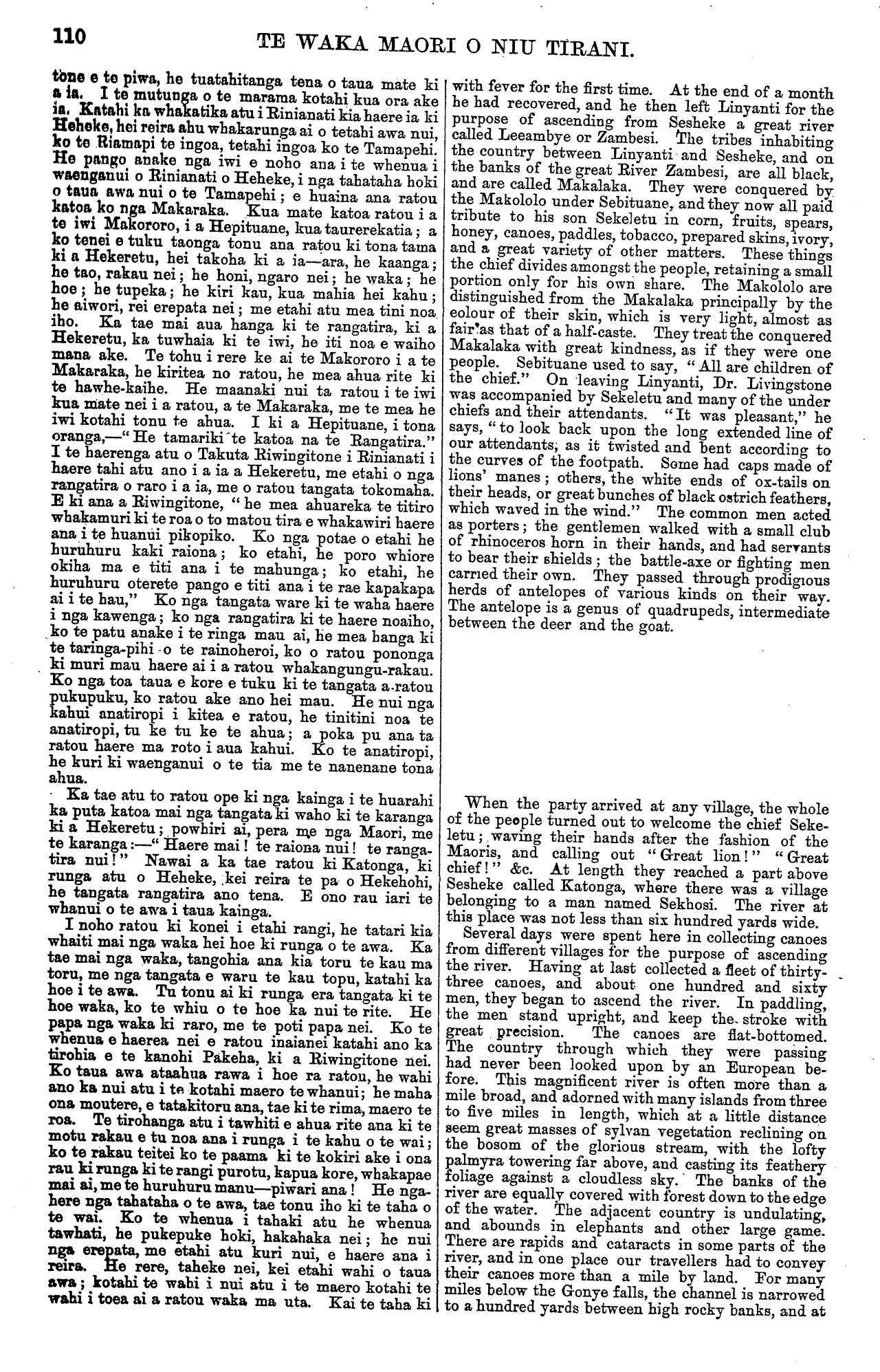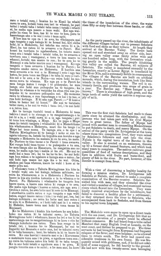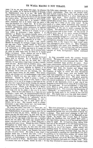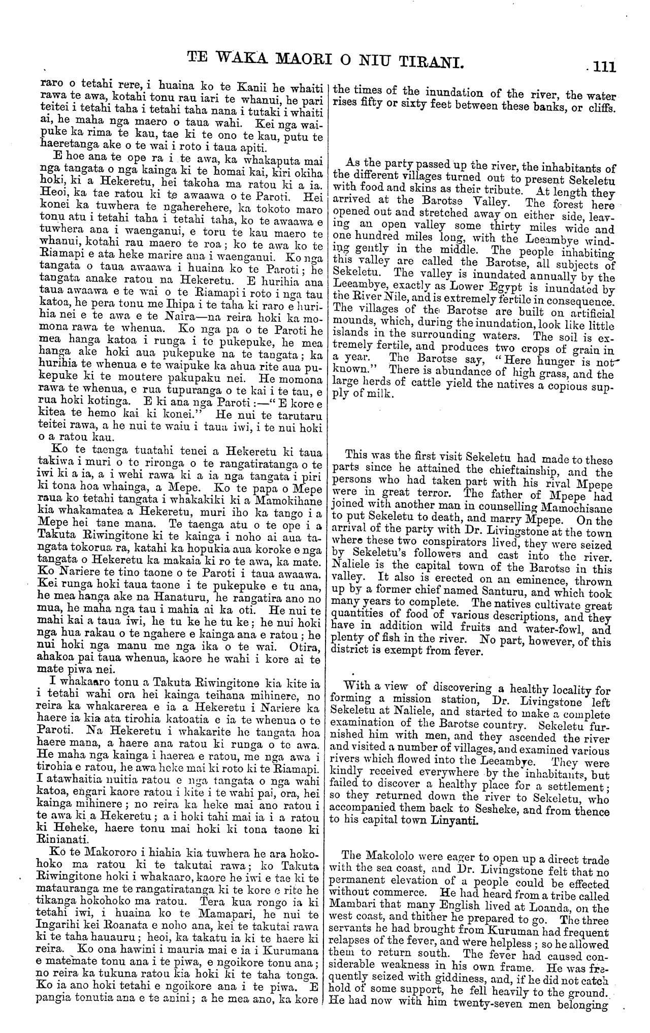TE WAKA MAORI O NIU TIRANI. .111 raro o tetahi rere, i huaina ko te Kanii he whaiti rawa te awa, kotahi tonu rau iari te whanui, he pari teitei i tetahi taha i tetahi taha nana i tutaki i whaiti ai, he maha nga maero o taua wahi. Kei nga wai- puke ka rima te kau, tae ki te ono te kau, putu te haeretanga ake o te wai i roto i taua apiti. E hoe ana te ope ra i te awa, ka whakaputa mai nga tangata o nga kainga ki te homai kai, kiri okiha hoki, ki a Hekeretu, hei takoha ma ratou ki a ia. Heoi, ka tae ratou ki t.e awaawa o te Paroti. Hei konei ka tuwhera te ngaherehere, ka tokoto maro tonu atu i tetahi taha i tetahi taha, ko te awaawa e tuwhera ana i waenganui, e toru te kau maero te whanui, kotahi rau maero te roa; ko te awa ko te Riamapi e ata heke marire ana i waenganui. Ko nga tangata o taua awaawa i huaina ko te Paroti; he tangata anake ratou na Hekeretu. E hurihia ana taua awaawa e te wai o te Riamapi i roto i nga tau katoa, he pera tonu me Ihipa i te taha ki raro e huri- hia nei e te awa e te Naira—na reira hoki ka mo- mona rawa te whenua. Ko nga pa o te Paroti he mea hanga katoa i runga i to pukepuke, he mea hanga ake hoki aua pukepuke na te tangata; ka hurihia te whenua e te waipuke ka ahua rite aua pu- kepuke ki te moutere pakupaku nei. He momona rawa te whenua, e rua tupuranga o te kai i te tau, e rua hoki kotinga. E ki ana nga Paroti:—" E kore e kitea te hemo kai ki konei." He nui te tarutaru teitei rawa, a he nui te waiu i taua iwi, i te nui hoki o a ratou kau. Ko te taenga tuatahi tenei a Hekeretu ki taua takiwa i muri o to rironga o te rangatiratanga o te iwi ki a ia, a i wehi rawa ki a ia nga tangata i piri ki tona hoa whainga, a Mepe. Ko te papa o Mepe raua ko tetahi tangata i whakakiki ki a Mamokihane kia whakamatea a Hekeretu, muri iho ka tango i a Mepe hei tane mana. Te taenga atu o te ope i a Takuta Riwingitone ki te kainga i noho ai aua ta- ngata tokorua ra, katahi ka hopukia aua koroke e nga tangata o Hekeretu ka makaia ki ro te awa, ka mate. Ko Nariere te tino taone o te Paroti i taua awaawa. Kei runga hoki taua taone i te pukepuke e tu ana, he mea hanga ake na Hanaturu, he rangatira ano no mua, he maha nga tau i mahia ai ka oti. He nui te mahi kai a taua iwi, he tu ke he tu ke; he nui hoki nga hua rakau o te ngahere e kainga ana e ratou ; he nui hoki nga manu me nga ika o te wai. Otira, ahakoa pai taua whenua, kaore he wahi i kore ai te mate piwa nei. I whakaaro tonu a Takuta Riwingitone kia kite ia i tetahi wahi ora hei kainga teihana mihinere, no reira ka whakarerea e ia a Hekeretu i Nariere ka haere ia kia ata tirohia katoatia e ia te whenua o te Paroti. Na Hekeretu i whakarite ho tangata hoa haere mana, a haere ana ratou ki runga o to awa. He maha nga kainga i haerea e ratou, me nga awa i tirohia e ratou, he awa heke mai ki roto ki te Riamapi. I atawhaitia nuitia rato u e nga tangata o nga wahi katoa, engari kaore ratou i kite i te wahi pai, ora, hei kainga mihinere ; no reira ka heke mai ano ratou i te awa ki a Hekeretu; a i hoki tahi mai ia i a ratou ki Heheke, haere tonu mai hoki ki tona taone ki Rinianati. Ko te Makororo i hiahia kia tuwhera he ara hoko- hoko ma ratou ki te takutai rawa; ko Takuta Riwingitone hoki i whakaaro, kaore he iwi e tae ki te matauranga me te rangatiratanga ki te kore e rite he tikanga hokohoko ma ratou. Tera kua rongo ia ki tetahi iwi, i huaina ko te Mamapari, he nui te Ingarihi kei Roanata e noho ana, kei te takutai rawa ki te taha hauauru; heoi, ka takatu ia ki te haere ki reira. Ko ona hawini i mauria mai e ia i Kurumana e matemate tonu ana i te piwa, e ngoikore tonu ana; no reira ka tukuna rato u kia hoki ki te taha tonga. Ko ia ano hoki tetahi e ngoikore ana i te piwa. E pangia tonutia ana e te anini; a he mea ano, ka kore the times of the inundation of the river, the water rises fifty or sixty feet between these banks, or cliffs. As the party passed up the river, the inhabitants of the different villages turned out to present Sekeletu with food and skins as their tribute. At length they arrived at the Barotse Valley. The forest here opened out and stretched away on either side, leav- ing an open valley some thirty miles wide and one hundred miles long, with the Leeambye wind- ing gently in the middle. The people inhabiting this valley are called the Barotse, all subjects of Sekeletu. The valley is inundated annually by the Leeambye, exactly as Lovver Egypt is inundated by the River Nile, and is extremely fertile in consequence. The villages of the Barotse are built on artificial mounds, which, during the inundation, look like little islands in the surrounding waters. The soil is ex- tremely fertile, and produces two crops of grain in a year. The Barotse say, " Here hunger is not" known." There is abundance of high grass, and the large herds of cattle yield the natives a copious sup- ply of milk. This was the first visit Sekeletu had made to these parts since he attained the chieftainship, and the persons who had taken part with his rival Mpepe were in great terror. The father of Mpepe had joined with another man in counselling Mamochisane to put Sekeletu to death, and marry Mpepe. On the arrival of the party with Dr. Livingstone at the town where these two conspirators lived, they were seized by Sekeletu's followers and cast into the river. Naliele is the capital town of the Barotse in this valley. It also is erected on an eminence, thrown up by a former chief named Santuru, and which took many years to complete. The natives cultivate great quantities of food of various descriptions, and they have in addition wild fruits and water-fowl, and plenty of fish in the river. No part, however, of this district is exempt from fever. With a view of discovering a healthy locality for forming a mission station, Dr. Livingstone left Sekeletu at Naliele, and started to make a complete examination of the Barotse country. Sekeletu fur- nished him with men, and they ascended the river and visited a number of villages, and examined various r