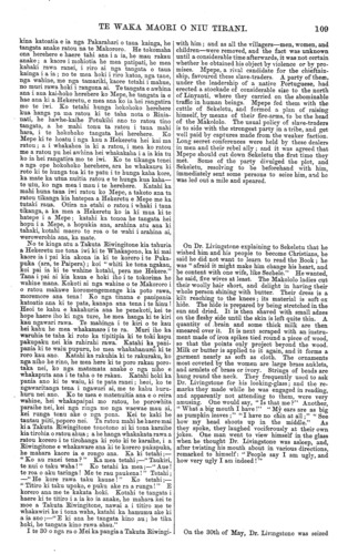 TE WAKA MAORI O NIU TIRANI. 109 kina katoatia e ia nga Pakarahari o taua kainga, he tangata anake ratou na te Makororo. He tokomaha ona herehere e haere tahi ana i a ia, he mau rakau anake ; a kaore i mohiotia he mea patipati, he mea kahaki rawa ranei, i riro ai nga tangata o taua kainga i a ia ; no te mea hoki i riro katoa, nga tane, nga wahine, me nga tamariki, kaore tetahi i mahue, no muri rawa hoki i rangona ai. Te tangata e awhina ana i aua kai-hoko herehere ko Mepe, he tangata ia e hae ana ki a Hekeretu, e mea ana ko ia hei rangatira mo te iwi. Ko tetahi hunga hokohoko herehere kua hanga pa ma ratou ki te taha nota o Rinia- nati, he hawhe-kaihe Potukihi ano to ratou tino tangata, a he mahi tonu ta ratou i taua mahi hara, i te hokohoko tangata hei herehere. Ko Mepe ki te hoatu i nga kau a Hekeretu hei kai ma ratou; a i whakahoa ia ki a ratou, i mea ko ratou me a ratou pu hei awhina hei whakakaha i a ia kia tu ko ia hei rangatira mo te iwi. Ko te tikanga tenei a nga ope hokohoko herehere, ara he whakauru ki roto ki te hunga toa ki te patu i te hunga kaha kore, ka mate ka utua nuitia ratou e te hunga kua kaha— te utu, ko nga mea i mau i te herehere. Katahi ka mahi huna taua iwi ratou ko Mepe, a takoto ana ta ratou tikanga kia hatepea a Hekeretu e Mepe me ka tutaki raua. O tira na etahi o rato u i whaki i taua tikanga, a ka mea a Hekeretu ko ia ki mua ki te hatepe i a Mepe; katahi ka tonoa he tangata hei hopu i a Mepe, a hopukia ana, arahina atu ana ki tahaki, kotahi maero te roa o te wahi i arahina ai, werowerohia ana, ka mate. No te kinga atu a Takuta Riwingitone kia tahuna a Hekeretu me tona iwi ki te Whakapono, ka ki mai kaore ia i pai kia akona ia ki te korero i te Puka- puka (ara, te Paipera) ; koi " whiti ke tona ngakau, koi pai ia ki te wahine kotahi, pera me Hekere." Tana i pai ai kia kaua e hoki iho i te tokorima he wahine mana. Kokoti ai nga wahine o te Makororo i o ratou makawe koromengemenge kia poto rawa, moremore ana tena! Ko nga tinana e panipania katoatia ana ki te pata, kanapa ana tena i te hinu ! Heoi te kahu e kakahuria ana he penekoti, kei te hope haere iho ki nga ture, he mea hanga ki te kiri kau ngawari rawa. Te mahinga i te kiri o te kau hei kahu he mea whakamaro i te ra. Muri iho ka waruhia te taha ki roto ka tipitipia ki te toki kapu pakupaku nei kia rahirahi rawa. Katahi ka pani- pama ki te waiu pupuru, he mea whakahanumi ki te roro kau ano. Katahi ka rakuhia ki te rakuraku, ko nga niho he rino, he mea here ki te poro rakau poro- taka nei, ko nga matamata anake o nga niho e whakaputa ana i te taha o te rakau. Katahi hoki ka pama ano ki te waiu, ki te pata ranei; heoi, ko te ngawaritanga tena i ngawari ai, me te kahu huru- huru nei ano. Ko te mea e matenuitia ana e o reira wahine, hei whakapaipai mo ratou, he porowhita paraihe nei, kei nga ringa me nga waewae mau ai, kei runga tonu ake o nga pona. Kei te kaki he tautau puti, poporo nei. Ta ratou mahi he haere mai ki a Takuta Riwingitone tonotono ai ki tona karaihe kia tiro hia o ratou ahua; a he hanga whakakata rawa a ratou korero i te tirohanga ki roto ki te karaihe, i a Riwingitone e whakaware ana ki te korero pukapuka, he mahara kaore ia e rongo ana. Ka ki tetahi;— "Ko au ranei tena?" Ka mea tetahi;—"Taukiri, te nui o taku waha! " Ko tetahi ka mea;—" Aue! te roa o aku taringa! Me te rau paukena! " Tetahi; —" He kore rawa taku kaua.e ! " Ko tetahi;— " Titiro ki taku upoko, e puku ake ra a runga! " E korero ana me te kakata hoki. Kotahi te tangata i haere ki te titiro i a ia ko ia anake, he mahara kei te moe a Takuta Riwingitone, nawai a i titiro me te whakawiri ke i tona waha, katahi ka hamumu ake ki a ia ano;—" E ki ana he tangata kino au; he tika hoki, he tangata kino rawa ahau." I te 30 o nga ru. o Mei ka pangia a Takuta Riwingi- with him; and as all the villagers—men, women, and children—were removed, and the fact was unknown until a considerable time afterwards, it was not certain whether he obtained his object by violence or by pro- mises. Mpepe, a rival candidate for the chieftain- ship, favoured these slave-traders. A party of them, under the leadership of a native Portuguese, had erected a stockade of considerable size to the north of Linyanti, where they carried on the abominable traffic in human beings. Mpepe fed them with the cattle of Sekeletu, and formed a plan of raising; himself, by means of their fire-arms, to be the head of the Makololo. The usual policy of slave-traders is to side with the strongest party in a tribe, and get well paid by captures made from the weaker faction. Long secret conferences were held by these dealers in men and their rebel ally ; and it was agreed that Mpepe should cut down Sekeletu the first time they met. Some of the party divulged the plot, and Sekeletu, resolving to be beforehand with him, immediately sent some persons to seize him, and he was led out a mile and speared. On Dr. Livingstone explaining to Sekeletu that he wished him and his people to become Christians, he said he did not want to learn to read the Book ; he was " afraid it might make him change his heart, and be content with one wife, like Sechele." He wanted, he said, five wives at least. The Makololo ladies cut their woolly hair short, and delight in having their whole person shining with butter. Their dress is a kilt reaching to the knees ; its material is soft ox hide. The hide is prepared by being stretched the sun and dried. It is then shaved with small adzes on the fleshy side until the skin is left quite thin. A quantity of brain and some thick milk are then smeared over it. It is next scraped with an instru- ment made of iron spikes tied round a piece of wood, so that the points only project beyond the wood. Milk or butter is applied to it again, and it forms a garment nearly as soft as cloth. The ornaments most coveted by the women are large brass anklets, and armlets of brass or ivory. Strings of beads are hung round the neck. They frequently used to ask Dr. Livingsto