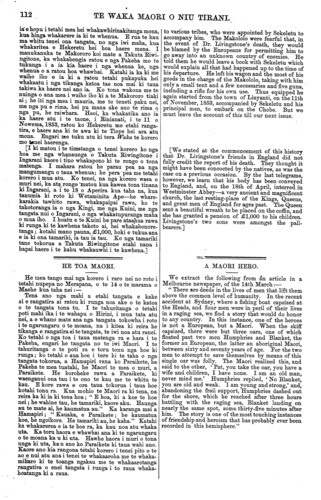 112 TE WAKA MAORI O NIU TIRANI. ia e hopu i tetahi mea hei whakawhirinakitanga mona, kua hinga whakarere ia ki te whenua. E rua te kau ma whitu tenei ona tangata, no nga iwi maha, kua whakaritea e Hekeretu hei hoa haere mona. I manukanuka te Makororo koi mate a Takuta Riwi- ngitone, ka whakahengia ratou e nga Pakeha mo te tukunga i a ia kia haere i nga whenua ke, nga whenua o a, ratou hoa whawhai. Katahi ia ka ki me waiho iho ' e ia ki a ratou tetahi pukapuka hei whakaatu i nga tikanga katoa tae noa mai ki taua takiwa ka haere nei ano ia. Ko tona wakona me te nuinga o ana mea i waiho iho ki a te Makororo tiaki ai; he iti nga mea i mauria, me te teneti paku nei, me nga pu e rima, hei pu mana ake ano te rima o nga pu, he raiwhara. Heoi, ka whakatika ano ia ka haere atu i te taone, i Rinianati, i te 11 o Nowema, 1853, ratou ko Hekeretu me etahi ranga- tira, e haere ana ki te awa ki te Tiope hei ara atu mona. Engari me tuku atu ki tera Waka te korero mo tenei haerenga. [I ki matou i te timatanga o tenei korero ko nga hoa me nga whanaunga o Takuta Riwingitone i Ingarani kaore i tino whakapono ki te rongo o tona matenga. I mahara ratou he parau pea na nga mangumangu o taua whenua; he pera pea me tetahi korero i mua atu. Ko tenei, na nga korero waea o muri nei, ka ata rongo 'matou kua kawea tona tinana ki Ingarani, a i te 18 o Aperira kua taha na, kua tanumia ki roto ki Wetaminita Ape—he whare- karakia tawhito rawa, whakapaipai rawa, ko te takotoranga ia o nga Kingi, me nga Kuini, me nga tangata nui o Ingarani, o nga whakatupuranga maha o mua iho. I hoatu e te Kuini he pare ataahua rawa ki runga ki te kawhena takoto ai, hei whakahonore- kotahi mano pauna, £1,000, hoki e tukua ana e ia ki ona tamariki, ia tau ia tau. Ko nga tamariki tane tokorua a Takuta Riwingitone etahi nana i hapai haere i te kahu whakauwhi i te kawhena.] HE TOA MAORI. He mea tango mai nga korero i raro nei no roto i tetahi nupepa no Merapana, o te 14 o te marama o Maehe kua taha nei:— Tena ano nga mahi a etahi tangata e kake ai e rangatira ai ratou ki runga noa ake o te katoa o te tangata tona tu. I te tahuritanga o tetahi poti mahi ika i te wahapu o Hirini, i mua tata atu nei, a e whano mate ana nga tangata tokowha i roto i te ngarungaru o te moana, na i kitea ki reira he tikanga e rangatira ai te tangata, te iwi noa atu ranei. Ko tetahi o nga toa i taua matenga ra e hara i te Pakeha, engari he tangata no te iwi Maori. I te tahuritanga o te poti ra e toru tonu nga hoe ki runga; ko tetahi o aua hoe i tere ki te taha o nga tangata tokorua, a Hamapiri rana ko Paraikete, he Pakeha te mea tuatahi, he Maori te mea o muri, a Paraikete. He koroheke rawa a Paraikete, ki waenganui ona tau i te ono te kau me te whitu te kau. E kore rawa e ora taua tokorua i taua hoe kotahi tonu ra. Kua mohio te Maori ra ki tena, na reira ka ki ia ki tona hoa; " E hoa, ki a koe te hoe nei; he wahine tau, he tamariki, kaore aku. Haunga au te mate ai, he kaumatua au." Ka karanga mai a Hamapiri; " Kauaka, e Paraikete; he kaumatua koe, he ngoikore. He tamariki au, he kaha." Katahi ka whakarerea e ia te hoe ra, ka kau noa atu whaka uta. Ka toru haora e whawhai ana ki te ngarungaru o te moana ka u ki uta. Hawhe haora i muri o tona unga ki uta, kau ano ko Paraikete ki taua wahi ano. Kaore ano kia rangona tetahi korero i tenei pito o te ao e nui atu ana i tenei te whakaaroha me te whaka- miharo ki te toanga ngakau me te whakaarotanga rangatira o enei tangata i runga i to raua whaka- hoatanga ki a raua. to various tribes, who were appointed, by Sekeletu to accompany him. The Makololo were fearful that, in the event of Dr. Livingstone's death, they would be blamed by the Europeans for permitting him to go away into an unknown country of enemies. He told them he would leave a book with Sekeletu which would explain all that had happened up to the time of his departure. He left his wagon and the most of his goods in the charge of the Makololo, taking with him only a small tent and a few necessaries and five guns, including a rifle for his own use. Thus equipped he again started from the town of Linyanti, on the 11th of November, 1853, accompanied by Sekeletu and his principal men, to embark on the Chobe. But we must leave the account of this till our next issue. [We stated at the commencement of this history that Dr. Livingstone's friends in England did not fully credit the report of his death. They thought it might have been concocted by the natives, as was the case on a previous occasion. By the last telegrams, however, we learn that his body has been conveyed to England, and, on the 18th of April, interred in Westminster Abbey—a very ancient and magnificent church, the last resting-place of the Kings, Queens, and great men of England for ages past. The Queen sent a beautiful wreath to be placed on the coffin, and she has granted a pension of £1,000 to his children. Livingstone's two sons were amongst the pall- bearers.] A MAORI HERO. We extract the following from an article in a Melbourne newspaper, of the 14th March:— " There are deeds in the lives of men that lift them above the common level of humanity. In the recent accident at Sydney, where a fishing boat capsized at the Heads, and four men were in peril of their lives in a raging sea, we find a story that would do honor to any country. In this instance, one of the heroes is not a European, but a Maori. When the skin:' capsized, there were but three oars, one of which floated past two men Humphries and Blanket, the former an European, the latter an aboriginal Maori, between sixty and seventy years of age. For the two men to attempt to save themselves by means of this single oar was folly. The Maori realized this, and said to the other, l Pat, you take the oar, you have a wife and children, I have none. I am an old man, never mind me.' Humphries replied, No Blanket, you are old and weak. I am young and strong,' and, abandoning the frail support, Humphries dashed out for the shore, which he reached 