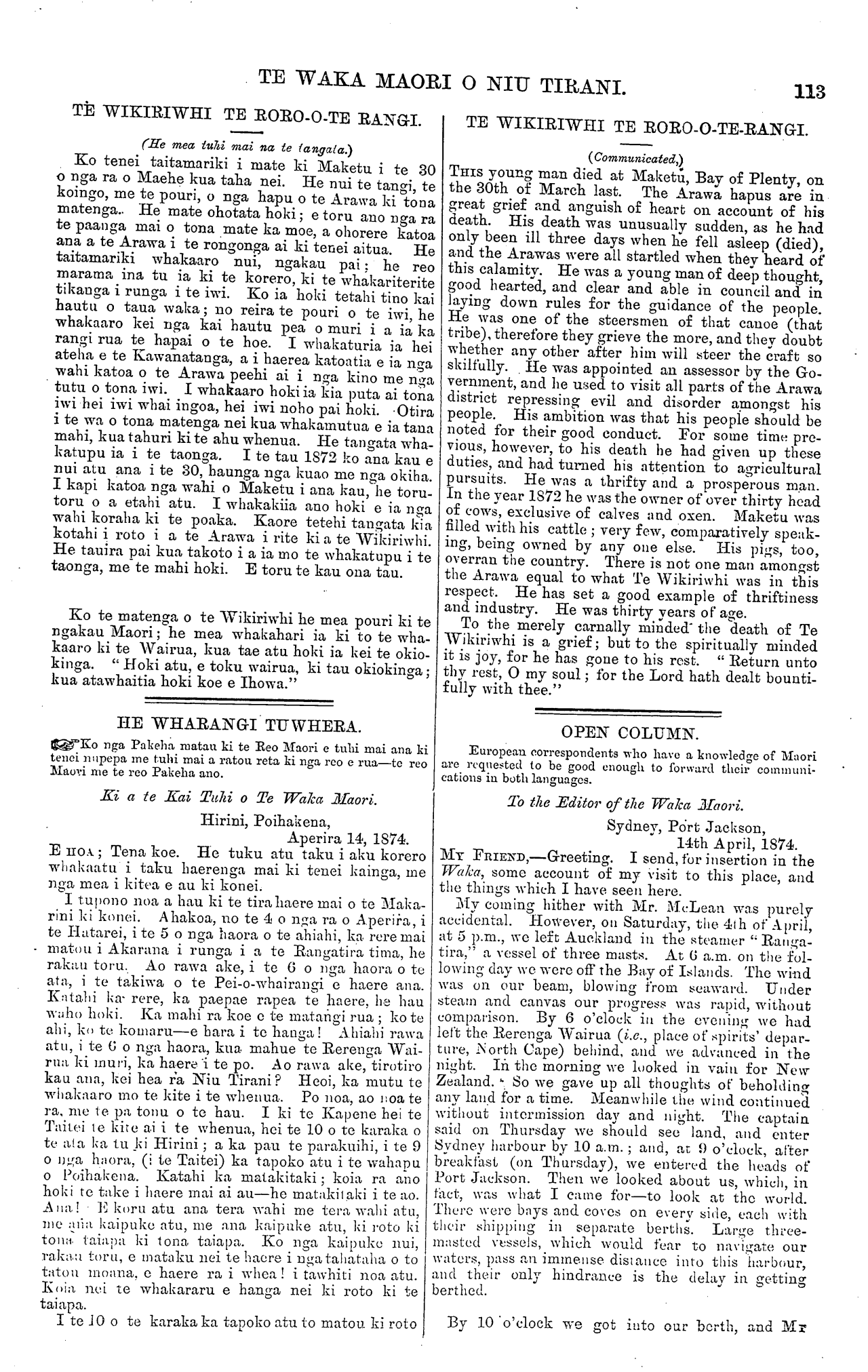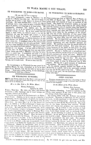 TE WAKA MAORI O NIU TIRANI. 113 TE WIKIRIWHI TE RORO-O-TE-RANGI. (He mea tuhi mai na te tangata.) Ko tenei taitamariki i mate ki Maketu i te 30 o nga ra o Maehe kua taha nei. He nui te tangi, te koingo, me te pouri, o nga hapu o te Arawa Id tona matenga. He mate ohotata hoki; e toru ano nga ra te paanga mai o tona mate ka moe, a ohorere katoa ana a te Arawa i te rongonga ai ki tenei aitua. He taitamariki whakaaro nui, ngakau pai; he reo marama ina tu ia ki te korero, ki te whakariterite tikanga i runga i te iwi. Ko ia hoki tetahi tino kai hautu o taua waka; no reira te pouri o te iwi, he whakaaro kei nga kai hautu pea o muri i a ia ka rangi rua te hapai o te hoe. I whakaturia ia hei ateha e te Kawanatanga, a i haerea katoatia e ia nga wahi katoa o te Arawa peehi ai i nga kino me nga tutu o tona iwi. I whakaaro hoki ia kia puta ai tona iwi hei iwi whai ingoa, hei iwi noho pai hoki. Otira i te wa o tona matenga nei kua whakamutua e ia tana mahi, kua tahuri kite ahu whenua. He tangata wha- katupu ia i te taonga. I te tau 1872 ko ana kau e nui atu ana i te 80, haunga nga kuao me nga okiha. I kapi katoa nga wahi o Maketu i ana kau, he toru- toru o a etahi atu. I whakakiia ano hoki e ia nga wahi koraha ki te poaka. Kaore tetehi tangata kia kotahi i roto i a te Arawa i rite ki a te Wikiriwhi. He tauira pai kua takoto i a ia mo te whakatupu i te taonga, me te mahi hoki. E toru te kau ona tau. Ko te matenga o te Wikiriwhi he mea pouri ki te ngakau Maori; he mea whakahari ia ki to te wha- kaaro ki te Wairua, kua tae atu hoki ia kei te okio- kinga. " Hoki atu, e toku wairua, ki tau okiokinga; kua atawhaitia hoki koe e Ihowa." HE WHARANGI TUWHERA. Ko nga Pakeha matau ki te Reo Maori e tuhi mai ana ki tenei nupepa me tuhi mai a ratou reta ki nga reo e rua—te reo Maori me te reo Pakeha ano. Ki a te Kai Tuhi o Te Waka, Maori. Hirini, Poihakena, Aperira 14, 1874. E HOA ; Tena koe. He tuku atu taku i aku korero whakaatu i taku haerenga mai ki tenei kainga, me nga mea i kitea e au ki konei. 1 tupono noa a hau ki te tira haere mai o te Maka- rini Io konei. Ahakoa, no te 4 o nga ra o A perira, i te Hatarei, i te 5 o nga haora o te ahiahi, ka rere mai matou i Akarana i runga i a te Rangatira tima, he rakau toru. Ao rawa ake, i te 6 o nga haora, o to atu, i te takiwa o te Pei-o-whairangi e haere ana. Katahi ka- rere, ka paepae rapea te haere, he hau waho hoki. Ka mahi ra koe e te matangi rua ; ko te ahi, ko te komaru—e hara i te hanga! Ahiahi rawa atu, i te 6 o nga haora, kua mahue te Rerenga Wai- rua ki muri, ka haere i te po. Ao rawa ake, tirotiro kau ana, kei hea ra Niu Tirani? Heoi, ka mutu te whakaaro mo te kite i te whenua. Po noa, ao noa te ra, mu Ie pa tonu o te hau. I ki te Kapene hei te Taitei te kite ai i te whenua, hei te 10 o te karaka o te ata ka tu ki Hirini ; a ka pau te parakuihi, i te 9 o nga haora, (i te Taitei) ka tapoko atu i te wahapu o Poihakena. Katahi ka matakitaki; koia ra ano hoki te take i haere mai ai au—ho matakitaki i te ao. Ana! E koru atu ana tera wahi me tera wahi i atu, me ana kaipuke atu, me ana kaipuke atu, ki roto ki tona taiapa ki tona. taiapa. Ko nga kaipuku nui, rakau toru, e mataku nei te haere i nga tahataha o to tatou moana o haere ra i whea! i tawhiti noa atu. Koia nei. te whakararu e hanga nei ki roto ki te taiapa. I te 10 o te karaka ka tapoko atu to matou ki roto TE WIKIRIWHI TE RORO-O-TE-RANGI. ( Communicated,) THIS young man died at Maketu, Bay of Plenty, on the 30th of March last. The Arawa hapus are in great grief and anguish of heart on account of his death. His death was unusually sudden, as he had only been ill three days when he fell asleep (died), and the Arawas were all started when they heard of this calamity. He was a young man of deep thought, good hearted, and clear and able in council and in laying dovvn rules for the guidance of the people. He was one of the steersmen of that canoe (that tribe), therefore they grieve the more, and they doubt whether any other after him will steer the craft so skilfully. He was appointed an assessor by the Go- vernment, and he used to visit all parts of the Arawa district repressing evil and disorder amongst his people. His ambition was that his people should be noted for their good conduct. For some time pre- vious, however, to his death he had given up these duties, and had turned his attention to agricultural pursuits. He was a thrifty and a prosperous man. In the year 1872 he was the owner of ever thirty head of cows, exclusive of calves and oxen. Maketu was filled with his cattle ; very few, comparatively speak- ing, being owned by any one else. His pigs, too, overran the country. There is not one man amongst the Arawa equal to what Te Wikiriwhi was in this respect. He has set a good example of thriftiness and industry. He was thirty years of age. To the merely carnally minded" the death of Te Wikiriwhi is a grief; but to the spiritually minded it is joy, for he has gone to his rest. " Return unto thy rest, O my soul; for the Lord hath dealt bounti- fully with thee." OPEN COLUMN. European correspondents who have a knowledge of Maori are requested to be good enough to forward their communi- cations in both languages. To the Editor of the Waka Ma ori. Sydney, Port Jackson, 14th April, 1874. MY FRIEND,—Greeting. I send, ior insertion in the Waka, some account of my visit to this place, and the things which I have seen here. My coming hither with Mr. McLean was purely accidental. However, on Saturday, the 4th of April, at 5 p.m., we left Auckland in the steamer " Ranga- tira," a vessel of three masts. At U a.m. on the fol- lowing day we were off the Bay of Islands. The wind was on our beam, blowing from seaward. Under steam and canvas our progress was rapid, without comparison. By 6 o'clock in the evening we had left the Rerenga Wairua (i.e., place of spirits' depar- ture, North Cape) behind, and we advanced in the night. In the morning we looked in vain for New Zealand. - So we gave up all thoughts of be