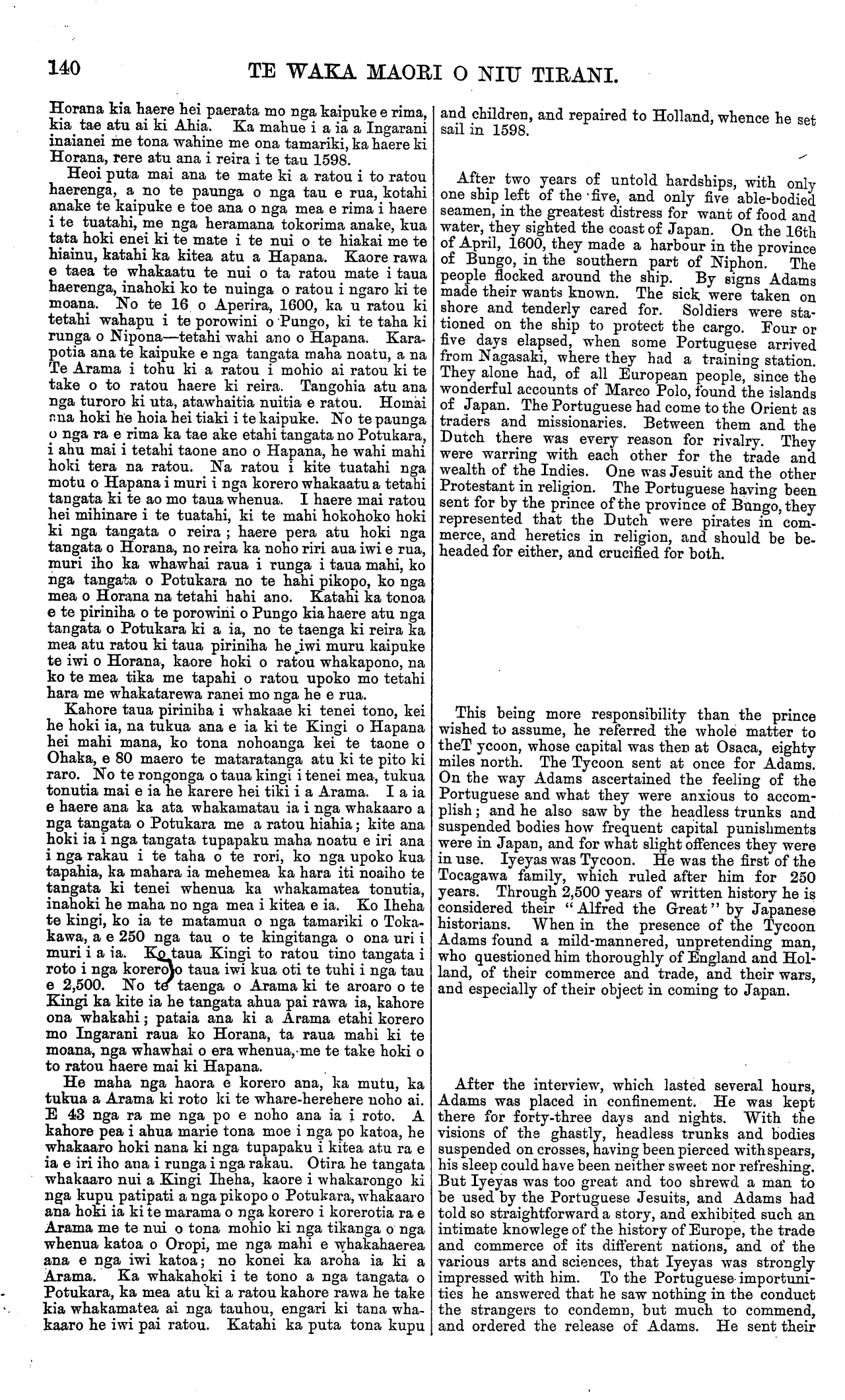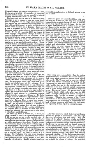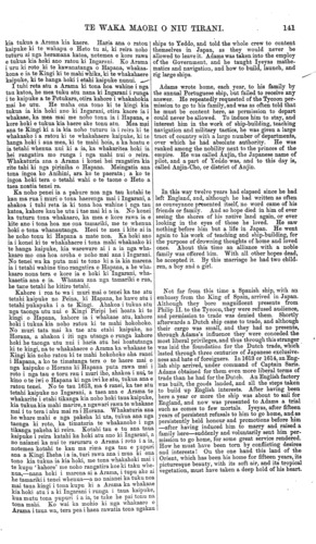TE WAKA MAORI O NIU TIRANI. 141 kia tukua a Arama kia kaere. Haria ana o ratou kaipuke ki te wahapu o Heto tu ai, ki reira noho tuturu ai nga heramana katoa, notemea e kore rawa e tukua kia hoki ano ratou ki Ingarani. Ko Arama i uru ki roto. ki te kawanatanga o Hapana, whakaa- kona e ia te Kingi ki te mahi whika, ki te whakahaere kaipuke, ki te hanga hoki i etahi kaipuke nunui. 1 tuhi reta atu a Arama ki tona hoa wahine i nga tau katoa, he mea tuku atu nana ki Ingarani i runga i te kaipuke a te Potukara, otira kahore i whakahokia mai he utu. He maha ona tono ki te kingi kia tukua ia kia hoki ano ki Ingarani, otira kaore ia i whakaae, ka mea mai me noho tonu ia i Hapana, e kore hoki e tukua kia haere ake tonu atu. Mea mai ana te Kingi ki a ia kia noho tuturu ia i reira ki te whakaako i a ratou ki te whakahaere kaipuke, ki te hanga hoki i aua mea, ki te mahi hoia, a ka hoatu e ia tetahi whenua nui ki a ia, ka whakaritea hoki ia hei rangatira mo runga i nga mahi nui o reira. Whakaturia ana a Arama i konei hei rangatira kia rite tahi ki nga piriniha o Hapana. Meingatia ana tona ingoa ko Anihini, ara ko te paerata; a ko te ingoa hoki tera o tetahi wahi o te taone o Heto a taea noatia tenei ra. Ka noho penei ia a pahure noa nga tau kotahi te kau ma rua i muri o tona haerenga mai i Ingarani, a ahakoa i tuhi reta ia ki tona hoa wahine i nga tau katoa, kahore kau he utu i tae mai ki a ia. No konei ka tuturu tona whakaaro, ka mea e kore rawa ia e kite ano i tona hoa me ona tamariki, me te whenua hoki o tona whanautanga. Heoi te mea i kite ai ia he noho tonu ki Hapana a mate noa. Ka hoki ano ia i konei ki te whakahaere i tona mahi whakaako ki te hanga kaipuke, kia wareware ai i a ia nga wha- kaaro mo ona hoa aroha e noho mai ana i Ingarani. No tenei wa ka puta mai te tono Iti a ia kia marena ia i tetahi wahine tino rangatira o Hapaua, a he wha- kaaro nona tera e kore ia e hoki ki Ingarani, wha- kaaetia ana e ia. Whanau aua nga tamariki e rua, he tane tetahi he kitiro tetahi. Kahore i roa te wa i muri mai o tenei ka tae atu tetahi kaipuke no Peina, ki Hapana, he kawe atu i tetahi pukapuka i a te Kingi. Ahakoa i tukua atu nga taonga utu nui e Kingi Piripi hei hoata ki te kingi o Hapana, kahore ia i whakaae atu, kahore hoki i tukua kia noho ratou ki te mahi hokohoko. No muri tata mai ka tae atu etahi kaipuke, no Horana, a ahakoa i iti nga utanga o runga kahore hoki he taonga utu nui i haria atu hei hoatutanga ki te kingi, na te whakahaere o Arama ka whakaae te Kingi kia noho ratou ki te mahi hokohoko aha ranei i Hapana, a ko te timatanga tera o te haere mai o nga kaipuke o Horana ki Hapana puta rawa mai i roto i nga tau e toru rau i muri iho, ahakoa i nui, te kino o te iwi o Hapana ki nga iwi ke atu, tukua ana e ratou tenei. No te tau 1613, ma 4 ranei, ka tae atu tetahi kaipuke no Ingarani, a taea ana e Arama te whakarite i etahi tikanga kia noho hoki taua kaipuke, kia tukua kia mahi marire, a ngawari rawa te whakaae mai i to tera i ahu mai ra i Horana. Whakaturia ana he whare mahi e nga pakeha ki uta, tukua ana nga taonga ki roto, ka timataria te whakanoho i nga tikanga pakeha ki reira. Kotahi tau e tu ana taua kaipuke i reira katahi ka hoki atu ano ki Ingarani, a no naianei ka nui te raruraru o Arama i roto i a ia, notemea kotahi te kau ma rima nga tau e pupuri ana a Kingi Iheha i a ia, turi rawa ana i mua ki ona tono kia tukua ia kia hoki, me tona whakahoki mai i te kupu 'kahore' me noho rangatira koe ki taku whe- nua,—nana hoki i marena ai a Arama, i tupu ako ai he tamariki i tenei whenua—a no naianei ka tuku noa mai taua kingi i tona kupu ki a Arama ka whakaae kia hoki atu i a ki Ingarani i runga i taua kaipuke, kua mutu tona pupuri i a ia, te take he pai tonu na tona mahi. Ko wai ka mohio ki nga whakaaro o Arama i taua wa, tera pea i haea rawatia tona ngakau ships to Yeddo, and told the whole crew to content themselves in Japan, as they would never be allowed to leave it. Adams was taken into the employ of the Government, and he taught lyeyas mathe- matics and navigation, and how to build, launch, and rig large ships. Adams wrote home, each year, to his family by the annual Portuguese ship, but failed to receive any answer. He repeatedly requested of the Tycoon per- mission to go to his family, and was as often told that he must be content here, as permission to depart could never be allowed. To induce him to stay, and interest him in the work of ship-building, teaching navigation and military tactics, he was given a large tract of country with a large number of departments, over which he had absolute authority. He was ranked among the nobility next to the princes of the empire. He was called Anjin, the Japanese name of pilot, and a part of Yeddo was, and to this day is, called Anjin-Cho, or district of Anjin. In this way twelve years had elapsed since he had left England, and, although he had written as often as conveyance presented itself, no word came of his friends or family. And so hope died in him of ever seeing the shores of his native land again, or ever looking in the eyes of those he loved. He saw nothing before him but a life in Japan. He went again to his work of teaching and ship-building, for the purpose of drowning thoughts of home and loved ones. About this time an alliance with a noble family was offered him. With all other hopes dead, he accepted it. By this marriage he had two child- ren, a boy and a girl. Not far from this time a Spanish ship, with an embassy from the King of Spain, arrived in Japan. Although they bore magnificent presents from Philip II. to the Tycoon, they were refused audience, and permission to trade was denied them. Shortly afterwards a Dutch ship came to trade, and although their cargo was small, and they had no presents, through Adams's influence they were conceded the most liberal privileges, and thus through this stranger was laid the foundation for the Dutch trade, which lasted through three centuries of Japanese exclusive- ness and hate of fore