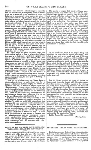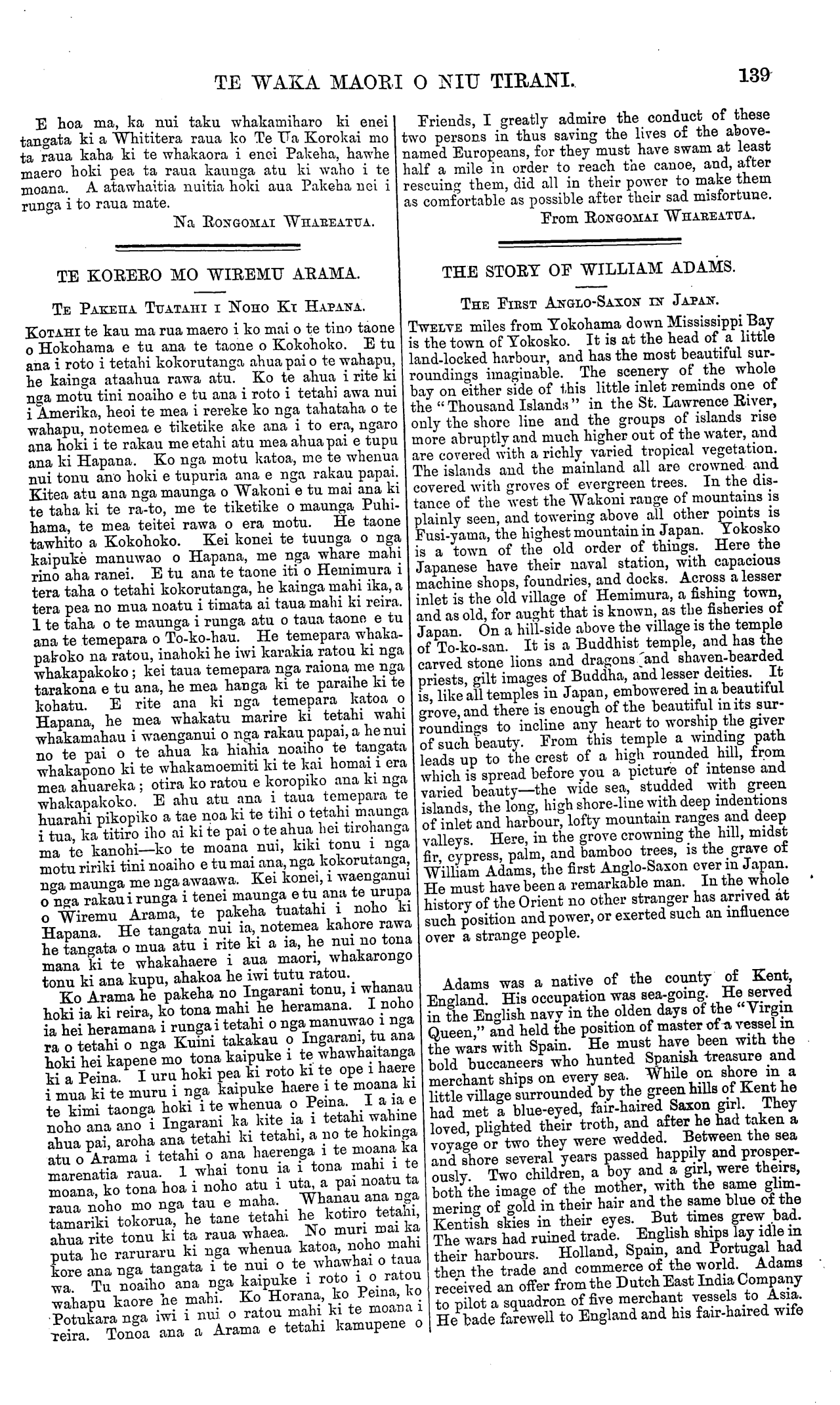 TE WAKA MAORI O NIU TIRANI. 139 E hoa ma, ka nui taku whakamiharo ki enei tangata ki a Whititera raua ko Te Ua Korokai mo ta raua kaha ki te whakaora i enei Pakeha, hawhe maero hoki pea ta raua kaunga atu ki waho i te moana. A atawhaitia nuitia hoki aua Pakeha noi i runga i to raua mate. Na RONGOMAI WHAREATUA. TE KORERO MO WIREMU ARAMA. TE PAKEHA TUATAHI I NOHO KI HAPANA. KOTAHI te kau ma rua maero i ko mai o te tino taone o Hokohama e tu ana te taone o Kokohoko. E tu ana i roto i tetahi kokorutanga ahua pai o te wahapu, he kainga ataahua rawa atu. Ko te ahua i rite ki nga motu tini noaiho e tu ana i roto i tetahi awa nui i Amerika, heoi te mea i rereke ko nga tahataha o te wahapu, notemea e tiketike ake ana i to era, ngaro ana hoki i te rakau me etahi atu mea ahua pai e tupu ana ki Hapana. Ko nga motu katoa, me te whenua nui tonu ano hoki e tupuria ana e nga rakau papai. Kitea atu ana nga maunga o Wakoni e tu mai ana ki te taha ki te ra-to, me te tiketike o maunga Puhi- hama, te mea teitei rawa o era motu. He taone tawhito a Kokohoko. Kei konei te tuunga o nga kaipuke manuwao o Hapana, me nga whare mahi rino aha ranei. E tu ana te taone iti o Hemimura i tera taha o tetahi kokorutanga, he kainga mahi ika, a tera pea no mua noatu i timata ai taua mahi ki reira. 1 te taha o te maunga i runga atu o taua taone e tu ana te temepara o To-ko-hau. He temepara whaka- pakoko na ratou, inahoki he iwi karakia ratou ki nga whakapakoko; kei taua temepara nga raiona me nga tarakona e tu ana, he mea hanga ki te paraihe ki te kohatu. E rite ana ki nga temepara katoa o Hapana, he mea whakatu marire ki tetahi wahi whakamahau i waenganui o nga rakau papai, a he nui no te pai o te ahua ka hiahia noaiho te tangata whakapono ki te whakamoemiti ki te kai homai i era mea ahuareka ; otira ko ratou e koropiko ana ki nga whakapakoko. E ahu atu ana i taua temepara te huarahi pikopiko a tae noa ki te tihi o tetahi maunga i tua, ka titiro iho ai ki te pai o te ahua hei tirohanga ma te kanohi—ko te moana nui, kiki tonu i nga motu ririki tini noaiho e tu mai ana, nga kokorutanga, nga maunga me nga awaawa. Kei konei, i waenganui o nga rakau i runga i tenei maunga e tu ana te urupa o Wiremu Arama, te pakeha tuatahi i noho ki Hapana. He tangata nui ia, notemea kahore rawa he tangata o mua atu i rite ki a ia, he nui no tona mana ki te whakahaere i aua maori, whakarongo tonu ki ana kupu, ahakoa he iwi tutu ratou. Ko Arama he pakeha no Ingarani tonu, i whanau hoki ia ki reira, ko tona mahi he heramana. I noho ia hei heramana i runga i tetahi o nga manuwao i nga ra o tetahi o nga Kuini takakau o Ingarani, tu ana hoki hei kapene mo tona kaipuke i te whawhaitanga ki a Peina. I uru hoki pea ki roto ki te ope i haere i mua ki te muru i nga kaipuke haere i te moana ki te kimi taonga hoki i te whenua o Peina. 1 a ia e noho ana ano i Ingarani ka kite ia i tetahi wahine ahua pai, aroha ana tetahi ki tetahi, a no te hokinga atu o Arama i tetahi o ana haerenga i te moana ka marenatia raua. 1 whai tonu ia i tona mahi i te moana, ko tona hoa i noho atu i uta, a pai noatu ta raua noho mo nga tau e maha. Whanau ana nga tamariki tokorua, he tane tetahi he kotiro tetahi, ahua rite tonu ki ta raua whaea. No muri mai ka puta he raruraru ki nga whenua katoa, noho mahi kore ana nga tangata i te nui o te whawhai o taua wa. Tu noaiho ana nga kaipuke i roto i o ratou wahapu kaore he mahi. Ko Horana, ko Pema, ko •Potukara nga iwi i nui o ratou mahi ki te moana i reira. Tonoa ana a Arama e tetahi kamupene o Friends, I greatly admire the conduct of these two persons in thus saving the lives of the above- named Europeans, for they must have swam at least half a mile in order to reach the canoe, and, after rescuing them, did all in their power to make them as comfortable as possible after their sad misfortune. From RONGOMAI WHAREATUA. THE STORY OF WILLIAM ADAMS. THE FlRST ANGLO-SAXON IN JAPAN. TWELVE miles from Yokohama down Mississippi Bay is the town of Yokosko. It is at the head of a little land-locked harbour, and has the most beautiful sur- roundings imaginable. The scenery of the whole bay on either side of this little inlet reminds one of the "Thousand Islands" in the St. Lawrence River, only the shore line and the groups of islands rise more abruptly and much higher out of the water, and are covered with a richly varied tropical vegetation. The islands and the mainland all are crowned and covered with groves of evergreen trees. In the dis- tance of the west the Wakoni range of mountains is plainly seen, and towering above all other points is Fusi-yama, the highest mountain in Japan. Yokosko is a town of the old order of things. Here the Japanese have their naval station, with capacious machine shops, foundries, and docks. Across a lesser inlet is the old village of Hemimura, a fishing town, and as old, for aught that is known, as the fisheries of Japan. On a hill-side above the village is the temple of To-ko-san. It is a Buddhist temple, and has the carved stone lions and dragons and shaven-bearded priests, gilt images of Buddha, and lesser deities. It is, like all temples in Japan, embowered in a beautiful grove, and there is enough of the beautiful in its sur- roundings to incline any heart to worship the giver of such beauty. From this temple a winding path leads up to the crest of a high rounded hill, from which is spread before you a picture of intense and varied beauty—the wide sea, studded with green islands, the long, high shore-line with deep indentions of inlet and harbour, lofty mountain ranges and deep valleys. Here, in the grove crowning the hill, midst fir, cypress, palm, and bamboo trees, is the grave of William Adams, the first Anglo-Saxon ever in Japan. He must have been a remarkable man. In the whole history of the Orient no other stranger has arrived at such position and power, or exerted such an influence over a strange people. Adams was a native of the county of Kent, England. His occupation was sea-going. He served in 