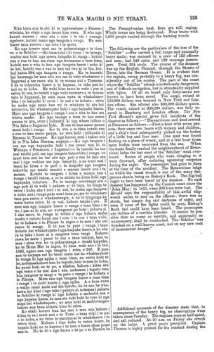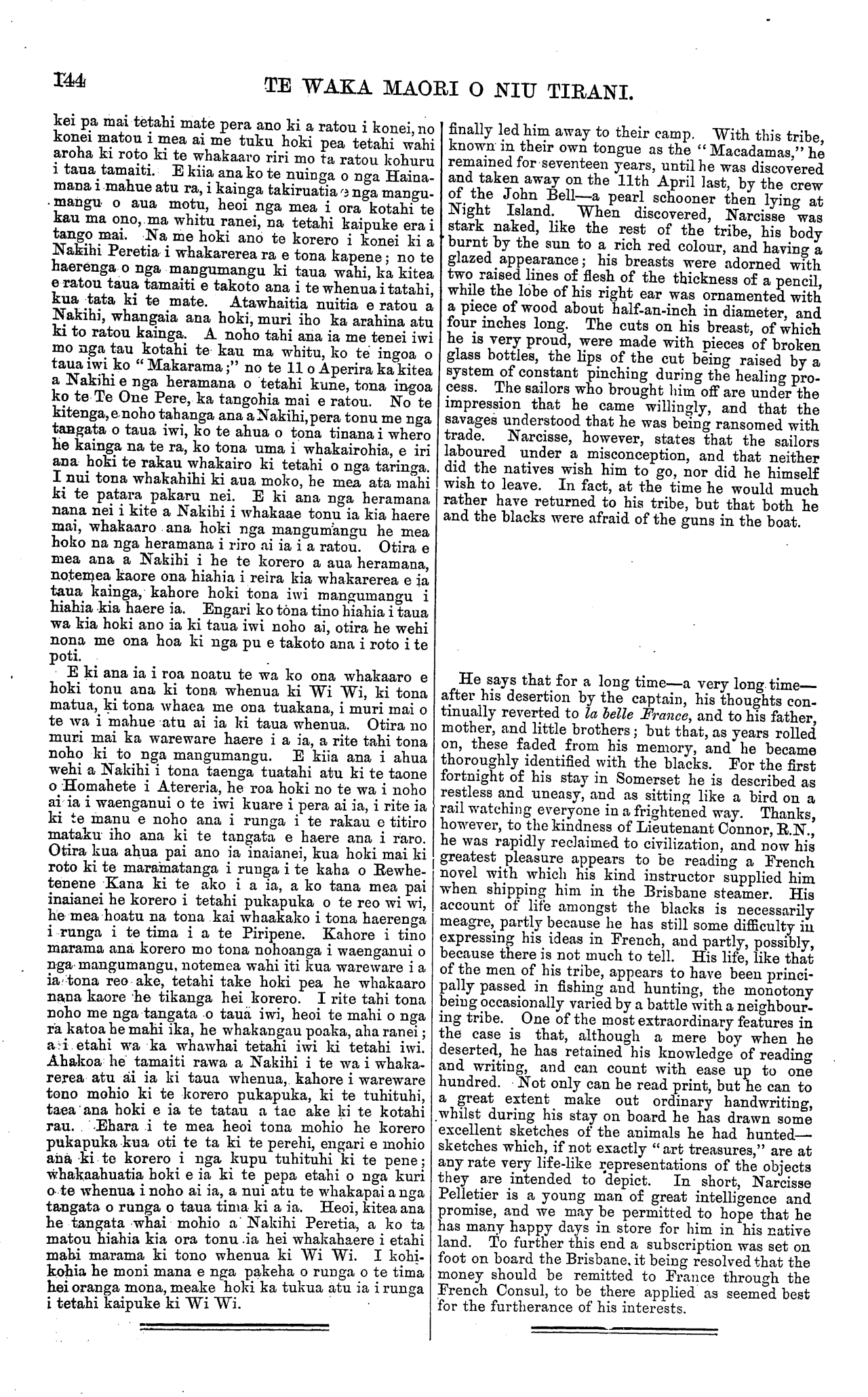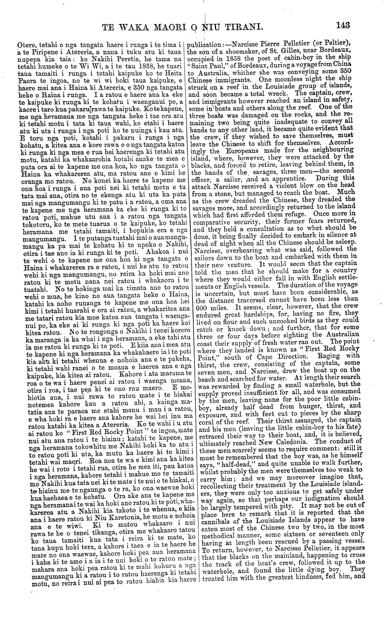 TE WAKA MAORI O NIU TIRANI. 143 Otere, tetahi o nga tangata haere i runga i te tima i a te Piripene i Atereria, a nana i tuku atu ki taua nupepa kia taia : ko Nakihi Peretia, he tama na tetahi humeke o te Wi Wi, a i te tau 1858, he tuari taua tamaiti i runga i tetahi kaipuke ko te Heita Paora te ingoa, no te wi wi hoki taua kaipuke, e haere mai ana i Haina ki Atereria, e 350 nga tangata heke o Haina i runga. I a ratou e haere ana ka eke te kaipuke ki runga ki te kohatu i waenganui po, a kaore i taro kua pakaru rawa te kaipuke. Ko te kapene, me nga heramana me nga tangata heke i tae ora atu ki tetahi motu i tata ki taua wahi, ko etahi i haere atu ki uta i runga i nga poti ko te nuinga i kau atu. E toru nga poti, kotahi i pakaru i runga i nga kohatu, a kitea ana e kore rawa e o nga tangata katoa ki runga ki nga mea e rua hei haerenga ki tetahi atu motu, katahi ka whakaarohia kotahi anake te mea e puta ora ai te kapene me ona hoa, ko nga tangata o Haina ka whakarerea atu, ma ratou ano e kimi he oranga mo ratou. No konei ka haere te kapene me ona hoa i runga i aua poti nei ki tetahi motu e tu tata mai ana, otira no te ekenga atu ki uta ka pata mai nga mangumangu ki te patu i a ratou, a oma ana te kapene me nga heramana ka eke ki runga ki to ratou poti, mahue utu ana i a ratou nga tangata tokotoru, ko te mete tuarua o te kaipuke, ko tetahi heramana me tetahi tamaiti, i hopukia era e nga mangumangu. I te putanga tuatahi mai o aua mangu- mangu ka pa mai te kohatu ki te upoko o Nakihi, otira i tae ano ia ki runga ki te poti. Ahakoa i nui te wehi o te kapene me ona hoa ki nga tangata o Haina i whakarerea ra e ratou, i nui ke atu to ratou wehi ki nga mangumangu, no reira ka hoki mai ano ratou ki te motu nana nei ratou i whakaora i te tuatahi. No te hokinga mai ka timata ano to ratou wehi o mua, he kino no aua tangata heke o Haina, katahi ka noho runanga te kapene me ona hoa hei kimi i tetahi huarahi e ora ai ratou, a whakaritea ana me tatari ratou kia moe katoa aua tangata i waenga- nui po, ka eke ai ki runga ki nga poti ka haere kei kitea ratou. No te rongonga o Nakihi i tenei korero ka maranga ia ka whai i nga heramana, a eke tahi atu ia me ratou ki runga ki te poti. E kiia ana i mea atu te kapene ki nga heramana ka whakahaere ia i te poti kia ahu ki tetahi whenua e nohoia ana e te pakeha, ki tetahi wahi ranei o te moana e haerea ana e nga kaipuke, kia kitea ai ratou. Kahore i ata marama te roa o te wa i haere penei ai ratou i waenga moana, otira i roa, i tae pea ki te ono rau maero. E mo- hiotia ana, i nui rawa to ratou mate i te hiakai notemea kahore kau a ratou ahi, a kainga ma- tatia ana te paraoa me etahi manu i mau i a ratou, e wha hoki ra e haere ana kahore he wai hei inu ma ratou katahi ka kitea a Atereria. Ko te wahi i u atu ai ratou ko " First Red Rocky Point " te ingoa, mate nui atu ana ratou i te hiainu; katahi te kapene, me nga heramana tokowhitu me Nakihi hoki ka to atu i to ratou poti ki uta, ka mutu ka haere ki te kimi i tetahi wai maori. Boa noa te wa e kimi ana ka kitea he wai i roto i tetahi rua, otira he mea iti, pau katoa i nga heramana, kahore tetahi i mahue mo te tamaiti mo Nakihi kua tata nei ki te mate i te nui o te hiakai, o te hiainu me te ngaunga o te ra, ko ona waewae hoki kua haehaea e te kohatu. Ora ake ana te kapene me nga heramana i te wai ka hoki ano ratou ki te poti,wha- karerea atu a Nakihi kia takoto i te whenua, e kiia ana i haere ratou ki Niu Karetonia, he motu e nohoia ana e te wiwi. Ki to matou whakaaro i nui rawa te he o tenei tikanga, otira me whakaaro tatou ko taua tamaiti kua tata i reira ki te mate, ko tana kupu hoki tera, a kahore i taea e ia te haere he mate no ona waewae, kahore hoki pea aua heramana i kaha ki te amo i a ia i te nui hoki o to ratou mate ; mahara ana hoki pea ratou ki te mahi kohuru a nga mangumangu ki a ratou i to ratou haerenga ki tetahi motu, no reira i nui ai pea to ratou hiahia kia haere publication:—Narcisse Pierre Pelletier (or Peltier), the son of a shoemaker, of St. Grilles, near Bordeaux, occupied in 1858 the post of cabin-boy in the ship "Saint Paul," of Bordeaux, during a voyage from China to Australia, whither she was conveying some 350 Chinese immigrants. One moonless night the ship struck on a reef in the Louisiade group of islands, and soon became a total wreck. The captain, crew, and immigrants however reached an island in safety, some in boats and others along the reef. One of the three boats was damaged on the rocks, and the re- maining two being quite inadequate to convey all hands to any other land, it became quite evident that the crew, if they wished to save themselves, must leave the Chinese to shift for themselves. Accord- ingly the Europeans made for the neighbouring island, where, however, they were attacked by the blacks, and forced to retire, leaving behind them, in the hands of the. savages, three men—the second officer, a sailor, and an apprentice. During this attack Narcisse received a violent blow on the head from a stone, but managed to reach the boat. Much as the crew dreaded the Chinese, they dreaded the savages more, and accordingly returned to the island which had first afforded them refuge. Once more in comparative security, their former fears returned, and they held a consultation as to what should be done, it being finally decided to embark in silence at dead of night when all the Chinese should be asleep. Narcisse, overhearing what was said, followed the sailors down to the boat and embarked with them in their new venture. It. would seem that the captain told the men that he should make for a country where they would either fall in with English settle- ments or English vessels. The duration of the voyage is uncertain, but must have been considerable, as the distance traversed cannot have been less than 600 miles. It seems, clear, however, that the crew endured great hardships, for, having no fire, they lived on flour and such uncooked birds as they could catch or knock down ; and furthe