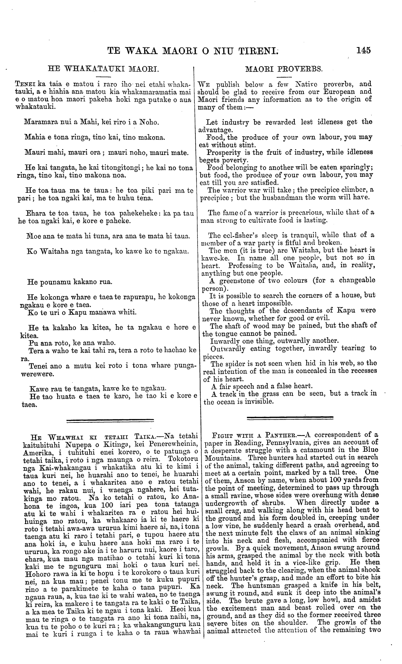 TE WAKA MAORI O NIU TIRENI. 145 HE WHAKATAUKI MAORI. TENEI ka taia e matou i raro iho nei etahi whaka- tauki, a e hiahia ana matou kia whakamaramatia mai e o matou hoa maori pakeha hoki nga putake o aua whakatauki. Maramara nui a Mahi, kei riro i a Noho. Mahia e tona ringa, tino kai, tino makona. Mauri mahi, mauri ora ; mauri noho, mauri mate. He kai tangata, he kai titongitongi; he kai no tona ringa, tino kai, tino makona noa. He toa taua ma te taua: he toa piki pari ma te pari; he toa ngaki kai, ma te huhu tena. Ehara te toa taua, he toa pahekeheke: ka pa tau he toa ngaki kai, e kore e paheke. Moe ana te mata hi tuna, ara ana te mata hi taua. Ko Waitaha nga tangata, ko kawe ko te ngakau. He pounamu kakano rua. He kokonga whare e taea te rapurapu, ho kokonga ngakau e kore e taea. Ko te uri o Kapu manawa whiti. He ta kakaho ka kitea, he ta ngakau e hore e kitea. Pu ana roto, ke ana waho. Tera a waho te kai tahi ra, tera a roto te haehae Ice ra. Tenei ano a mutu kei roto i tona whare punga- werewere. Kawe rau te tangata, kawe ke to ngakau. He tao huata e taea te karo, he tao ki e kore e taea. HE WHAWHAI KI TETAHI TAIKA.—Na tetahi kaituhituhi Nupepa o Kitinga, kei Penerewheinia, Amerika, i tuhituhi enei korero, o te patunga o tetahi taika, i roto i nga maunga o reira. Tokotoru nga Kai-whakangau i whakatika atu ki te kimi i taua kuri nei, he huarahi ano to tenei, he huarahi ano to tenei, a i whakaritea ano e ratou tetahi wahi, he rakau nui, i waenga ngahere, hei tuta- kinga mo ratou. Na ko tetahi o ratou, ko Ana- hona te ingoa, kua 100 iari pea tona tatanga atu ki te wahi i whakaritea ra e ratou hei hui- huinga mo ratou, ka whakaaro ia ki te haere ki roto i tetahi awa-awa ururua kimi haere ai, na, i tona taenga atu ki raro i tetahi pari, e tupou haere atu ana hoki ia, e kuhu haere ana hoki ma raro i te ururua, ka rongo ake ia i te haruru nui, kaore i taro, ehara, kua mau nga matihao o tetahi kuri ki tona kaki me te ngunguru mai hoki o taua kuri nei. Hohoro rawa ia ki te hopu i te korokoro o taua kuri nei, na kua mau; penei tonu me te kuku pupuri rino a te parakimete te kaha o tana pupuri. Ka ngaua raua, a, kua tae ki te wahi watea, no te taenga ki reira, ka makere i te tangata ra te kaki o te Taika, a ka mea te Taika ki te ngau i tona kaki. Heoi kua mau te ringa o te tangata ra ano ki tona naihi, na, kua tu te poho o te kuri ra ; ka whakangunguru kau mai te kuri i runga i te kaha o ta raua whawhai MAORI PROVERBS. WE publish below a few Native proverbs, and should be glad to receive from our European and Maori friends any information as to the origin of many of them:— Let industry he rewarded lest idleness get the advantage. Pood, the produce of your own labour, you may eat without stint. Prosperity is the fruit of industry, while idleness begets poverty. Food belonging to another will be eaten sparingly; but food, the produce of your own labour, you may eat till you are satisfied. The warrior war will take; the precipice climber, a precipice ; but the husbandman the worm will have. The fame of a warrior is precarious, while that of a man strong to cultivate food is lasting. The eel-fisher's sleep is tranquil, while that of a member of a war party is fitful and broken. The men (it is true) arc Waitaha, but the heart is kawe-ke. In name all one people, but not so in heart. Professing to be Waitaha, and, in reality, anything but one people. A greenstone of two colours (for a changeable person). It is possible to search the corners of a house, but those of a heart impossible. The thoughts of the descendants of Kapu were never known, whether for good or evil. The shaft of wood may be pained, but the shaft of the tongue cannot be pained. Inwardly one thing, outwardly another. Outwardly eating together, inwardly tearing to pieces. The spider is not seen when hid in his web, so the real intention of the man is concealed in the recesses of his heart. A fair speech and a false heart. A track in the grass can be seen, but a track in the ocean is invisible. FIGHT WITH A PANTHER.—A correspondent of a paper in Reading, Pennsylvania, gives an account of a desperate struggle with a catamount in the Blue Mountains. Three hunters had started out in search of the animal, taking different paths, and agreeing to meet at a certain point, marked by a tall tree. One of them, Anson by name, when about 100 yards from the point of meeting, determined to pass up through a small ravine, whose sides were overhung with dense undergrowth of shrubs. When directly under a small crag, and walking along with his head bent to the ground and his form doubled in, creeping under a low vine, he suddenly heard a crash overhead, and the next minute felt the claws of an animal sinking into his neck and flesh, accompanied with fierce growls. By a quick movement, Anson swung around his arms, grasped the animal by the neck with both hands, and held it in a vice-like grip. He then struggled back to the clearing, when the animal shook off the hunter's grasp, and made an effort to bite hia neck. The huntsman grasped a knife in his belt, swung it round, and sunk it deep into the animal's aide. The brute gave a long, low howl, and amidst the excitement man and beast rolled over on the ground, and as they did so the former received three severe bites on the shoulder. The growls of the animal attracted the attention of the remaining two