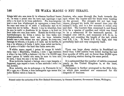 146 TE WAKA MAORI O NIU TIRANI. hinga tahi atu ana raua ki te whenua hurihuri haere ai; ia raua e penei ana ka toru nga ngaunga o nga niho o te kuri ra ki tona pakihiwi. Na, kua rangona mai e ona hoa whakangau te ngunguru a taua kuri, ka oma mai raua ki te wahi e nokenoke mai ra to raua hoa me te taika. Kaore i roa te whawhai, kua tu ano te naihi a Anahona ki te tinana o te kuri ra heoi taka atu ana, kua mate. Katahi ka tirohia e nga kaiwhakangau ka kitea e ratou he tino taika nui whakaharahara taua kuri nei, ko tona taimaha kotahi rau e wha tekau ma ono pauna, ko tona roa, haunga te whiore, e 4 putu e 5 inihi me te hawhe, te roa o te whiore e 2 kutu 1 inihi, tona teitei me ka tu, e 2 putu e 8 inihi—he kuri tino kaha rawa atu. E whitu mano rapeti i patua ki runga ki tetahi rana hipi i Murihiku, Otakou, i roto i nga marama e wha o te tau 1874, a kahore i iti iho i te 10,000 nga mea i patua ki tetahi atu rana, he mea tu tata mai ki tera, i taua wa ano o te tau 1874. Kua mohiotia inainei e kainga ana e nga tangata o Ingarani, nga rapeti e toru te kau miriona i roto i te tau kotahi. Kua nekehia atu te nohoanga o te Paremete ki te 20 o nga ra o Hurae, a kua karangatia nga mema kia noho huihui ratou a taua ra. hunters, who came through the bush towards the spot where the hunter and the brute were tussling on the ground. The struggle did not last long. Anson plunged his knife the second time into the animal's body, and in a few minutes it rolled over and died. The hunters then examined it, and found it to be a species of panther, and which was found to be a catamount of the mammoth species. It weighed over 146 Ib., and measured 4 ft. 5½ in. in length, not counting the length of the tail, which was 2 ft. 1 in. It stood 2 ft. 8 in. high, and was powerfully knit and very compactly built. Upon one large sheep station in Southland no fewer than 7,000 rabbits were killed during the last four months of 1874, and no fewer than 10,000 upon the adjoining station during the same period. It is estimated that the number of rabbits consumed yearly in the United Kingdom is, at the least, 30,000,000. Parliament is further prorogued to the 20th July, on which date members are summoned for the despatch of business. Printed under the authority of the New Zealand Government, by GEORGE DIDSBURY, Government Printer, Wellington.