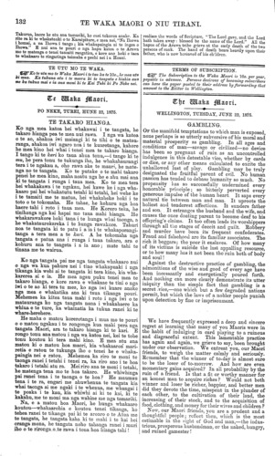 132 TE WAKA MAORI O NIU TIRANI. Takurua, kaore ke atu aua tamariki, ko enei tokorua anake. Ka rite ra ki te whakatauki o te Karaipiture, e mea nei, "Na Ihowa i homai, a na Ihowa i tango ; kia whakapaingia ai te ingoa o Ihowa." E nui ana te pouri o nga hapu katoa o te Arawa mo te matenga o tenei tamaiti rangatira, e kore ano hoki e taea te whakaaro te ringaringa taimaha e peehi nei i a Hoani. TE UTU MO TE WAKA. Ko te utu mo te Waka Maori i te tau ka te 10s., he mea utu ki mua. Ka tukuna atu i te meera ki te tangata e hiahia ana me ka tukua mai e ia aua moni ki te Kai Tuhi ki Po Neke nei. PO NEKE, TUREI, HUNE 23, 1875. TE TAKARO HIANGA. Ko nga mea katoa hei whakawai i te tangata, he takaro hianga pea te mea nui rawa. I nga wa katoa o te ao, ahakoa iwi maiangi ki te tihi o te matau- ranga, ahakoa iwi ngaro noa i te kuaretanga, kahore he mea kino hei whai i tenei mea te takaro hianga. I tango ki te kari ko taua ahua tonu,—i tango ki te mu, he pera tonu te tukunga iho, he whakahaurangi tera i te ngakau a, oho rawa ake te mauri, he mate- nga no te tangata. Ko te putake o te mahi takaro penei he mea kino, maha noatu nga he e ahu mai ana ki te tangata i runga i taua mea. Ko te mea tera hei whakakawa i te ngakau, hei kawe ke i nga wha- kaaro pai hei whakatutu tetahi ki tetahi, hei wehe ke i te tamaiti me te matua, hei whakaheke hoki i te toto o te tokomaha. He tahae, he kohuru nga hoa haere tahi i roto i taua mea. He Korero teka, he tinihanga nga kai hapai mo taua mahi hianga. He whakarawakore hoki taua i te hunga whai taonga, a he whakataurekareka i te hunga rawakore. Tahuri noa te tangata ki te patu i a ia i te whakaporangi- tanga a tera mea a te kari. A he tokomaha nga tangata e patua ana i runga i taua takaro, ara o kohuru ana te tangata i a ia ano ; mate tahi te tinana me te wairua. Ko nga tangata pai me nga tangata whakaaro nui o nga wa kua pahure nei i tino whakapuaki i nga tikanga kia wehi ai te tangata ki tera kino, kia wha- karerea ai e ia. He mea ngau puku tenei mea te takaro hianga, e kore rawa e whakaae te tini o nga iwi o te ao ki tera tu mea, ko nga iwi kuare anake nga mea e whakatika ana ki taua tikanga pouri. Mehemea ka kitea taua mahi i roto i nga iwi o te matauranga ko nga tangata nana i whakahaere ka whiua e te ture, ka whainatia ka tukua ranei ki te whare-herehere. He maha o matou korerotanga i mua mo te pouri o o matou ngakau i te rongonga kua mahi pera nga tangata Maori, ara te takaro hianga ki te kari. E rongo tonu ana matou i nga wa katoa nei, kei te tohe tonu koutou ki tera mahi kino. E mea atu ana matou ki o matou hoa maori, kia whakaaroa mari- retia e ratou te tukunga iho o tenei he e whaka- paingia nei e ratou. Mehemea ka riro te moni te taonga ranei i tetahi i tenei ra, ka riro ano i te hoa takaro i tetahi atu ra. Mei riro ana te moni i tetahi, he matenga tena mo te hoa takaro. He whiwhinga pai ranei tena i te taonga o te hoa ? He maumau tena i te ra, engari me ahuwhenua te tangata kia whai taonga ai me ngaki i te whenua, me whangai i te poaka i te kau, kia whiwhi ai ki te kai, ki te kakahu, me te moni ma nga wahine me nga tamariki. Na, e a matou hoa Maori, he hunga whakaaro koutou—whakaarohia o koutou tenei tikanga, ko tehea ranei te tikanga pai ki te aroaro o te Atua me te tangata, he tangata kaha ki te mahi i te kai hoi oranga mona, he tangata noho tahanga ranei i muri iho o te rironga o te rawa i tona hoa hianga tahi! realises the words of Scripture, " The Lord gave, and the Lord hath taken away: blessed be the name of the Lord." All the hapus of the Arawa tribe grieve at the early death of the two persons of rank. The hand of death bears heavily upon their father, who is now bereaved of bis children. TERMS OF SUBSCRIPTION. The Subscription to the Waka Maori is 10s. per year, payable in advance. Persons desirous of becoming subscribers can have the paper posted to their address by forwarding that amount to the Editor in Wellington. The Waka Maori. WELLINGTON, TUESDAY, JUNE 22, 1875. GAMBLING. OF the manifold temptations to which man is exposed, none perhaps is so utterly subversive of his moral and material prosperity as gambling. In all ages and conditions of man—savage or civilized—no device has been so pregnant of ruin as an uncontrolled indulgence in this detestable vice, whether by cards or dice, or any other means calculated to excite the unhallowed lust of play. Gambling may be truly designated the fruitful parent of evil. No human passion has tended to debase humanity so much. No propensity has so successfully undermined every honorable principle; so bitterly perverted every generous impulse of the human heart. It saps every natural tie between man and man. It uproots the holiest and tenderest affections. It sunders father and sou. It estranges the husband and the wife, and causes the once doating parent to become deaf to his offspring's claims. It too often leads its worshippers through all the stages of deceit and guilt. Bobbery and murder have been its frequent confederates. Fraud and falsehood are its familiar associates. The rich it beggars; the poor it enslaves. Of how many of its victims is suicide the last appalling resource, or to how many has it not been the ruin both of body and soul! Against the destructive practice of gambling, the admonitions of the wise and good of every age have been incessantly and energetically poured forth. And nothing can more clearly demonstrate its utter iniquity than the simple fact that gambling is a secret -vice,—one which but a few degraded nations permit, but which the laws of a nobler people punish upon detection by fine or imprisonment. We have frequently expressed a deep and sincere regret at learning that many of you Maoris were in the habit of indulging in card playing to a ruinous and disgraceful extent. This lamentable practice has again and again, we grieve to say, been brought under our observation. We entreat you, our Maori friends, to weigh the matter calmly and seriously. Remember that the 