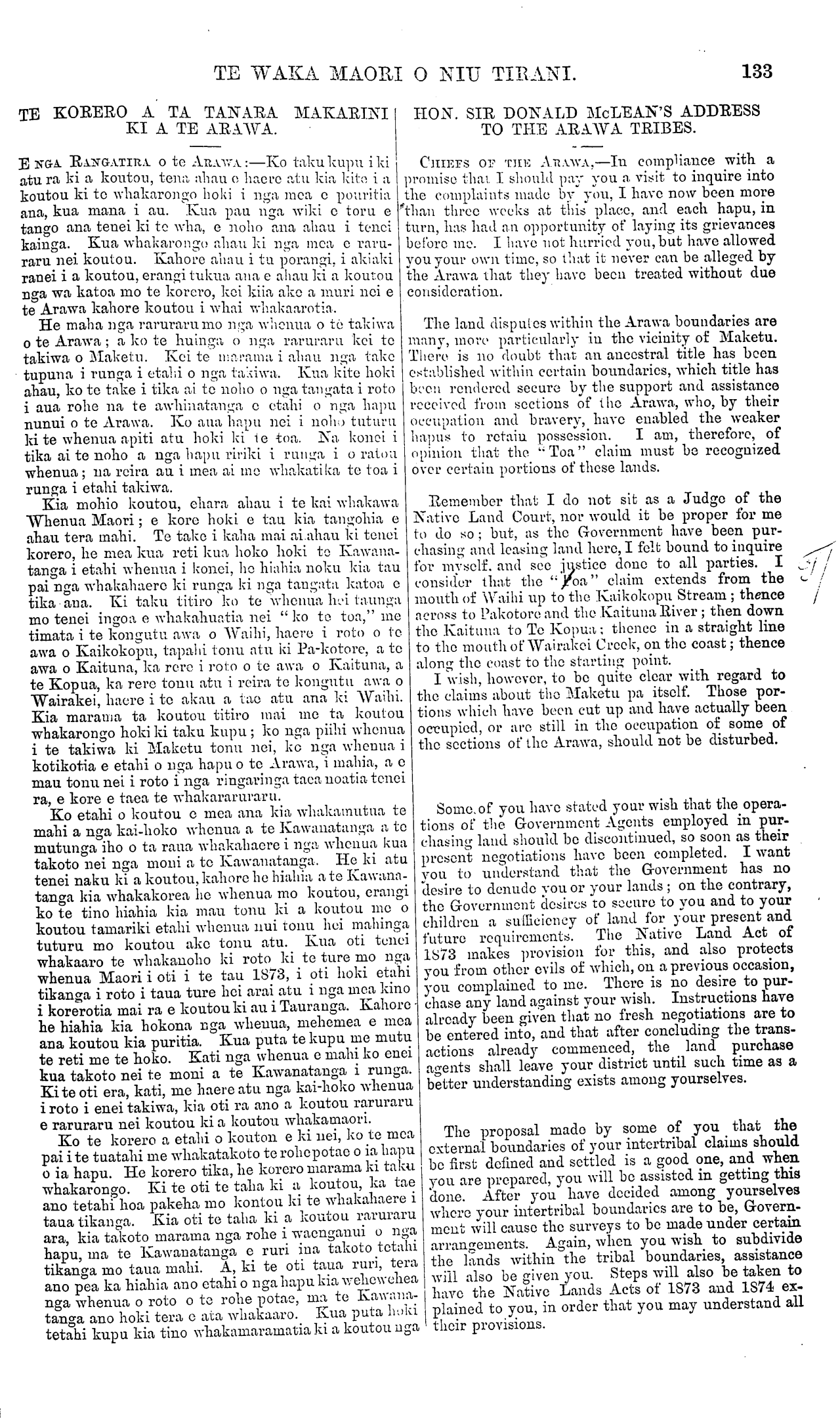 TE WAKA MAORI O NIU TIRANI 133 TE KORERO A TA TANARA KI A TE AE AWA. MAKARINI E NGA. RANGATIRA. o to ARAWA.: Ko taku kupu iki atu ra ki a koutou, tena, ahau o haere atu kia kite i a koutou ki to whakarongo hoki i nga moa e pouritia aua, kua mana i au. Kua pau nga, wiki o toru e tango ana tenei ki te wha, e noho ana ahau i tenei kainga. Kua whakarongo ahau ki nga mea e raru- raru nei. koutou. Kahoro ahau i tu porangi, i akiaki ranei i a koutou, erangi tukua ana e ahau ki a koutou nga wa katoa mo to korero, kei kiia ake a muri nei e te Arawa kahore koutou i whai whakaarotia. He maha nga raruraru mo nga whenua, o to takiwa o te Arawa ; a ko te huinga o nga raruraru kei to takiwa o Maketu. Kei to marama i ahau nga take tupuna i runga i etahi o nga takiwa. Kua kite hoki ahau, ko to take i tika ai te noho o nga tangata i roto i aua rohe na te awhinatanga e etahi o nga hanu nunui o te Arawa. Ko ana hapu nei i noho tuturu ki te whenua apiti atu hoki ki te toa. Na, konei i tika ai te noho a nga hapu ririki i runga, i u ratou whenua ; ua reira au i mea ai mo whakatika to toa, i runga i etahi takiwa. Kia mohio koutou, ehara ahau i te kai whakawa Whenua Maori ; e koro hoki o tau kia tangohia o ahau tera mahi. To tako i kaha mai ai ahau ki tenei korero, ho mea kua reti kua hoko hoki to Kawana- tanga i etahi whenua i konei, ho hiahia noku kia tau pai nga whakahaere ki runga ki nga tangata katoa, o tika aua. Ki taku titiro ko to whenua, hei taunga mo tenei ingoa o whakahuatia nei " ko to toa," me timata i te kongutu awa o Waihi, haere i roto o te awa o Kaikokopu, tapahi tonu atu ki Pa-kotore, a to awa o Kaituna, ka rere i roto o te awa o Kaituna, a te Kopua, ka rere tonu atu i reira to kongutu awa o Wairakei, haere i to akau a tae atu ana ki Waihi. Kia marama ta koutou titiro mai me ta koutou whakarongo hoki ki taku kupu; ko nga puhi whenua i te takiwa ki Maketu tonu nei, ko nga whenua i kotikotia e etahi o nga hapu o to Arawa, i mahia, a e mau tonu nei i roto i nga ringaringa taea noatia tenei ra, e kore e taea te whakararuraru. Ko etahi o koutou e mea ana kia whakamutua te mahi a nga kai-hoko whenua a te Kawanatanga a to mutunga iho o ta raua whakahaere i nga whenua kua takoto nei nga moni a to Kawanatanga. Ho ki atu tenei naku ki a koutou, kahoro ho hiahia ato Kawana- tanga kia whakakorea he whenua mo koutou, erangi ko te tino hiahia kia mau tonu ki a koutou me o koutou tamariki etahi whenua nui tonu hei mahinga tuturu mo koutou ako tonu atu. Kua oti tenei whakaaro to whakanoho ki roto ki to ture mo nga whenua Maori i oti i te tau 1873, i oti hoki etahi tikanga i roto i taua ture hoi arai atu i nga moa kino i korerotia mai ra e koutou ki au i Tauranga. Kahoro he hiahia kia hokona nga whenua, mehemea e moa ana koutou kia puritia. Kua puta te kupu me mutu te reti me te hoko. Kati nga whenua e mahi ko enei kua takoto nei te moni a te Kawanatanga i runga. Ki te oti era, kati, me haere atu nga kai-hoko whenua i roto i enei takiwa, kia oti ra ano a koutou raruraru e raruraru nei koutou ki a koutou whakamaori. Ko te korero a etahi o koutou e Id nei, ko te mea pai ite tuatahi me whakatakoto te rohe potae o ia hapu o ia hapu. He korero tika, he korero marama ki taku whakarongo. Ki te oti te taha ki a koutou, ka tae ano tetahi hoa pakeha mo koutou ki te whakahaere i taua tikanga. Kia oti te taha ki a koutou raruraru ara, kia takoto marama nga rohe i waenganui u nga hapu, ma te Kawanatanga e ruri ma takoto tetahi tikanga mo taua mahi. A, ki te oti taua ruri, tera ano pea ka hiahia ano etahi o nga hapu kia wehewehea nga whenua o roto o to rohe potae, ma te Kawana- tanga ano hoki tera e ata whakaaro. Kua puta hoki tetahi kupu kia tino whakamaramatia ki a koutou nga HON. SIR DONALD McLEAN'S ADDRESS TO THE ARAWA. TRIBES. CHIEFS or THE ARAWA.—In compliance with a promise that 1 should pay you a visit to inquire into the complaints made by you, I have now been more than three weeks at this place, and each hapu, in turn, has had an opportunity of laying its grievances before me. I have not hurried you, but have allowed you your own time, so that it never can be alleged by the Arawa that they have been treated without due consideration. The land disputes within the Arawa boundaries are many, moro particulary in the vicinity of Maketu. There is 110 doubt that au ancestral title has been established within certain boundaries, which title has been rendered secure by the support and assistance received from sections of the Arawa, who, by their occupation and bravery, have enabled the weaker hapus to retain possession. I am, therefore, of opinion that the "Toa" claim must be recognized over certain portions of these lands. Remember that I do not sit as a Judge of the Native Laud Court", nor would it be proper for me to do so ; but, as the Government have been pur- chasing and leasing Iand here, I felt bound to inquire for myself. and see justice done to all parties. I consider that the ''Poa" claim extends from the mouth of Waihi up to the Kaikokopu Stream ; thence across; to Pakotore and the Kaituna River ; then down the Kaituna to Te Kopua: thence in a straight line to the mouth of Wairakei Creek, on the coast; thence along the coast to the starting point. I wish, however, to bo quite clear with regard to the claims about the Maketu pa itself. Those por- tions which have been cut up and have actually been occupied, or aro still in the occupation of some of the sections of the Arawa, should not be disturbed. Some. of you have stated your wish that the opera- tions of the Government Agents employed in pur- chasing laud should bo discontinued, so soon as their present negotiations have been completed. I want you to understand that the Government has no desire to denude you or your lauds ; on the contrary, the Government desires to secure to you and to your children a sufficiency of laud for your present and future requirements. The Native Land Act of 1873 makes provision for this, and also protects you from other evils of