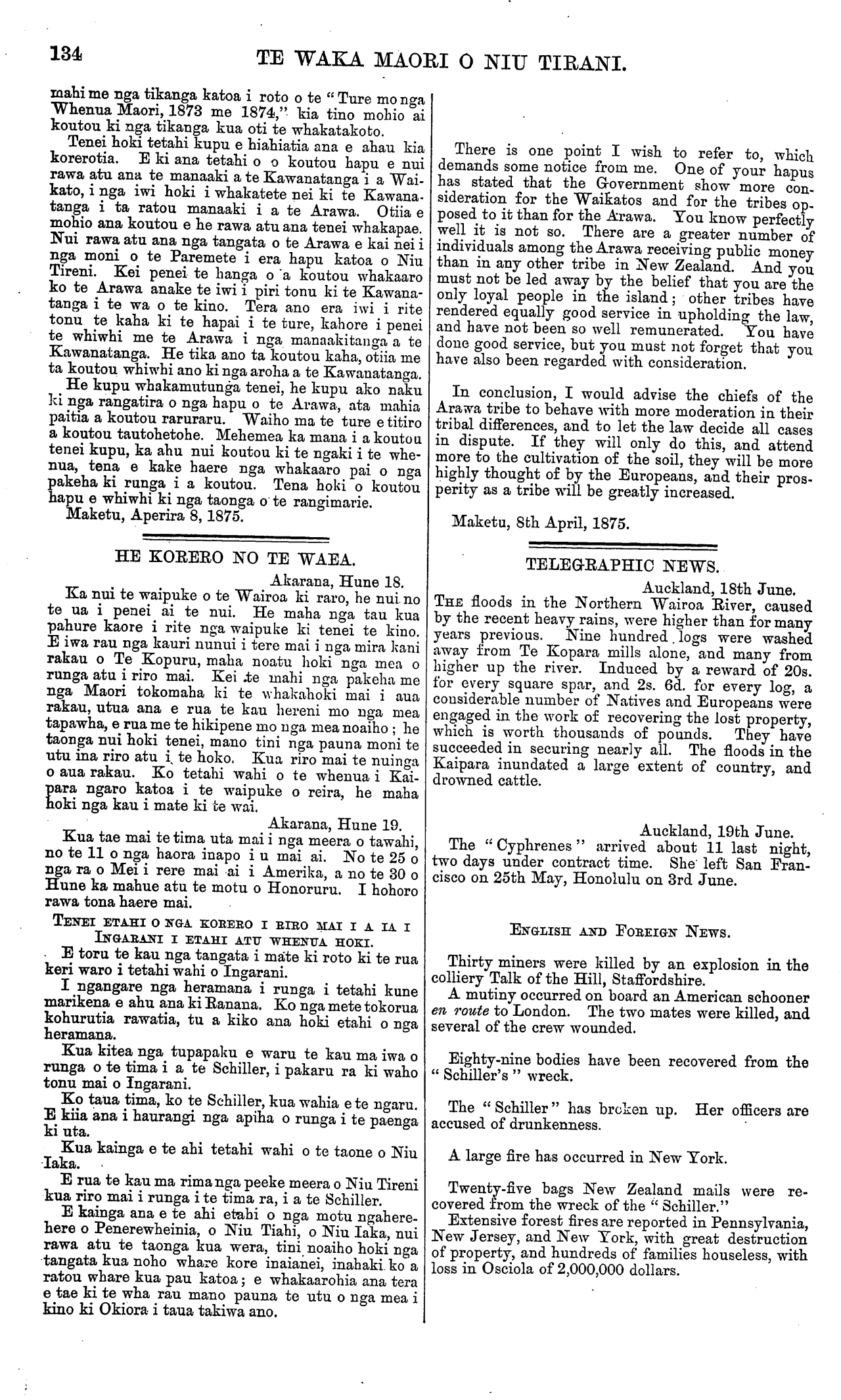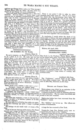 134 TE WAKA MAORI O NIU TIRANI. mahi me nga tikanga katoa i roto o te " Ture mo nga "Whenua Maori, 1873 me 1874," kia tino mohio ai koutou ki nga tikanga kua oti te whakatakoto. Tenei hoki tetahi kupu e hiahiatia ana e ahau kia korerotia. E ki ana tetahi o o koutou hapu e nui rawa atu ana te manaaki a te Kawanatanga i a Wai- kato, i nga iwi hoki i whakatete nei ki te Kawana- tanga i ta ratou manaaki i a te Arawa. Otiia e mohio ana koutou e he rawa atu ana tenei whakapae. Nui rawa atu ana nga tangata o te Arawa e kai nei i nga moni o te Paremete i era hapu katoa o Niu Tireni. Kei penei te hanga o a koutou whakaaro ko te Arawa anake te iwi i piri tonu ki te Kawana- tanga i te wa o te kino. Tera ano era iwi i rite tonu te kaha ki te hapai i te ture, kahore i penei te whiwhi me te Arawa i nga manaakitanga a te Kawanatanga. He tika ano ta koutou kaha, otiia me ta koutou whiwhi ano ki nga aroha a te Kawanatanga. He kupu whakamutunga tenei, he kupu ako naku ki nga rangatira o nga hapu o te Arawa, ata mahia paitia a koutou raruraru. Waiho ma te ture e titiro a koutou tautohetohe. Mehemea ka maua i a koutou tenei kupu, ka ahu nui koutou ki te ngaki i te whe- nua, tena e kake haere nga whakaaro pai o nga pakeha ki runga i a koutou. Tena hoki o koutou hapu e whiwhi ki nga taonga o te rangimarie. Maketu, Aperira 8,1875. HE KORERO NO TE WAEA. Akarana, Hune 18. Ka nui te waipuke o te Wairoa ki raro, he nui no te ua i penei ai te nui. He maha nga tau kua pahure kaore i rite nga waipuke ki tenei te kino. E iwa rau nga kauri nunui i tere mai i nga mira kani rakau o Te Kopuru, maha noatu hoki nga mea o runga atu i riro mai. Kei te mahi nga pakeha me nga Maori tokomaha ki te whakahoki mai i aua rakau, utua ana e rua te kau hereni mo nga mea tapawha, e rua me te hikipene mo nga mea noaiho ; he taonga nui hoki tenei, mano tini nga pauna moni te utu ina riro atu i te hoko. Kua riro mai te nuinga o aua rakau. Ko tetahi wahi o te whenua i Kai- para ngaro katoa i te waipuke o reira, he maha hoki nga kau i mate ki te wai. Akarana, Hune 19. Kua tae mai te tima uta mai i nga meera o tawahi, no te 11 o nga haora inapo i u mai ai. No te 25 o nga ra o Mei i rere mai ai i Amerika, a no te 30 o Hune ka mahue atu te motu o Honoruru. I hohoro rawa tona haere mai. TENEI ETAHI O NGA KORERO I RIRO MAI I A IA I INGARANI I ETAHI ATU WHENUA HOKI. E toru te kau nga tangata i mate ki roto ki te rua keri waro i tetahi wahi o Ingarani. I ngangare nga heramana i runga i tetahi kune marikena e ahu ana ki Ranana. Ko nga mete tokorua kohurutia rawatia, tu a kiko ana hoki etahi o nga heramana. Kua kitea nga tupapaku e waru te kau ma iwa o runga o te tima i a te Schiller, i pakaru ra ki waho tonu mai o Ingarani. Ko taua tima, ko te Schiller, kua wahia e te ngaru. E kiia ana i haurangi nga apiha o runga i te paenga ki uta. Kua kainga e te ahi tetahi wahi o te taone o Niu Iaka. E rua te kau ma rima nga peeke meera o Niu Tireni kua riro mai i runga i te tima ra, i a te Schiller. E kainga ana e te ahi etahi o nga motu ngahere- here o Penerewheinia, o Niu Tiahi, o Niu Iaka, nui rawa atu te taonga kua wera, tini noaiho hoki nga tangata kua noho whare kore inaianei, mahaki ko a ratou whare kua pau katoa; e whakaarohia ana tera e tae ki te wha rau mano pauna te utu o nga mea i kino ki Okiora i taua takiwa ano. There is one point I wish to refer to, which demands some notice from me. One of your hapus has stated that the Government show more con- sideration for the Waikatos and for the tribes op- posed to it than for the Arawa. You know perfectly well it is not so. There are a greater number of individuals among the Arawa receiving public money than in any other tribe in New Zealand. And you must not be led away by the belief that you are the only loyal people in the island; other tribes have rendered equally good service in upholding the law, and have not been so well remunerated. You have done good service, but you must not forget that you have also been regarded with consideration. In conclusion, I would advise the chiefs of the Arawa tribe to behave with more moderation in their tribal differences, and to let the law decide all cases in dispute. If they will only do this, and attend more to the cultivation of the soil, they will be more highly thought of by the Europeans, and their pros- perity as a tribe will be greatly increased. Maketu, 8th April, 1875. TELEGRAPHIC NEWS. Auckland, 18th June. THE floods in the Northern Wairoa River, caused by the recent heavy rains, were higher than for many years previous. Nine hundred. logs were washed away from Te Kopara mills alone, and many from higher up the river. Induced by a reward of 20s. for every square spar, and 2s. 6d. for every log, a considerable number of Natives and Europeans were engaged in the work of recovering the lost property, which is worth thousands of pounds. They have succeeded in securing nearly all. The floods in the Kaipara inundated a large extent of country, and drowned cattle. Auckland, 19th June. The " Cyphrenes" arrived about 11 last night, two days under contract time. She left San Fran- cisco on 25th May, Honolulu on 3rd June. ENGLISH AND FOREIGN NEWS. Thirty miners were killed by an explosion in the colliery Talk of the Hill, Staffordshire. A mutiny occurred on board an American schooner en route to London. The two mates were killed, and several of the crew wounded. Eighty-nine bodies have been recovered from the " Schiller's " wreck. The " Schiller " has broken up. accused of drunkenness. Her officers are A large fire has occurred in New York. Twenty-five bags New Zealand mails were re- covered from the wreck of the " Schiller." Extensive forest fires are reported in Pennsylvania, New Jersey, and New York, with great destruction of property, and hundreds of families houseless, with loss in Osciola of 2,000,000 dollars.