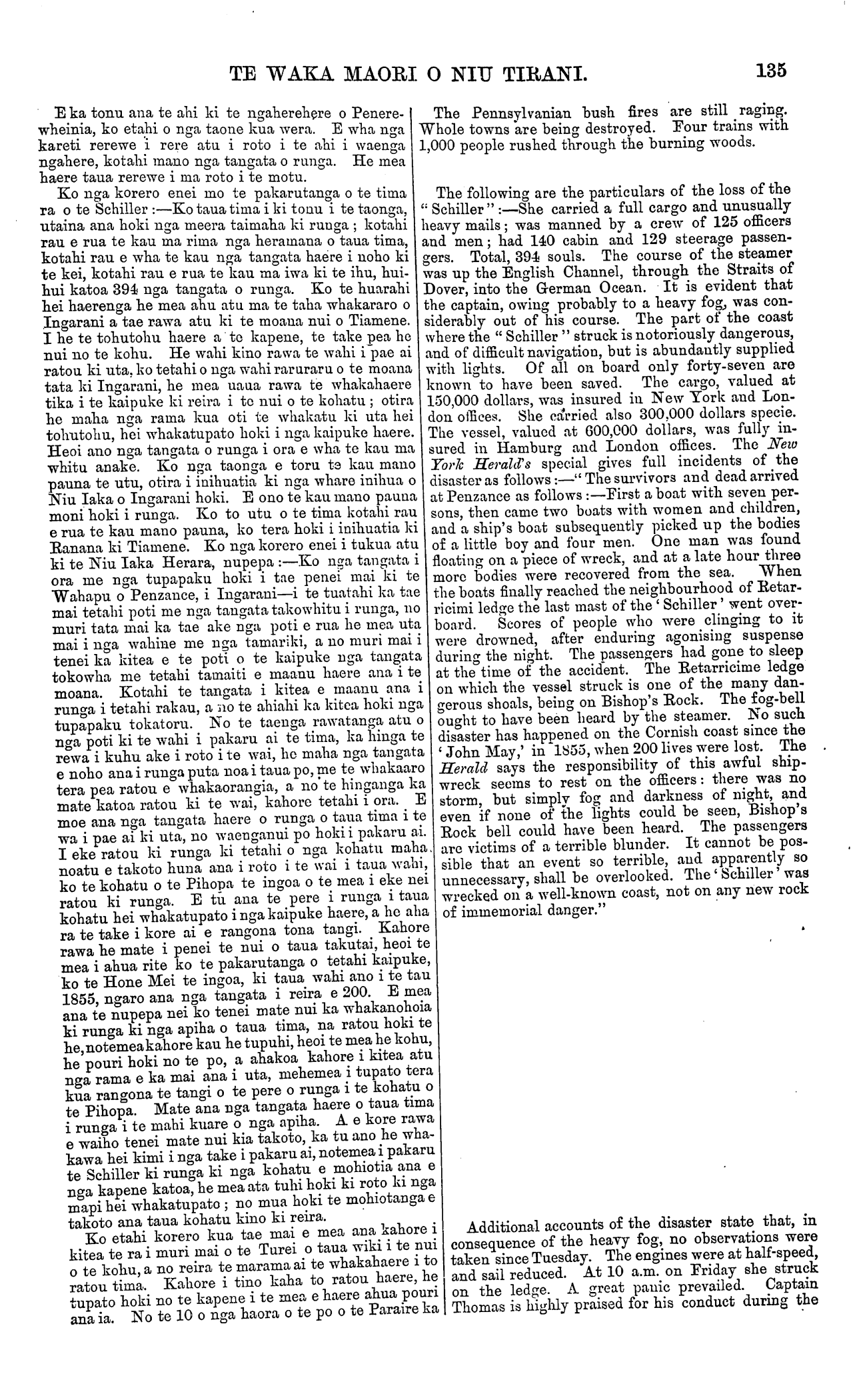 TE WAKA MAORI O NIU TIRANI. 135 E ka tonu ana te ahi ki te ngaherehere o Penere- wheinia, ko etahi o nga taone kua wera. E wha nga kareti rerewe i rere atu i roto i te ahi i waenga ngahere, kotahi mano nga tangata o runga. He mea haere taua rerewe i ma roto i te motu. Ko nga korero enei mo te pakarutanga o te tima ra o te Schiller :—Ko taua tima i ki tonu i te taonga, utaina ana hoki nga meera taimaha ki runga ; kotahi rau e rua te kau ma rima nga heramana o taua tima, kotahi rau e wha te kau nga tangata haere i noho ki te kei, kotahi rau e rua te kau ma iwa ki te ihu, hui- hui katoa 394 nga tangata o runga. Ko te huarahi hei haerenga he mea ahu atu ma te taha whakararo o Ingarani a tae rawa atu ki te moana nui o Tiamene. I he te tohutohu haere a to kapene, te take pea he nui no te kohu. He wahi kino rawa te wahi i pae ai ratou ki uta, ko tetahi o nga wahi raruraru o te moana tata ki Ingarani, he mea uaua rawa te whakahaere tika i te kaipuke ki reira i to nui o te kohatu ; otira ho maha nga rama kua oti te whakatu ki uta hei tohutohu, hei whakatupato hoki i nga kaipuke haere. Heoi ano nga tangata o runga i ora e wha te kau ma whitu anake. Ko nga taonga e toru te kau mano pauna te utu, otira i inihuatia, ki nga whare inihua o Niu Iaka o Ingarani hoki. E ono te kau mano pauna moni hoki i runga. Ko to utu o te tima kotahi rau e rua te kau mano pauna, ko tera hoki i inihuatia ki Ranana ki Tiamene. Ko nga korero enei i tukua atu ki te Niu Iaka Herara, nupepa :—Ko nga tangata i ora me nga tupapaku hoki i tae penei mai ki te Wahapu o Penzance, i Ingarani—i te tuatahi ka tae mai tetahi poti me nga tangata takowhitu i runga, no muri tata mai ka tae ake nga poti e rua he mea uta mai i nga wahine me nga tamariki, a no muri mai i tenei ka kitea e te poti o te kaipuke nga tangata tokowha me tetahi tamaiti e maanu haere aua i te moana. Kotahi te tangata i kitea e maanu ana i runga i tetahi rakau, a "no te ahiahi ka kitea hoki nga tupapaku tokotoru. No te taenga rawatanga atu o nga poti ki te wahi i pakaru ai te tima, ka hinga te rewa i kuhu ake i roto i te wa.i, ho maha nga tangata e noho ana i runga puta noa i taua po, me te whakaaro tera pea ratou e whakaorangia, a no te hinganga ka mate katoa ratou ki te wai, kahore tetahi i ora. E moe ana nga tangata haere o runga o taua tima i te wa i pae ai ki uta, no waenganui po hoki i pakaru a.i. I eke ratou ki runga ki tetahi o nga kohatu maha noatu e takoto huna ana i roto i te wai i taua wahi, ko te kohatu o te Pihopa te ingoa o te mea i eke nei ratou ki runga, E tu ana te pere i runga i taua kohatu hei whakatupato i nga kaipuke haere, a ho aha ra te take i kore ai e rangona tona tangi. Kahore rawa he mate i penei te nui o taua takutai, heoi te mea i ahua rite ko te pakarutanga o tetahi kaipuke, ko te Hone Mei te ingoa, ki taua wahi ano i te tau 1855, ngaro ana nga tangata i reira e 200. E mea ana te nupepa nei ko tenei mate nui ka whakanohoia ki runga ki nga apiha o taua tima, na ratou hoki te he, notemea kahore kau he tupuhi, heoi te mea he kohu, he pouri hoki no te po, a ahakoa kahore i kitea atu nga rama e ka mai ana i uta, mehemea i tupato tera kua rangona te tangi o te pere o runga i te kohatu o te Pihopa. Mate ana nga tangata haere o taua tima i runga i te mahi kuare o nga apiha. A e kore rawa e waiho tenei mate nui kia takoto, ka tu ano he wha- kawa hei kimi i nga take i pakaru ai, notemea i pakaru te Schiller ki runga ki nga kohatu e mohiotia ana e nga kapene katoa, he mea ata tuhi hoki ki roto ki nga mapi hei whakatupato ; no mua hoki te mohiotanga e takoto ana taua kohatu kino ki reira. Ko etahi korero kua tae mai e mea ana kahore i kitea te ra i muri mai o te Turei o taua wiki i te nui o te kohu, a no reira te marama ai te whakahaere i to ratou tima. Kahore i tino kaha to ratou haere, he tupato hoki no te kapene i te mea e haere ahua pouri ana ia. No te 10 o nga haora o te po o te Paraire ka The Pennsylvanian bush fires are still raging. Whole towns are being destroyed. four trains with 1,000 people rushed through the burning woods. The following are the particulars of the loss of the " Schiller" :—She carried a full cargo and unusually heavy mails ; was manned by a crew of 125 officers and men ; had 140 cabin and 129 steerage passen- gers. Total, 394 souls. The course of the steamer was up the English Channel, through the Straits of Dover, into the German Ocean. It is evident that the captain, owing probably to a heavy fog, was con- siderably out of his course. The part of the coast where the " Schiller " struck is notoriously dangerous, and of difficult navigation, but is abundantly supplied with lights. Of all on. board only forty-seven are known to have been saved. The cargo, valued at 150,000 dollars, was insured in New York and Lon- don offices. She carried also 300,000 dollars specie. The vessel, valued at 600,000 dollars, was fully in- sured in Hamburg and London offices. The New York Herald's special gives full incidents of the disaster as follows:—" The survivors and dead arrived at Penzance as follows :—First a boat with seven per- sons, then came two boats with women and children, and a ship's boat subsequently picked up the bodies of a little boy and four men. One man was found floating on a piece of wreck, and at a late hour three more bodies were recovered from the sea. When the boats finally reached the neighbourhood of Retar- ricimi ledge the last mast of the ' Schiller' went over- board. Scores of people who were clinging to it were drowned, after enduring agonising suspense during the night. The passengers had gone to sleep at the time of the accident. The Retarricime ledge on which the vessel struck is one of the many dan- gerous shoals, being on Bishop's Rock. The fog-bell ought to have been heard by the steamer. No such disaster has happened on the Cornish coast since the ( John May,' in 1855, when 200 lives were lost. The Herald says the responsibility of this awful ship- wreck seems to rest on the officers : 