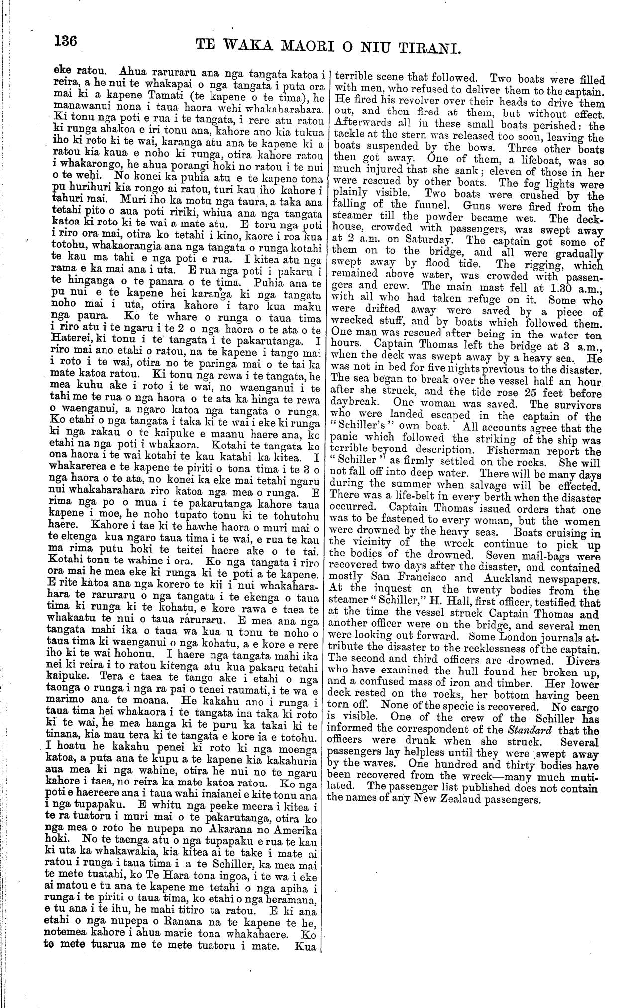 136 TE WAKA MAORI O NIU TIRANI. eke ratou. Ahua raruraru ana nga tangata katoa i reira, a he nui te whakapai o nga tangata i puta ora mai ki a kapene Tamati (te kapene o te tima), he manawanui nona i taua haora wehi whakaharahara. Ki tonu nga poti e rua i te tangata, i rere atu ratou ki runga ahakoa e iri tonu ana, kahore ano kia tukua iho ki roto ki te wai, karanga atu ana te kapene ki a ratou kia kaua e noho ki runga, otira kahore ratou i whakarongo, he ahua porangi hoki no ratou i te nui o te wehi. No konei ka puhia atu e te kapene tona pu hurihuri kia rongo ai ratou, turi kau iho kahore i tahuri mai. Muri iho ka motu nga taura, a taka ana tetahi pito o aua poti ririki, whiua ana nga tangata katoa ki roto ki te wai a mate atu. E toru nga poti i riro ora mai, otira ko tetahi i kino, kaore i roa kua totohu, whakaorangia ana nga tangata o runga kotahi te kau ma tahi e nga poti e rua. I kitea atu nga : rama e ka mai ana i uta. E rua nga poti i pakaru i te hinganga o te panara o te tima. Puhia ana te pu nui e te kapene hei karanga ki nga tangata noho mai i uta, otira kahore i taro kua maku nga paura. Ko te whare o runga o taua tima i riro atu i te ngaru i te 2 o nga haora o te ata o te Haterei, ki tonu i te tangata i te pakarutanga. I riro mai ano etahi o ratou, na te kapene i tango mai i roto i te wai, otira no te paringa mai o te tai ka mate katoa ratou. Ki tonu nga rewa i te tangata, he mea kuhu ake i roto i te wai, no waenganui i te tahi me te rua o nga haora o te ata ka hinga te rewa o waenganui, a ngaro katoa nga tangata o runga. Ko etahi o nga tangata i taka ki te wai i eke ki runga ki nga rakau o te kaipuke e maanu haere ana, ko etahi na nga poti i whakaora. Kotahi te tangata ko ona haora i te wai kotahi te kau katahi ka kitea. I whakarerea e te kapene te piriti o tona tima i te 3 o nga haora o te ata, no konei ka eke mai tetahi ngaru nui whakaharahara riro katoa nga mea o runga. E rima nga po o mua i te pakarutanga kahore taua kapene i moe, he noho tupato tonu ki te tohutohu haere. Kahore i tae ki te hawhe haora o muri mai o te ekenga kua ngaro taua tima i te wai, e rua te kau ma rima putu hoki te teitei haere ake o te tai. Kotahi tonu te wahine i ora. Ko nga tangata i riro ora mai he mea eke ki runga ki te poti a te kapene. E rite katoa ana nga korero te kii i nui whakahara- hara te raruraru o nga tangata i te ekenga o taua tima ki runga ki te kohatu, e kore rawa e taea te whakaatu te nui o taua raruraru. E mea ana nga tangata mahi ika o taua wa kua u tonu te noho o taua tima ki waenganui o nga kohatu, a e kore e rere iho ki te wai hohonu. I haere nga tangata mahi ika nei ki reira i to ratou kitenga atu kua pakaru tetahi kaipuke. Tera e taea te tango ake i etahi o nga taonga o runga i nga ra pai o tenei raumati, i te wa e marino ana te moana. He kakahu ano i runga i taua tima hei whakaora i te tangata ina taka ki roto ki te wai, he mea hanga ki te puru ka takai ki te tinana, kia mau tera ki te tangata e kore ia e totohu. I hoatu he kakahu penei ki roto ki nga moenga katoa, a puta ana te kupu a te kapene kia kakahuria aua mea ki nga wahine, otira he nui no te ngaru kahore i taea, no reira ka mate katoa ratou. Ko nga poti e haereere ana i taua wahi inaianei e kite tonu ana i nga tupapaku. E whitu nga peeke meera i kitea i te ra tuatoru i muri mai o te pakarutanga, otira ko nga mea o roto he nupepa no Akarana no Amerika hoki. No te taenga atu o nga tupapaku e rua te kau ki uta ka whakawakia, kia kitea ai te take i mate ai ratou i runga i taua tima i a te Schiller, ka mea mai te mete tuatahi, ko Te Hara tona ingoa, i te wa i eke ai matou e tu ana te kapene me tetahi o nga apiha i runga i te piriti o taua tima, ko etahi o nga heramana, e tu ana i te ihu, he mahi titiro ta ratou. E ki ana etahi o nga nupepa o Ranana na te kapene te he, notemea kahore i ahua marie tona whakahaere. Ko te mete tuarua me te mete tuatoru i mate. Kua terrible scene that followed. Two boats were filled with men, who refused to deliver them to the captain. He fired his revolver over their heads to drive them out, and then fired at them, but without effect. Afterwards all in those small boats perished: the tackle at the stern was released too soon, leaving the boats suspended by the bows. Three other boats then got away. One of them, a lifeboat, was so much injured that she sank; eleven of those in her were rescued by other boats. The fog lights were plainly visible. Two boats were crushed by the falling of the funnel. Guns were fired from the steamer till the powder became wet. The deck- house, crowded with passengers, was swept away at 2 a.m. on Saturday. The captain got some of them on to the bridge, and all were gradually swept away by flood tide. The rigging, which remained above water, was crowded with passen- gers and crew. The main mast fell at 1.30 a.m., with all who had taken refuge on it. Some who were drifted away were saved by a piece of wrecked stuff, and by boats which followed them. One mau was rescued after being in the water ten hours. Captain Thomas left the bridge at 3 a.m., when the deck was swept away by a heavy sea. He was not in bed for five nights previous to the disaster. The sea began to break over the vessel half an hour after she struck, and the tide rose 25 feet before daybreak. One woman was saved. The survivors who were landed escaped in the captain of the " Schiller's " own boat. All accounts agree that the panic which followed the striking of the ship was terrible beyond description. Fisherman report the " Schiller " as firmly settled on the rocks. She will not fall off into deep water. There will be many days during the summer when salvage will be effected. There was a life-belt in every berth when the disaster occurred. Captain Thomas issued orders that one was to be fastened to every woman, but the women were drowned by the heavy seas. Boats cruising in the vicinity of the wreck continue to pick up the bodies of the drowned. Seven mail-bags were recovered two days after the 