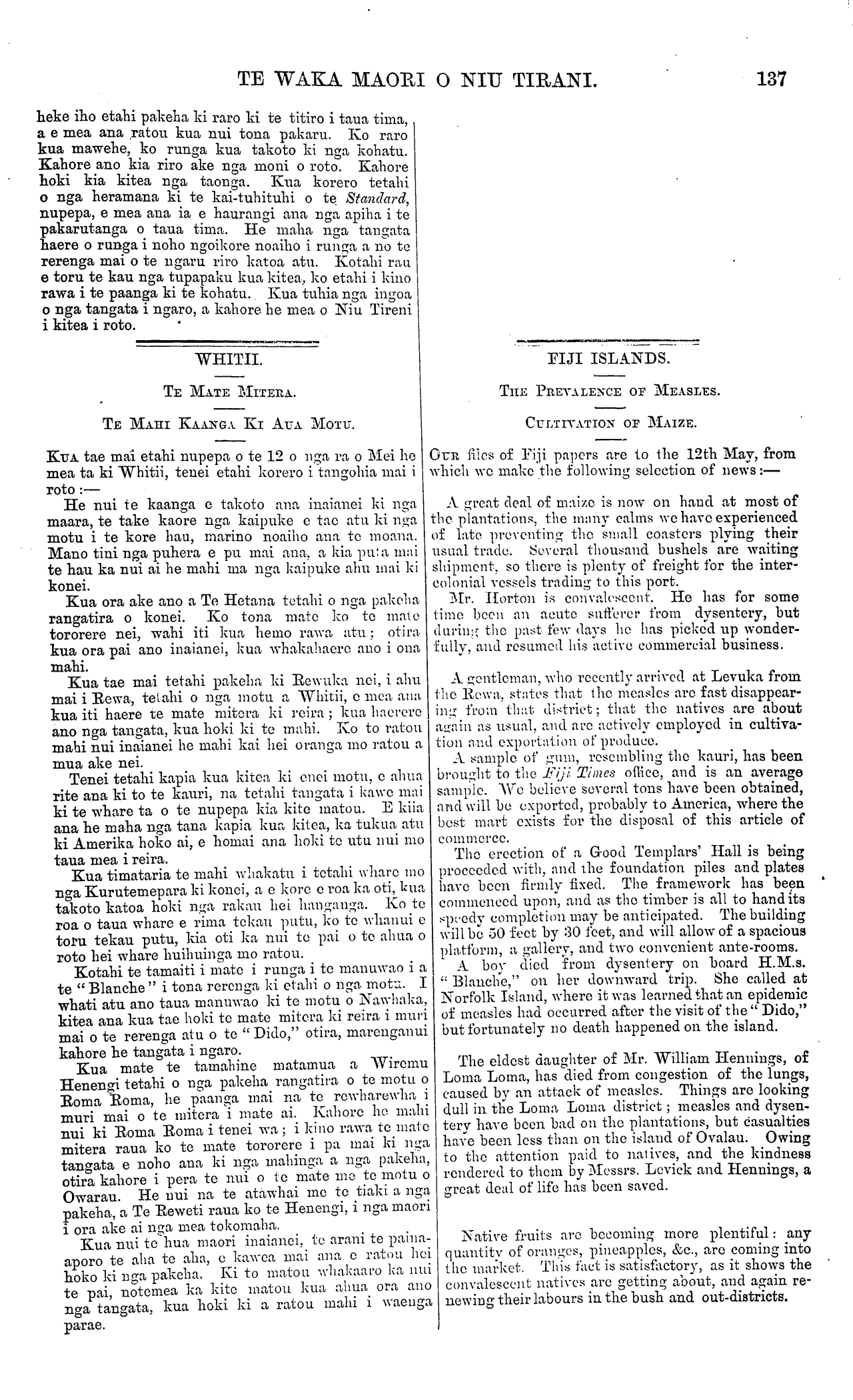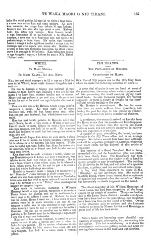 TE WAKA MAORI O NIU TIRANI. 137 heke iho etahi pakeha ki raro ki te titiro i taua tima, a e mea ana ratou kua nui tona pakaru. Ko raro kua mawehe, ko runga kua takoto Id nga kohatu. Kahore ano kia riro ake nga moni o roto. Kahore hoki kia kitea nga taonga. Kua korero tetahi o nga heramana ki te kai-tuhituhi o te. Standard, nupepa, e mea ana ia e haurangi ana nga apiha i te pakarutanga o taua tima. He maha nga tangata haere o runga i noho ngoikore noaiho i runga a no te rerenga mai o te ngaru riro katoa atu. Kotahi rau e toru te kau nga tupapaku kua kitea, ko etahi i kino rawa i te paanga ki te kohatu. Kua tuhia nga ingoa o nga tangata i ngaro, a kahore he mea o Niu Tireni i kitea i roto. WHITII. TE MATE MITERA. TE MAHI KAANGA KI AUA MOTU. KUA tae mai etahi nupepa o te 12 o nga ra o Mei ho mea ta ki Whitii, tenei etahi korero i tangohia mai i roto :— He nui te kaanga e takoto ana inaianei ki nga maara, te take kaore nga kaipuke o tae atu ki nga motu i te kore hau, marino noaiho ana to moana. Mano tini nga puhera e pu mai ana, a kia puta mai te hau ka nui ai he mahi ma nga kaipuke ahu mai ki konei. Kua ora ake ano a Te Hetana tetahi o nga pakeha rangatira o konei. Ko tona mato ko to mai e tororere nei, wahi iti kua hemo rawa atu; otira kua ora pai ano inaianei, kua whakahaere ano i ona mahi. Kua tae mai tetahi pakeha ki Rewuka noi, i ahu mai i Rewa, tetahi o nga motu a Whitu, o mea ana kua iti haere te mate mitera ki reira ; kua haerere ano nga tangata, kua hoki ki te mahi. Ko to ratou mahi nui inaianei he mahi kai hei oranga mo ratou a mua ake nei. Tenei tetahi kapia kua kitea ki enei motu, e ahua rite ana ki to te kauri, na tetahi tangata i kawe mai ki te whare ta o to nupepa kia kite matou. E kiia ana he maha nga tana kapia kua kitea, ka tukua atu ki Amerika hoko ai, e homai ana hoki to utu nui mo taua mea i reira. Kua timataria te mahi whakatu i totahi whare mo nga Kurutemepara ki konei, a o koro o roa ka oti, kua takoto katoa hoki nga rakau hei hanganga. Ko te roa o taua whare e rima tekau putu, ko to whanui o toru tekau putu, kia oti ka nui to pai o to ahua o roto hei whare huihuinga mo ratou. Kotahi te tamaiti i mato i runga i to manuwao i a te " Blanche " i tona rerenga ki etahi o nga motu. . I whati atu ano taua manuwao ki te motu o Nawhaka, kitea ana kua tae hoki te mate mitera ki reira i muri mai o te rerenga atu o to " Dido," otira, marenganui kahore he tangata i ngaro. Kua mate te tamahine matamua a Wiremu Henengi tetahi o nga pakeha rangatira o te motu o Roma Roma, he paanga mai na to rewharewha i muri mai o te mitera i mate ai. Kahore ho mahi nui ki Roma Roma i tenei wa ; i kino rawa te mate mitera raua ko te mate tororere i pa mai ki nga tangata e noho ana ki nga mahinga a nga pakeha, otira kahore i pera to nui o te mate me to motu o Owarau. He nui na te atawhai mo te tiaki a nga pakeha, a Te Reweti raua ko te Henengi, i nga maori i ora ake ai nga mea tokomaha. Kua nui te hua maori inaianei, te arani te paina- aporo te aha to aha, o kawea mai ana o ratou hei hoko Id nga pakeha. Ki to matou whakaaro ka nui te pai, notemea ka kite matou kua ahua ora ano nga tangata, kua hoki ki a ratou mahi i waenga parae. FIJI ISLANDS. THE PREVALENCE or MEASLES. CULTIVATION OF MAIZE. Our files of Fiji papers aro to the 12th May, from which we make the following selection of news:— A great deal of maize is now on hand at most of the plantations, the many calms wo have experienced of late preventing the small coasters plying their usual trade;. Several thousand bushels are waiting shipment, so there is plenty of freight for the inter- colonial vessels trading to this port. Mr. Horton is convalescent. Ho has for some time been an acute sufferer from dysentery, but during the past few days ho has picked up wonder- fully, and resumed his active commercial business. A gentleman, who recently arrived at Levuka from the Rewa, states that Iho measles are fast disappear- ing from that district; that the natives are about again as usual, and arc actively employed in cultiva- tion and exportation of produce. A sample of gum, resembling the kauri, has been brought to the Fiji Times office, and is an average sample. We believe several tons have been obtained, and will bo exported, probably to America, where the best mart exists for the disposal of this article of commerce. The erection of a Good Templars' Hall is being proceeded with, and the foundation piles and plates have been firmly fixed. The framework has been commenced upon, and as the timber is all to hand its speedy completion may be anticipated. The building will bo 50 feet by 30 feet, and will allow of a spacious platform, a gallery, and two convenient ante-rooms. A boy died from dysentery on board H.M.S. " Blanche," on her downward trip. She called at Norfolk Island, where it was learned that on epidemic of measles had occurred after the visit of the" Dido," but fortunately no death happened ou the island. The eldest daughter of Mr. William Hennings, of Loma Loma, has died from congestion of the lungs, caused by an attack of measles. Things aro looking dull in the Loma Loma district; measles and dysen- tery have been bad ou the plantations, but casualties have been less than on the island of Ovalau. Owing to the attention paid to natives, and the kindness rendered, to them by Messrs. Levick and Hennings, a great deal of life has been saved. Native fruits are becoming more plentiful: any quantity of oranges, pineapples, &c., arc coming into the market. This fact is satisfactory, as it shows the convalescent natives arc getting about, and again re- newing their labours in the bush and out-districts.