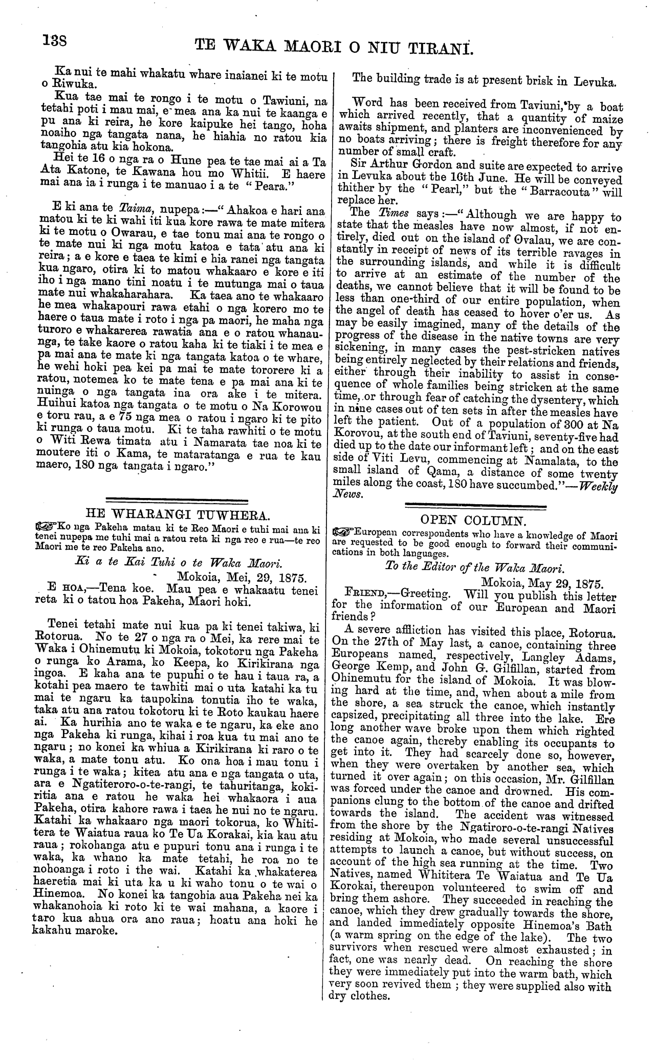 138 TE WAKA MAORI O NIU TIRANI. Ka nui te mahi whakatu whare inaianei ki te motu o Riwuka. Kua tae mai te rongo i te motu o Tawiuni, na tetahi poti i mau mai, e mea ana ka nui te kaanga e pu ana ki reira, he kore kaipuke hei tango, hoha noaiho nga tangata nana, he hiahia no ratou kia tangohia atu kia hokona. Hei te 16 o nga ra o Hune pea te tae mai ai a Ta Ata Katone, te Kawana hou mo Whitii. E haere mai ana ia i runga i te manuao i a te " Peara." E ki ana te Taima, nupepa:—" Ahakoa e hari ana matou ki te ki wahi iti kua kore rawa te mate mitera ki te motu o Owarau, e tae tonu mai ana te rongo o te mate nui ki nga motu katoa e tata atu ana ki reira; a e kore e taea te kimi e hia ranei nga tangata kua ngaro, otira ki to matou whakaaro e kore e iti iho i nga mano tini noatu i te mutunga mai o taua mate nui whakaharahara. Ka taea ano te whakaaro he mea whakapouri rawa etahi o nga korero mo te haere o taua mate i roto i nga pa maori, he maha nga turoro e whakarerea rawatia ana e o ratou whanau- nga, te take kaore o ratou kaha ki te tiaki i te mea e pa mai ana te mate ki nga tangata katoa o te whare, he wehi hoki pea kei pa mai te mate tororere ki a ratou, notemea ko te mate tena e pa mai ana ki te nuinga o nga tangata ina ora ake i te mitera. Huihui katoa nga tangata o te motu o Na Korowou e toru rau, a e 75 nga mea o ratou i ngaro ki te pito ki runga o taua motu. Ki te taha rawhiti o te motu o Witi Rewa timata atu i Namarata tae noa ki te moutere iti o Kama, te mataratanga e rua te kau maero, 180 nga tangata i ngaro." HE WHARANGI TUWHERA. Ko nga Pakeha matau ki te Reo Maori e tuhi mai ana ki tenei nupepa me tuhi mai a ratou reta ki nga reo e rua—te reo Maori me te reo Pakeha ano. Ki a te Kai Tuhi o te Waka Maori. - Mokoia, Mei, 29, 1875. E HOA,—Tena koe. Mau pea e whakaatu tenei reta ki o tatou hoa Pakeha, Maori hoki. Tenei tetahi mate nui kua pa ki tenei takiwa, ki Rotorua. No te 27 o nga ra o Mei, ka rere mai te Waka i Ohinemutu ki Mokoia, tokotoru nga Pakeha o runga ko Arama, ko Keepa, ko Kirikirana nga ingoa. E kaha ana te pupuhi o te hau i taua ra, a kotahi pea maero te tawhiti mai o uta katahi ka tu mai te ngaru ka taupokina tonutia iho te waka, taka atu ana ratou tokotoru ki te Roto kaukau haere ai. Ka hurihia ano te waka e te ngaru, ka eke ano nga Pakeha ki runga, kihai i roa kua tu mai ano te ngaru ; no konei ka whiua a Kirikirana ki raro o te waka, a mate tonu atu. Ko ona hoa i mau tonu i runga i te waka; kitea atu ana e nga tangata o uta, ara e Ngatiteroro-o-te-rangi, te tahuritanga, koki- ritia ana e ratou he waka hei whakaora i aua Pakeha, otira kahore rawa i taea he nui no te ngaru. Katahi ka whakaaro nga maori tokorua, ko Whiti- tera te Waiatua raua ko Te Ua Korakai, kia kau atu raua ; rokohanga atu e pupuri tonu ana i runga i te waka, ka whano ka mate tetahi, he roa no te nohoanga i roto i the wai. Katahi ka whakaterea haeretia mai ki uta ka u ki waho tonu o te wai o Hinemoa. No konei ka tangohia aua Pakeha nei ka whakanohoia ki roto ki te wai mahana, a kaore i taro kua ahua ora ano raua; hoatu ana hoki he kakahu maroke. The building trade is at present brisk in Levuka. Word has been received from Taviuni, by a boat which arrived recently, that a quantity of maize awaits shipment, and planters are inconvenienced by no boats arriving, there is freight therefore for any number of small craft. Sir Arthur Gordon and suite are expected to arrive in Levuka about the 16th June. He will be conveyed thither by the " Pearl," but the " Barracouta " will replace her. The Times says :—" Although we are happy to state that the measles have now almost, if not en- tirely, died out on the island of Ovalau, we are con- stantly in receipt of news of its terrible ravages in the surrounding islands, and while it is difficult to arrive at an estimate of the number of the deaths, we cannot believe that it will be found to be less than one-third of our entire population, when the angel of death has ceased to hover o'er us. As may be easily imagined, many of the details of the progress of the disease in the native towns are very sickening, in many cases the pest-stricken natives being entirely neglected by their relations and friends, either through their inability to assist in conse- quence of whole families being stricken at the same time, or through fear of catching the dysentery, which in nine cases out of ten sets in after the measles have left the patient. Out of a population of 300 at Na Korovou, at the south end of Taviuni, seventy-five had died up to the date our informant left; and on the east side of Viti Levu, commencing at Namalata, to the small island of Qama, a distance of some twenty miles along the coast, 180 have succumbed."—Weekly News. OPEN COLUMN. European correspondents who have a knowledge of Maori are requested to be good enough to forward their communi- cations in both languages. To the Editor of the Waka Maori. Mokoia, May 29, 1875. FRIEND,—Greeting. Will you publish this letter for the information of our European and Maori friends ? A severe affliction has visited this place, Rotorua. On the 27th of May last, a canoe, containing three Europeans named, respectively, Langley Adams, George Kemp, and John G. Gilfillan, started from Ohinemutu for the island of Mokoia. It was blow- ing hard at the time, and, when about a mile from the shore, a sea struck the canoe, which instantly capsized, precipitating all three into the lake. Ere long another wave broke upon them which righted the canoe again, thereby enabling its occupants to get into it. They had scarcely done so, however, when they were overtaken by another sea, which turned it over again; on this occasion, Mr. Gilfillan was forced under the canoe and drowned. His com- panions clung to the bottom of the canoe and drifted towards the island. The accident was witnessed from the shore by the Ngatiroro-o-te-rangi Natives residing at Mokoia, who made several unsuccessful attempts to launch a canoe, but without succe