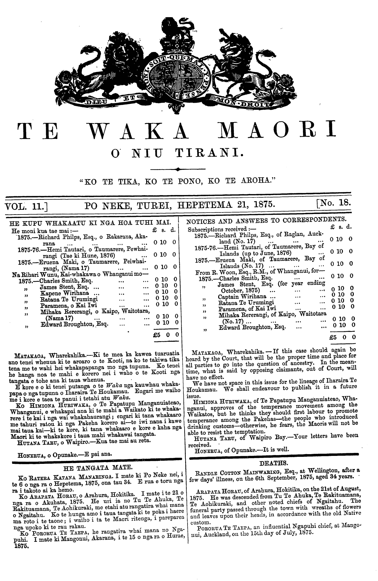 Te Waka Maori o Niu Tirani 1871-1877: Volume 11, Number 18. 21 September 1875 |
