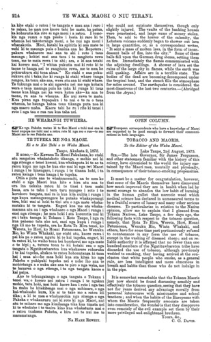 214 TE WAKA MAORI O NIU TIRANI. ka kite etahi o ratou i te tangata e mau ana i raro i te rakau, he mau noa kaore tahi he mate, ka patua, ka kohurutia kia riro ai nga moni i a ratou. I tomo- kia nga rumu o nga peeke i keria ki raro ki te whenua hei takotoranga moni, a he nui nga moni i whanakotia. Heoi, katahi ka apitiria ki aua mate te wehi ki te maunga puia e huaina ana ko Ropotera; pakaru whakarere mai ana te ahi i roto i taua maunga ; kokiri mai ana tera i te rangitoto rewa tonu, me te mata rewa i te ahi; ara, e ki ana tetahi kai korero mai, " I whiua pukutia mai ki roto ki te taone te hanga nei te rangitoto rewa, me te mea he pokurukuru ahi tona ahua." Ko etahi o aua poku- rukuru ahi i taka. iho ki runga ki etahi whare tunga rongoa, ka tonu ake ana, wera atu ana ki etahi whare. Te tukunga mai o te ahi ngarehu nei me nga kohatu wera o taua maunga puia ka taka ki runga ki taua taone kua hinga nei ka wera katoa ake—ka ana te taone, ru ana te whenua. He nui rawa te mate. • Kua pirau nga tupapaku i te nui o te ra o taua whenua, he haunga katoa tona tikanga puta noa ki nga maero maha. Kaore tahi he ru i rite ki tenei i roto i nga tau e rua rau kua taha nei. HE WHARANGI TUWHERA. Ko nga Pakeha matau ki te Reo Maori e tuhi mai ana ki tenei nupepa me tuhi mai a ratou reta ki nga reo e rua—te reo Maori me te reo Pakeha ano. TE TUPEKA ME NGA MAORI. Ki a te Kai Tuhi o te Waka Maori. Taupo, Akuhata 2,1875. E KOEO,—Ko Kawana Ta Hemi Pakuhana, ko etahi atu rangatira whakatakoto tikanga, e mohio nei ki nga ritenga o tenei koroni, kua whakaputa ki te ao ta ratou kupu mo nga he kua eke mai ki nga iwi Maori i runga i te hinengaro, i runga i te tinana hoki, i ta ratou kainga i tena hanga i te tupeka. Otiia e puta ana te whakamoemiti, na te mea ko etahi o nga Maori kua kite e hira atu ana te ora ina uekaha ratou ki te tinei i tera mahi haua, ara te tahu i tera taru mangeo i roto i te korokoro tangata, mai ra ia kua kiia nuitia i runga i nga kupu matangerengere he putake whakaporangi tera, hiki mai ai hoki te tini atu o nga mate whaka- mataku ki te tangata. Engari koa me ata whaka- marama atu au i nga whakaaro o nga Maori i runga i enei nga ritenga; he mea hoki i ata korerotia mai ki au i taku taenga ki Tokanu i Roto Taupo, i nga ra kua pahemo tata ake nei, enei nga kupu i runga i nga kii mo te tupeka, ara ko Rota Te Hira tenei, ko Wereta, ko Hori, ko Hoani Patumoana, ko Wenuku Rio, ko Wiata Whakaki, me etahi atu, kaore rawa i pai kia pa o ratou ngutu ki te kai tupeka, engari, ki ta ratou ki, he waiho tonu hei horohoroi mo nga mate o te hipi; a, tuturu tonu te kii kotahi rau o nga tangata o Ngatituwharetoa kua whakarere rukaruka i te kai tupeka, ahakoa to ratou hohonutanga ki taua kai i mua ai—he mea hoki kua ata kitea ko nga Pakeha e puhipuhi tupeka nei e neke iho ana te mohiotanga a e nuku ake ana te piro o nga waha, me te hauarea o nga ritenga, i ta nga tangata kaore e kai paipa. Ano te tohungatanga o nga tangata o Tokanu i tenei wa, e korero nei ratou i runga i te ngakau mohio, tatu hoki, mai hoki kaore kau i roto i nga tau ka maha he kitekitenga mai o nga mihinare, o nga kai-whakaako kura, kia ai te take mo a ratou kii tika ; a ki te mea e whakaarohia nga ritenga o nga Pakeha e whakaururu nei ki roto ki nga Maori, nui atu te miharo mo nga kimihanga tika kua timata nei ki te whakahe i te tauira kino kua whakaturia mai e o ratou tuakana Pakeha, e hira nei te nui me te maramatanga. NA HARE REWETI. who could not extricate themselves, though only slightly injured. The vaults of the banking houses were penetrated, and large sums of money stolen. Then, to add to the horror of the calamity, the Lobotera volcano suddenly began to shower out lava in large quantities, or, as a correspondent writes, " It sent a mass of molten lava. in the form of incan- descent balls of fire, into the city." Some of these balls fell upon the German drug stores, setting them on fire. Immediately the flames communicated with the adjoining dwellings. A shower of lava set the ruins of the large city in flames, while the earth was still quaking. Affairs are in a terrible state. The bodies of the dead are becoming decomposed under the tropical heat, and the stench fills the atmosphere for miles around. The earthquake is considered the most disastrous of the last two centuries.—(Abridged from the Argus.) OPEN COLUMN. European correspondents who have a knowledge of Maori are requested to be good enough to forward their communi- cations in both languages. TOBACCO AND MAORIS. To the Editor of the Waka Maori. Lake Taupo, 2nd August, 1875. SIR,—The late Governor, Sir James Fergusson, and other statesmen familiar with the history of this colony, have chronicled to the world the injury sus- tained by the Maori race, mentally and physically, in consequence of their tobacco-smoking propensities. It must be a matter for congratulation, however, that some of the Maoris themselves have discovered how much improved they are in health when led by moral courage to abandon the low habit of burning in the human gullet that narcotic weed which medical science has declared in unmeasured terms to be a fruitful source of lunacy and many other serious diseases. To particularize in relation to the Native opinion, allow me to explain that I gleaned from Tokanu Natives, Lake Taupo, a few days ago, the following facts with respect to the tobacco question, namely, that Rota Te Hira, Wereta, Hori, Hoani Patumoana, Wenuku Rio, Wiata Whakaki, and others, have for some time past pertinaciously refused to countenance in any form the use of tobacco, except in the washing of diseased sheep ; and on re- liable authority it is affirmed that no fewer than one hundred members of the Ngatituwharetoa tribe have discarded the use of tobacco, although previously wedded to smoking, they having arrived at the con- clusion that white people who smoke, as a general rule, are less intelligent and more obnoxious in breath and habits than those who do not indulge in in t