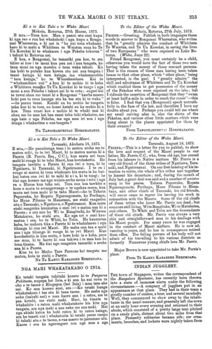 TE WAKA MAORI O NIU TIRANI. 215 Ki a te Kai Tuhi o te Waka Maori Mokoia, Rotorua, 27th Hurae, 1875. E HOA.—Tena koe. Mau e panui atu enei kupu ki nga reo e rua hei whakahoki i nga kupu a Rongo- mai Whareatua, e ki nei ia "ka nui tona whakami- haro ki te mahi a Whititera te Waiatua raua ko Te Ua Korokai ki te whakaora i nga Pakeha tokorua " i tahuri ki Rotorua nei. E hoa, e Rongomai, he tamariki pea koe, te ata titiro ai koe i te moni kua pau nei i aua tangata, ko taua moni na nga morehu o taua waka tahuri. Ko ma hoki te putake kua kawea atu nei aua tangata i tenei kainga ki tera kainga, ina whakamaoritia " tera kainga," ko te Whareherehere. Kai te "whakamiharo nui" ahau ki te mohio ki tekaha o Whititera raua ko Te Ua Korokai ki te tango i nga moni a aua Pakeha i tahuri nei ki te roto ; engari kai te tawai ahau mo tenei ki a Rongomai " hawhe maero hoki pea ta raua kaunga atu ka tae atu ki te waka" —he parau tenei. Katahi au ka mohio he tangata teka koe ki te tare, na konei katahi au ka mohio ki a koe. Tena ranei koe e mohio ki te whaki mai ki ahau me he mea kei hea ranei taku toki whakairo, mo nga hate o nga Pakeha, me nga mea iri noa i nga iringa i whakaritea e ona tangata ? Na TANGIHARURUTAI HOROMATANGI. Ki a te Kai Tuhi o Te Waka Maori. Taranaki, Akuhata 18, 1875. E HOA,—He panuitanga tena i to matou aroha me to matou mihi, to te iwi Maori, ki to matou matua ki a Parete (R. Parris, Esq., C.C.), kua mutu nei tana mahi ki runga ki te taha Maori, kua koroheketia. He tangata tawhito a Parete ki ona iwi e toru, ki te Ngatiawa, ki Taranaki, ki Ngatiruanui. I te ra i rongo ai matou ki tona whakaaro kia mutu ia ka hui- hui katoa ona iwi ki te mihi ki a i a, ki te tangi; he tini nga korero me nga waiata aroha mona i roto i nga ra o Hurae kua taha nei. Tera ona hoa tawhito e kore e mutu te awangawanga o te ngakau mona, kua mutu nei tana mahi ki te taha Maori—ko te Tahana Papawaka, ko Ropata Ngarongomate, ko Porikapa, ko Hone Pihama te Hanataua, me etahi rangatira atu o Taranaki, o Ngatiawa, o Ngatiruanui. Kua mate etahi rangatira kaumatua o enei iwi e matau ana ki a Parete; e ora ana ko Wi te Rangitaiki, ko Wiremu Matakatea, ko etahi atu. Ko nga uri o enei kau- matua i ora, ko te Whiti, ko Tohu. He kaumatua kaha, he mahara tika o Parete ki te whakahaere i nga tikanga ki ona iwi Maori. He maha ona tau e mahi ana i nga tikanga ki runga ki te iwi Maori. Kua koroheketia ia kua mutu, e kore hoki ia e kaha, pera me mua, ki te haere ki ona takiwa i te mea kua ho tona tinana. He tini nga rangatira tamariki e aroha ana ki a Parete. Kua tu ko Meiha Tare Paraone hei tangata mo matou, koia te riwhi o Parete. Na TE KAHUI KARAREHE REREMOANA. NGA MAHI WHAKATAKARO O INIA. Ko tetahi tangata tuhituhi korero ki te Pangaroa Pekiteeta, nupepa kei Inia, e ki ana ka nui rawa te oho o te taone o Hingapoa (kei Inia) i mua tata ake nei. Ko ana korero enei, ara:—Ko tetahi hunga whakatakaro i tae atu ki taua taone. He maha nga neke (nakahi nei) e mau haere ana i a ratou, me te pea kotahi, me etahi maki. Heoi, ka timata te whakakite i a ratou mahi whakatakaro kia kite nga tangata, ara nga mahi a aua neke me aua maki. Hei nga ahiahi katoa ka hoki ratou ki to ratou kainga, ara he teneti nui i whakaturia ki tetahi parae onepu ki tahaki atu o te taone, e rua maero te pamamao atu. Kaore i roa ka ngarongaro noa nga mea a nga To the Editor of the Waka Maori. Mokoia, Rotorua, 27th July, 1875. FRIEND.—Greeting. Publish in both languages these words in answer to Rongomai Whareatua, who writes that he " greatly admires the conduct of Whititera Te Waiatua, and Te Ua Korokai, in saving the lives of two Europeans " who were capsized on Lake Ro- torua. (Waka, June 22). Friend Rongomai, you must certainly be a child, otherwise you would note the fact of those two men having taken the money of those rescued persons. That is the reason of these men having been taken hence to that other place, which " other place," being interpreted, is the gaol. I "greatly admire" the skill and adroitness of Whititera and To Ua Korokai which enabled them to get possession of the money of the Pakehas who were capsized on the lake; but I ridicule the assertion of Rongomai that they " swam at least half-a-mile in order to reach the canoe"—this is false. I find that you (Rongomai) speak untruth- fully in the face of the law, and therefore I have my doubts about you. Perhaps you could tell me where my small carving adze is, also the shirts of the Pakehas, and various other little matters which were hung about in the places appointed for them by their owners ? From TANGIHARURUTAI HOROMATANGI. To the Editor of the Waka Maori. Taranaki, August 18, 1875. FRIEND,—This is a letter for you to publish, to show the love and respect of the Maori people to our father, Mr. Parris, C.C., who, from old age, has ceased from his labours in Native matters Mr. Parris is a very old friend of the three tribes of Ngatiawa, Tara- naki, and Ngatiruanui. On our first hearing of his in- tention to retire, the whole of his tribes met together to lament his departure; and, during the month of July last, a great deal was said and a number of waiatas sung in his praise. Tahana Papawaka, Ropata Ngarongomate, Porikapa, Hone Pihama te Hana- taua, and other chiefs of Taranaki, his old friends, will never cease to regret his leaving his work in connection with the Maoris. Some of the old chiefs of these tribes who knew Mr. Parris are dead; but some are still living, Wi te Rangitake, Wi to Matakatea, and others. Te Whiti and Tohu are the descendants of these old chiefs. Mr. Parris was always a very able and straightforward mau in his dealings with his Maori people. For many years he was engaged in the conduct of Maori matters. He is now ad- vancing in years, and ho has in consequence retired from office. The failing powers of his body will not admit of his travelling to his various districts as formerly Numerous young chiefs love Mr. Parris. Major Brown is now appointed to take Mr.