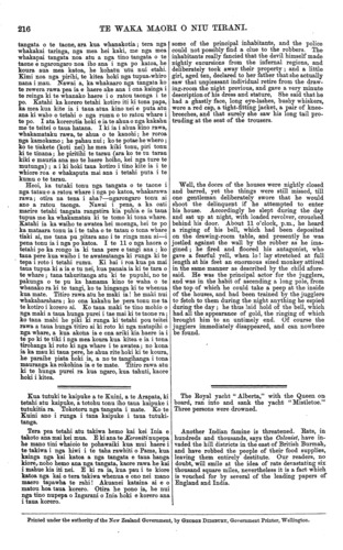 216 TE WAKA MAORI O NIU TIRANI. tangata o te taone, ara kua whanakotia; tera nga whakakai taringa, nga mea hei kaki, me nga mea whakapai tangata noa atu a nga tino tangata o te taone e ngarongaro noa iho ana i nga po katoa, he koura aua mea katoa, he kohatu utu nui etahi. Kimi noa nga pirihi, te kitea hoki nga tupua-whiro nana i mau. Nawai a, ka whakaaro nga tangata ko te rewera rawa pea ia e haere ake ana i ona kainga i te reinga ki te whanako haere i o ratou taonga i te po. Katahi ka korero tetahi kotiro iti ki tona papa, ka mea kua kite ia i taua atua kino nei e puta atu ana ki waho o tetahi o nga rumu o to ratou whare i te po. I ata korerotia hoki e ia te ahua o nga kakahu me te teitei o taua hatana. I ki ia i ahua kino rawa, whakamataku rawa, te ahua o te kanohi; he roroa nga kamokamo; he pahau nui; ko te potae he whero ; ko te tiakete (koti nei) he mea kiki tonu, piri tonu ki te tinana; he piritihi te tarau (ara ko te tu tarau kiki e mauria ana mo te haere hoiho, kei nga ture te mutunga) ; a i ki hoki taua kotiro i tino kite ia i te whiore roa e whakaputa mai ana i tetahi puta i te kumu o te tarau. Heoi, ka tutaki tonu nga tangata o te taone i nga tatau o a ratou whare i nga po katoa, whakarawa rawa; otira na tena i aha?—ngarongaro tonu ai ano a ratou taonga. Nawai i pena, a ka oati marire tetahi tangata rangatira kia puhia e ia taua tupua me ka whakamatau ki te tomo ki tona whare. Katahi ia ka waiho te awatea hei moenga, hei te po ka mataara tonu ia i te taha o te tatau o tona whare tiaki ai, me tana pu pitara ano i te ringa mau ai—i pena tonu ia i nga po katoa. I te 11 o nga haora o tetahi po ka rongo ia ki tana pere e tangi ana ; ko taua pere kua waiho i te awateatanga ki runga ki te tepa i roto i tetahi rumu. Ki hai i roa kua pa mai taua tupua ki a ia e tu nei, kua panaia ia ki te tara o te whare ; tana tahuritanga atu ki te pupuhi, no te pakunga o te pu ka hamama kino te waha o te whanako ra ki te tangi, ko te hinganga ki te whenua kua mate. Titiro rawa atu he maki ia! he maki nui whakaharahara ; ko ona kakahu he pera tonu me ta te kotiro i korero ai. Ko taua maki te tino mohio o nga maki a taua hunga purei i tae mai ki te taone ra; ko tana mahi he piki ki runga ki tetahi pou teitei rawa a taua hunga titiro ai ki roto ki nga matapihi o nga whare, a kua akona ia e ona ariki kia haere ia i te po ki te tiki i nga mea koura kua kitea e ia i tona tirohanga ki roto ki nga whare i te awatea; no kona ia ka mau ki taua pere, he ahua rite hoki ki te koura, he paraihe piata hoki ia, a no te tangihanga i tona mauranga ka rokohina ia e te mate. Titiro rawa atu ki te hunga purei ra kua ngaro, kua tahuti, kaore hoki i kitea. Kua tutuki te kaipuke a te Kuini, a te Arapata, ki tetahi atu kaipuke, a totohu tonu iho taua kaipuke i tutukitia ra. Tokotoru nga tangata i mate. Ko te Kuini ano i runga i tana kaipuke i taua tutuki- tanga. Tera pea tetahi atu takiwa hemo kai kei Inia e takoto ana mai kei mua. E ki ana te Koroniti nupepa he mano tini whaioio te pohawaiki kua mui haere i te takiwa i nga hiwi i te taha rawhiti o Pama, kua kainga nga kai katoa a nga tangata e taua hanga kiore,, noho hemo ana nga tangata, kaore rawa he kai i mahue kia iti nei. E ki ra ia, kua pau i te kiore katoa nga kai o tera takiwa whenua e ono nei mano maero tapawha te rahi! Akuanei kataina ai e o matou hoa taua korero. Otira he pono ia, he nui nga tino nupepa o Ingarani o Inia hoki e korero ana i taua korero. some of the principal inhabitants, and the police could not possibly find a clue to the robbers. The inhabitants really fancied that the devil himself made nightly excursions from the infernal regions, and deliberately took away their property ; and a little girl, aged ten, declared to her father that she actually saw that unpleasant individual retire from the draw- ing-room the night previous, and gave a very minute description of his dress and stature, She said that he had a ghastly face, long eye-lashes, bushy whiskers,. wore a red cap, a tight-fitting jacket, a pair of knee- breeches, and that surely she saw his long tail pro- truding at the seat of the trousers. Well, the doors of the houses were nightly closed and barred, yet the things were still missed, till one gentleman deliberately swore that he would shoot the delinquent if he attempted to enter his house. Accordingly he slept during the day and sat up at night, with loaded revolver, crouched behind his door. About 11 o'clock, p.m., he heard a ringing of his bell, which had been deposited on the drawing-room table, and presently he was jostled against the wall by the robber as he ima- gined ; he fired and floored his antagonist, who gave a fearful yell, when Io! lay stretched at full length at his feet an enormous sized monkey attired in the same manner as described by the child afore- said. He was the principal actor for the jugglers, and was in the habit of ascending a long pole, from the top of which he could take a peep at the inside of the houses, and had been trained by the jugglers to fetch to them during the night anything he espied during the day ; he thus laid hold of the bell, which had all the appearance of gold, the ringing of which brought him to an untimely end. Of course the jugglers immediately disappeared, and can nowhere be found. The Royal yacht " Alberta," with the Queen on board, ran into and sank the yacht "Mistletoe." Three persons were drowned. Another Indian famine is threatened. Rats, in hundreds and thousands, says the Colonist, have in- vaded the hill districts in the east of British Burmah,. and have robbed the people of their food supplies, leaving them entirely destitute. Our readers, no doubt, will smile at the idea of rats devastating six thousand square miles, nevertheless it is a fact which is vouched for by several of the leading papers of England and India. Printed under the authority of the New Zealand Government, by GEORGE DIDSBURY, Government Printer, Wellington.