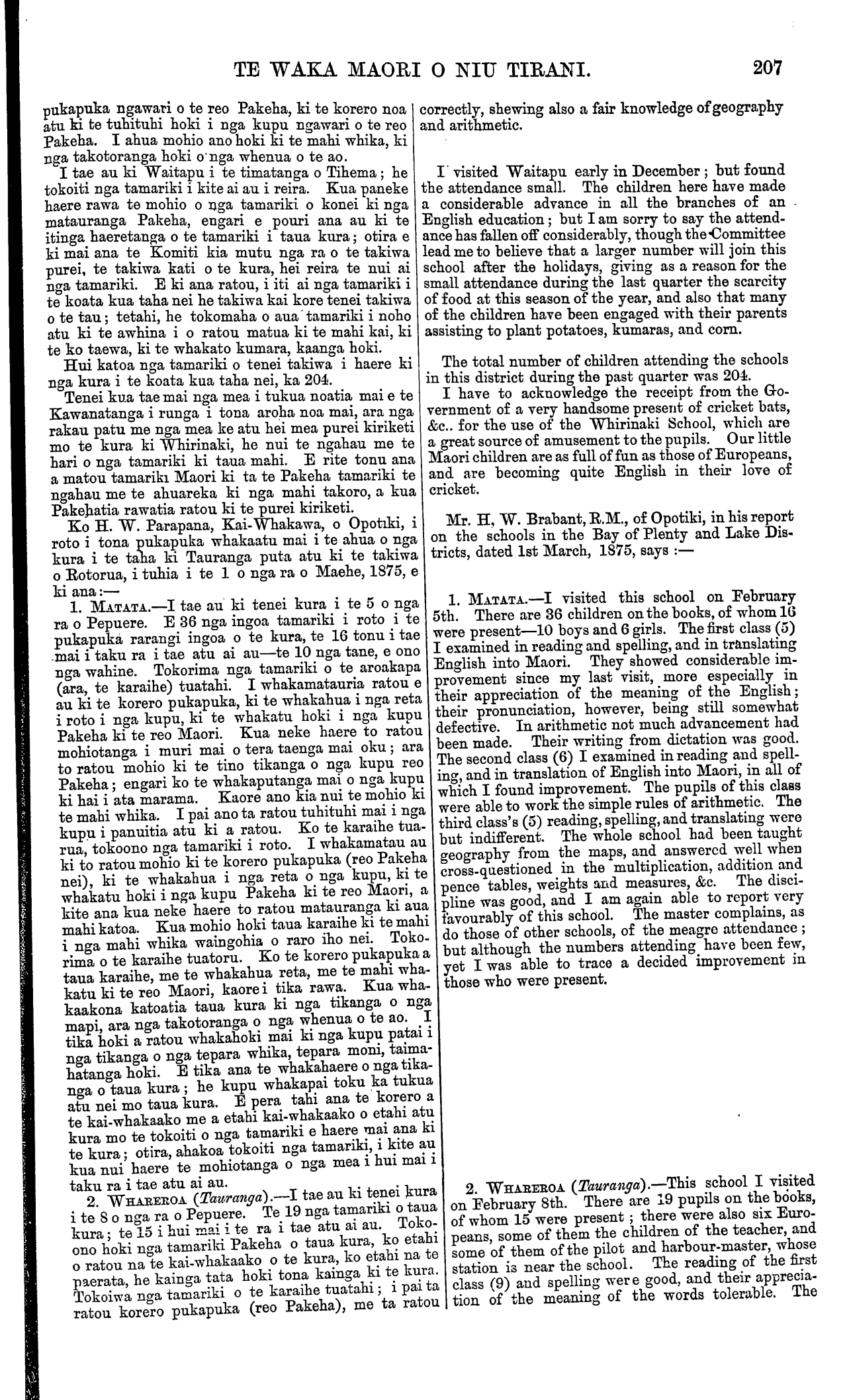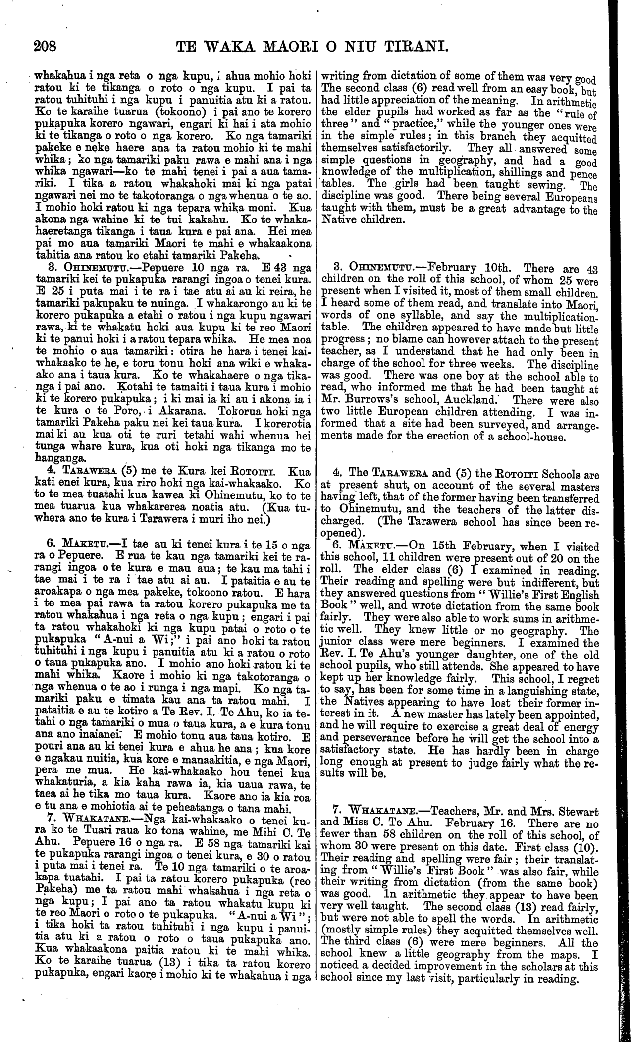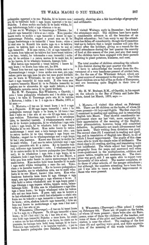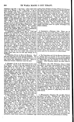 TE WAKA MAORI O NIU TIRANI. 207 pukapuka ngawari o te reo Pakeha, ki te korero noa atu ki te tuhituhi hoki i nga kupu ngawari o te reo Pakeha. I ahua mohio ano hoki ki te mahi whika, ki nga takotoranga hoki o nga whenua o te ao. I tae au ki Waitapu i te timatanga o Tihema ; he tokoiti nga tamariki i kite ai au i reira. Kua paneke haere rawa te mohio o nga tamariki o konei ki nga matauranga Pakeha, engari e pouri ana au ki te itinga haeretanga o te tamariki i taua kura; otira e ki mai ana te Komiti kia mutu nga ra o te takiwa purei, te takiwa kati o te kura, hei reira te nui ai nga tamariki. E ki ana ratou, i iti ai nga tamariki i te koata kua taha nei he takiwa kai kore tenei takiwa o te tau; tetahi, he tokomaha o aua "tamariki i noho atu ki te awhina i o ratou matua ki te mahi kai, ki te ko taewa, ki te whakato kumara, kaanga hoki. Hui katoa nga tamariki o tenei takiwa i haere ki nga kura i te koata kua taha nei, ka 204. Tenei kua tae mai nga mea i tukua noatia mai e te Kawanatanga i runga i tona aroha noa mai, ara nga rakau patu me nga mea ke atu hei mea purei kiriketi mo te kura ki Whirinaki, he nui te ngahau me te hari o nga tamariki ki taua mahi. E rite tonu ana a matou tamariki Maori ki ta te Pakeha tamariki te ngahau me te ahuareka ki nga mahi takoro, a kua Pakehatia rawatia ratou ki te purei kiriketi. Ko H. W. Parapana, Kai-Whakawa, o Opotiki, i roto i tona pukapuka whakaatu mai i te ahua o nga kura i te taha ki Tauranga puta atu ki te takiwa o Rotorua, i tuhia i te 1 o nga ra o Maehe, 1875, e ki ana:— 1. MATATA.—I tae au ki tenei kura i te 5 o nga ra o Pepuere. E 36 nga ingoa tamariki i roto i te pukapuka rarangi ingoa o te kura, te 16 tonu i tae -mai i taku ra i tae atu ai au—te 10 nga tane, e ono nga wahine. Tokorima nga tamariki o te aroakapa (ara, te karaihe) tuatahi. I whakamatauria ratou e au ki te korero pukapuka, ki te whakahua i nga reta i roto i nga kupu, ki te whakatu hoki i nga kupu Pakeha ki te reo Maori. Kua neke haere to ratou mohiotanga i muri mai o tera taenga mai oku ; ara to ratou mohio ki te tino tikanga o nga kupu reo Pakeha; engari ko te whakaputanga mai o nga kupu ki hai i ata marama. Kaore ano kia nui te mohio ki te mahi whika. I pai ano ta ratou tuhituhi mai i nga kupu i panuitia atu ki a ratou. Ko te karaihe tua- rua, tokoono nga tamariki i roto. I whakamatau au ki to ratou mohio ki te korero pukapuka (reo Pakeha nei), ki te whakahua i nga reta o nga kupu, ki te whakatu hoki i nga kupu Pakeha ki te reo Maori, a kite ana kua neke haere to ratou matauranga ki aua mahi katoa. Kua mohio hoki taua karaihe ki te mahi i nga mahi whika waingohia o raro iho nei. Toko- rima o te karaihe tuatoru. Ko te korero pukapuka a taua karaihe, me te whakahua reta, me te mahi wha- katu ki te reo Maori, kaore i tika rawa. Kua wha- kaakona katoatia taua kura ki nga tikanga o nga mapi, ara nga takotoranga o nga whenua o te ao. 1 tika hoki a ratou whakahoki mai ki nga kupu patai i nga tikanga o nga tepara whika, tepara moni, taima- hatanga hoki. E tika ana te whakahaere o nga tika- nga o taua kura ; he kupu whakapai toku ka tukua atu nei mo taua kura. E pera tahi ana te korero a te kai-whakaako me a etahi kai-whakaako o etahi atu kura mo te tokoiti o nga tamariki e haere mai ana ki te kura; otira, ahakoa tokoiti nga tamariki, i kite au kua nui haere te mohiotanga o nga mea i hui mai i taku ra i tae atu ai au. 2. WHAREROA. (Tauranga).—I tae au ki tenei kura i te 8 o nga ra o Pepuere. Te 19 nga tamariki o taua kura; te 15 i hui mai i te ra i tae atu ai au. Toko- ono hoki nga tamariki Pakeha o taua kura, ko etahi o ratou na te kai-whakaako o te kura, ko etahi na te paerata, he kainga tata hoki tona kainga ki te kura. Tokoiwa nga tamariki o te karaihe tuatahi; i pai ta ratou korero pukapuka (reo Pakeha), me ta ratou correctly, shewing also a fair knowledge of geography and arithmetic. I visited Waitapu early in December ; but found the attendance small. The children here have made a considerable advance in all the branches of an English education; but I am sorry to say the attend- ance has fallen off considerably, though the Committee lead me to believe that a larger number will join this school after the holidays, giving as a reason for the small attendance during the last quarter the scarcity of food at this season of the year, and also that many of the children have been engaged with their parents assisting to plant potatoes, kumaras, and corn. The total number of children attending the schools in this district during the past quarter was 204. I have to acknowledge the receipt from the Go- vernment of a very handsome present of cricket bats, &c.. for the use of the Whirinaki School, which are a great source of amusement to the pupils. Our little Maori children are as full of fun as those of Europeans, and are becoming quite English in their love of cricket. Mr. H, W. Brabant, R.M., of Opotiki, in his report on the schools in the Bay of Plenty and Lake Dis- tricts, dated 1st March, 1875, says ;— 1. MATATA.—I visited this school on February 5th. There are 36 children on the books, of whom 16 were present—10 boys and 6 girls. The first class (5) I examined in reading and spelling, and in translating English into Maori. They showed considerable im- provement since my last visit, more especially in their appreciation of the meaning of the English; their pronunciation, however, being still somewhat defective. In arithmetic not much advancement had been made. Their writing from dictation was good. The second class (6) I examined in reading and spell- ing, and in translation of English into Maori, in all of which I found improvement. The pupils of this class were able to work the simple rules of arithmetic. The third class's (5) reading, spelling, and translating were but indifferent. The whole school had been taught geography from the maps, and answered well when cross-questioned in the multiplication, addition and pence tables, weights and measures, &c. The disci- pline w
