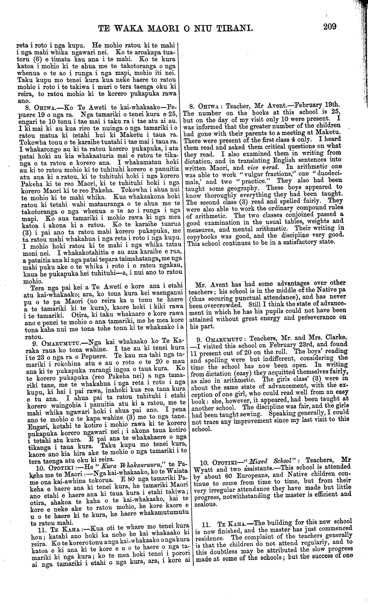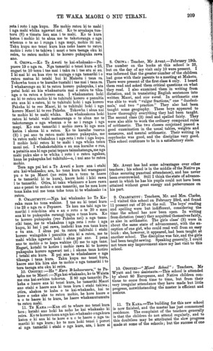206 TE WAKA MAORI O NIU TIRANI. Ko MERE HIHI. I mate ki Te Papatupu Manganuiateao, Whanganui, i te 23 o nga ra o Akuhata, 1875. Tokorua ana kotiro i mahue ki te ao nei ; ko Hinepare, ko Mere Tiria. He tangi tonu te mahi a aua kotiro, kaore hoki raua e pai kia whakamariretia raua. HEMA KAIAIA, he wahine no Ngaitahu. I mate ki Purakau- nui, Waikouaiti, i te 8 o nga ra o Akuhata, 1875. Ona tau e 75. Ko APORO IHAIA TE AHU, te tama kotahi a Te Rev. Ihaia Te Ahu, o Maketu, Pei-o-Pureti. I mate ki Po Neke, i te 29 o nga ra o Akuhata, 1875. Ona tau 10. TE UTU MO TE WAKA. Ko te utu mo te Waka Maori i te tau ka te 10s., he mea utu ki mua. Ka tukuna atu i te meera ki te tangata e Mahia ana me ka tukua mai e ia aua moni ki te Kai Tuhi ki Po Neke nei. PO NEKE, TUREI, HEPETEMA 21, 1875. NGA KITEA MAOEI. (He roanga no tera Waka.) Ko te korero e tirohia e matou inaianei ko ta Te Wana Tama, Kai-Whakawa, o Hokianga, i tuhia i te 7 o nga ra o Hanuere, 1875, E korero ana a ia mo nga Kura Maori e rima o tona takiwa, ka mea :— E rua o aua kura, ko to Pakia ko to Rakau Para, katahi ano ka whakaturia, ara i te koata kua taha nei, no reira e kore au e mohio ki te korero i te matauranga o nga tamariki o aua kura; he tane he wahine nga kaiwhakaako o tetahi o tetahi o aua kura. I kite au i aku taenga katoatanga ki aua kura, e tika tonu ana te whakahaere o te mahi. Kei Pakia e 41 te tuturutanga o te nui o nga tamariki e kura ana, takiono tae ki te tekau ma whitu o ratou tau; kei tenei tau e haere nei te nui ake ai pea nga tamariki o taua kura. Kei Rakau Para a 50 nga tamariki, tatakiono tae ki te tekau ma whitu o ratou tau. Tetahi, i runga i te tono a nga Maori, kua whakaturia e Te Haritini tetahi kura hei ako i nga tangata matua i te po. He tokomaha nga tangata e haere ana ki taua kura ako ai; ta ratou utu ki a Te Haritini, kotahi hereni a ia tangata a ia tangata i roto i te wiki kotahi. Ko Hori Karaka Tawhiti, te Tieamana o te Komiti o taua Kura, i ki mai ki au he tika kia hangaa te kura kia nui ake, no te mea, ki tana whakaaro, tera e tae ki te 80 nga tamariki i tenei whakatuwheratanga o te kura a muri ake nei. I te marama o Oketopa kua taha nei i tae au ki te kura o Waima i te pataitanga o nga tamariki; e 60 nga tamariki i tae mai i taua ra. Kai te neke haere to ratou mohio ki te korero pukapuka, ki te tuhituhi, ki te whakahua i nga reta i roto i nga kupu, ki te reo Pakeha hoki. I tukua ano etahi taonga ki nga mea mohio o nga tamariki hei whakakaha i a ratou; ko te utu i whakaritea mo te matauranga ki te reo Pakeha me te tuhituhi i te reo Pakeha i riro i a Kereama Tawhai, mokopuna a Mohi Tawhai. Kua maha aku taenga ki tenei kura i te hawhe tau kua hori nei, a e kite ana au i a te Mua, te kai-whakaako, e u tonu ana ki tana mahi, e wha- kahaere tika tonu ana i tana mahi, e ma tonu ana (ara, e paru-kore ana) nga tamariki me te rumu o te kura; hei tika mona ia, mo te kai-whakaako, hei rongo tika mo taua takiwa katoa hoki. Te tuturu- tanga o nga tamariki i taua kura i te koata kua taha nei, e 40. I pataitia e au nga tamariki o te Kura ki Whiri- naki i te 16 o nga ra o Tihema. E 41 aua tamariki i taua ra. I kite au i reira e pai ana te mahi a nga tamariki, e matau haere ana ; te 18 nga tamariki o te aroakapa tuatahi, i mohio katoa ratou ki te korero MEKE HIHI, at Te Papatupu Mauganuiateao, Whanganui on the 23rd day of August, 1875. She leaves two daughters, Hinepare and Mere Tina, who mourn continually for their loss, refusing to be comforted. HEMA KAIAIA, a Ngaitahu woman, at Purakaunui, Waikou- aiti, on the 8th of August, 1875, aged 75 years. APORO IHAIA TE AHU, only son of the Rev. Ihaia Te Ahu, of Maketu, Bay of Plenty, at Wellington, on the 29th of August, 1875, aged 10 years. TERMS OF SUBSCRIPTION. The Subscription to the Waka Maori is 10s. per year, payable in advance. Persons desirous of becoming subscribers can have ihe paper posted to their address by forwarding that amount to the Editor in Wellington. THE WAKA MAORI. ———— WELLINGTON, TUESDAY, SEPTEMBER 21, 1875. NATIVE SCHOOLS. (Continued from our last.) THE next report we shall notice is that of Mr. S. Von Stunner, R.M., of Hokianga, of date 7th January, 1875. This gentleman, speaking of the five Native schools in his district, says :— Two of them, viz:, those of Pakia and Rakau Para, having only been opened during the past quarter, I can make no report as to the progress of the pupils; in each case they are presided over by a master and mistress. On every occasion that I have visited these schools I have found them properly conducted. At Pakia the attendance since the commencement has averaged 41, of all ages from six to seventeen years, and the numbers are likely to be more nume- rous during the present year. At Rakau Para the attendance has been 50, between the ages of six and seventeen years : in addition to this, Mr. Harrison, the teacher of this school, has, at the request of the Natives, opened a night school for the instruction of adults, which has been well attended, each pupil pay- ing Mr. Harrison one shilling per week, Hori Karaka Tawhiti, the Chairman of School Com- mittee, informs me that he believes it will be neces- sary to enlarge the schoolroom, as at the re-opening of the school he anticipates an attendance of upwards of 80 children In October last I attended an examination of the school children at Waima, when upwards of 60 pupils were in attendance, and the progress made by them in reading, writing and spelling, and the English language, was most marked. Several small prizes were given to the more advanced pupils, the prize for speaking and writing English being awarded to Kere- ama Tawhai, grandson of Mohi Tawhai. I have visited this school several times during the half-year last past, and have always found Mr. Moore, the teacher, at his post, doing his duty in a most efficient manner, his pupils and schoolroom neat and clean, a credit to himself and the district. The attendance for the past quarter at this school has aver