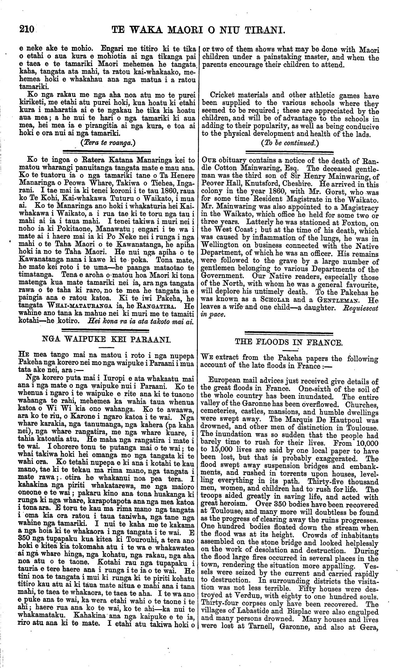 210 TE WAKA MAORI O NIU TIRANI. e neke ake te mohio. Engari me titiro ki te tika o etahi o aua kura e mohiotia ai nga tikanga pai e taea e te tamariki Maori mehemea he tangata, kaha, tangata ata mahi, ta ratou kai-whakaako, me- hemea hoki e whakahau ana nga matua i a ratou tamariki. Ko nga rakau me nga aha noa atu mo te purei kiriketi, me etahi atu purei hoki, kua hoatu ki etahi kura i maharatia ai e te ngakau he tika kia hoatu aua mea; a he nui te hari o nga tamariki ki aua mea, hei mea ia e pirangitia ai nga kura, e toa ai hoki e ora nui ai nga tamariki. (Tera te roanga.) Ko te ingoa o Ratera Katana Manaringa kei to matou wharangi panuitanga tangata mate e mau ana. Ko te tuatoru ia o nga tamariki tane o Ta Henere Manaringa o Peowa Whare, Takiwa o Tiehea, Inga- rani. I tae mai ia ki tenei koroni i te tau 1860, raua ko Te Kohi, Kai-whakawa Tuturu o Waikato, i mua ai. Ko te Manaringa ano hoki i whakaturia hei Kai- whakawa i Waikato, a i rua tae ki te toru nga tau i mahi ai ia i taua mahi. I tenei takiwa i muri nei i noho ia ki Pokitaone, Manawatu; engari i te wa i mate ai i haere mai ia ki Po Neke nei i runga i nga mahi o te Taha Maori o te Kawanatanga, he apiha hoki ia no te Taha Maori. He nui nga apiha o te Kawanatanga nana i kawe ki te poka. Tona mate, he mate kei roto i te uma—he paanga mataotao te timatanga. Tena e aroha o-matou hoa Maori ki tona matenga kua mate tamariki nei ia, ara nga tangata rawa o te taha ki raro, no te mea he tangata ia e paingia ana e ratou katoa. Ki te iwi Pakeha, he tangata WHAI-MATAURANGA ia, he RANGATIRA. He wahine ano tana ka mahue nei ki muri me te tamaiti kotahi—he kotiro. Hei kona ra ia ata takoto mai ai. NGA WAIPUKE KEI PARAANI. HE mea tango mai na matou i roto i nga nupepa Pakeha nga korero nei mo nga waipuke i Paraani i mua tata ake nei, ara:— Nga korero puta mai i Iuropi e ata whakaatu mai ana i nga mate o nga waipuke nui i Paraani. Ko te whenua i ngaro i te waipuke e rite ana ki te tuaono wahanga te rahi, mehemea ka wahia taua whenua katoa o Wi Wi kia ono wahanga. Ko te awaawa, ara ko te riu, o Karone i ngaro katoa i te wai. Nga whare karakia, nga tanumanga, nga kahera (pa kaha nei), nga whare rangatira, me nga whare kuare, i tahia katoatia atu, He maha nga rangatira i mate i te wai. I ohorere tonu te putanga mai o te wai; te whai takiwa hoki hei omanga mo nga tangata ki te wahi ora. Ko tetahi nupepa e ki ana i kotahi te kau mano, tae ki te tekau ma rima mano, nga tangata i mate rawa;. otira he whakanui noa pea tera. I kahakina nga piriti whakatarewa, me nga maioro oneone e te wai ; pakaru kino ana tona huakanga ki runga ki nga whare, karapotapota ananga mea katoa i tona ara. E toru te kau ma rima mano nga tangata i oma kia ora ratou i taua taniwha, nga tane nga wahine nga tamariki. I nui te kaha me te kakama a nga hoia ki te whakaora i nga tangata i te wai. E 350 nga tupapaku kua kitea ki Tourouhi, a tera ano hoki e kitea kia tokomaha atu i te wa e whakawatea ai nga whare hinga, nga kohatu, nga rakau, nga aha noa atu o te taone. Kotahi rau nga tupapaku i tauria e tere haere ana i runga i te ia o te wai. He tini noa te tangata i mui ki runga ki te piriti kohatu titiro kau atu ai ki taua mate aitua e mahi ana i tana mahi, te taea te whakaora, te taea te aha. I te wa ano e puke ana te wai, ka wera etahi wahi o te taone i te ahi; haere rua ana ko te wai, ko te ahi—ka nui te whakamataku. Kahakina ana nga kaipuke e te ia, riro atu aua ki te mate. I etahi atu takiwa hoki o or two of them shows what may be done with Maori children under a painstaking master, and when the parents encourage their children to attend. Cricket materials and other athletic games have been supplied to the various schools where they seemed to be required; these are appreciated by the children, and will be of advantage to the schools in adding to their popularity, as well as being conducive to the physical development and health of the lads. (To be continued.) OUE obituary contains a notice of the death of Ran- dle Cotton Mainwaring, Esq. The deceased gentle- man was the third son of Sir Henry Mainwaring, of Peover Hall, Knutsford, Cheshire. He arrived in this colony in the year 1860, with Mr. Gorst, who was for some time Resident Magistrate in the Waikato. Mr. Mainwaring was also appointed to a Magistracy in the Waikato, which office he held for some two or three years. Latterly he was stationed at Foxton, on the West Coast; but at the time of his death, which was caused by inflammation of the lungs, he was in Wellington on business connected with the Native Department, of which he was an officer. His remains were followed to the grave by a large number of gentlemen belonging to various Departments of the Government. Our Native readers, especially those of the North, with whom he was a general favourite, will deplore his untimely death. To the Pakehas he was known as a SCHOLAR and a GENTLEMAN. He leaves a wife and one child—a daughter. Requiescat in pace. THE FLOODS IN FRANCE. WE extract from the Pakeha papers the following account of the late floods in France:— European mail advices just received give details of the great floods in France. One-sixth of the soil of the whole country has been inundated. The entire valley of the Garonne has been overflowed. Churches, cemeteries, castles, mansions, and humble dwellings were swept away. The Marquis De Hautpoul was drowned, and other men of distinction in Toulouse. The inundation was so sudden, that the people had barely time to rush for their lives. From 10,000 to 15,000 lives are said by one local paper to have been lost, but that is probably exaggerated. The flood swept away suspension bridges and embank- ments, and rushed in torrents upon houses, level- ling everything in its path. Thirty-five thousand men, women, and children had to rush for life. The troops aided greatly in saving life, and acted with great heroism. Over 350 bodies have been recovered at Toulouse, and many more will doubtless be found as the progres