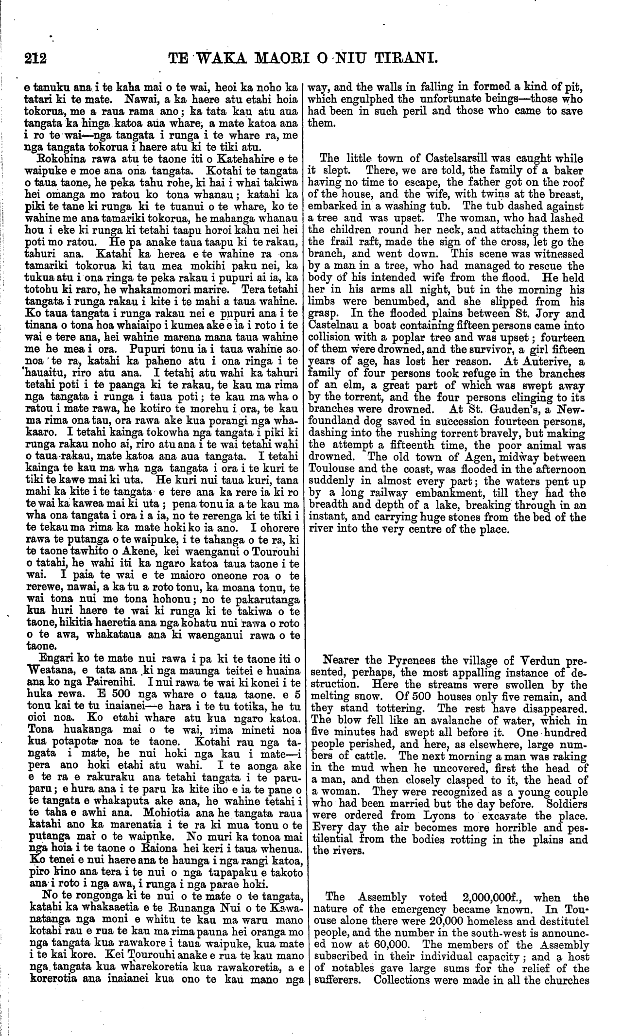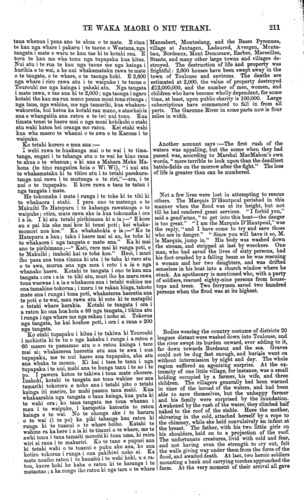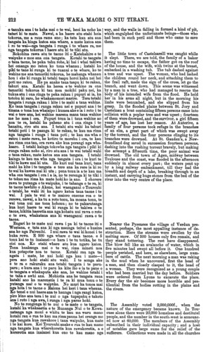 212 TE WAKA MAORI O NIU TIRANI. e tanuku ana i te kaha mai o te wai, heoi ka noho ka tatari ki te mate. Nawai, a ka haere atu etahi hoia tokorua, me a raua rama ano; ka tata kau atu aua tangata ka hinga katoa aua whare, a mate katoa ana i ro te wai—nga tangata i runga i te whare ra, me nga tangata tokorua i haere atu ki te tiki atu. Rokohina rawa atu te taone iti o Katehahire e te waipuke e moe ana ona tangata. Kotahi te tangata o taua taone, he peka tahu rohe, ki hai i whai takiwa hei omanga mo ratou ko tona whanau; katahi ka i piki te tane ki runga ki te tuanui o te whare, ko te wahine me ana tamariki tokorua, he mahanga whanau hou i eke ki runga ki tetahi taapu horoi kahu nei hei poti mo ratou. He pa anake taua taapu ki te rakau, tahuri ana. Katahi ka herea e te wahine ra ona tamariki tokorua ki tau mea mokihi paku nei, ka tukua atu i ona ringa te peka rakau i pupuri ai ia, ka totohu ki raro, he whakamomori marire. Tera tetahi tangata i runga rakau i kite i te mahi a taua wahine. Ko taua tangata i runga rakau nei e pupuri ana i te tinana o tona hoa whaiaipo i kumea ake e ia i roto i te wai e tere ana, hei wahine marena mana taua wahine me he mea i ora. Pupuri tonu ia i taua wahine ao noa te ra, katahi ka paheno atu i ona ringa i te hauaitu, riro atu ana. I tetahi atu wahi ka tahuri tetahi poti i te paanga ki te rakau, te kau ma rima nga tangata i runga i taua poti; te kau ma wha o ratou i mate rawa, he kotiro te morehu i ora, te kau ma rima ona tau, ora rawa ake kua porangi nga wha- kaaro. I tetahi kainga tokowha nga tangata i piki ki runga rakau noho ai, riro atu ana i te wai tetahi wahi o taua-rakau, mate katoa ana aua tangata. I tetahi kainga te kau ma wha nga tangata i ora i te kuri te tiki te kawe mai ki uta. He kuri nui taua kuri, tana mahi ka kite i te tangata e tere ana ka rere ia ki ro te wai ka kawea mai ki uta ; pena tonu ia a te kau ma wha ona tangata i ora i a ia, no te rerenga ki te tiki i te tekau ma rima ka mate hoki ko ia ano. I ohorere rawa te putanga o te waipuke, i te tahanga o te ra, ki te taone tawhito o Akene, kei waenganui o Tourouhi o tatahi, he wahi iti ka ngaro katoa taua taone i te wai. I paia te wai e te maioro oneone roa o te rerewe, nawai, a ka tu a roto tonu, ka moana tonu, te wai tona nui me tona hohonu; no te pakarutanga kua huri haere te wai ki runga ki te takiwa o te taone, hikitia haeretia ana nga kohatu nui rawa o roto o te awa, whakataua ana ki waenganui rawa o te taone. Engari ko te mate nui rawa i pa ki te taone iti o Weatana, e tata ana ki nga maunga teitei e huaina ana ko nga Pairenihi. I nui rawa te wai ki konei i te huka rewa. E 500 nga whare o taua taone e 5 tonu kai te tu inaianei—e hara i te tu totika, he tu oioi noa. Ko etahi whare atu kua ngaro katoa. Tona huakanga mai o te wai, rima mineti noa kua potapota noa te taone. Kotahi rau nga ta- ngata i mate, he nui hoki nga kau i mate—i pera ano hoki etahi atu wahi. I te aonga ake e te ra e rakuraku ana tetahi tangata i te paru- paru ; e hura ana i te paru ka kite iho e ia te pane o te tangata e whakaputa ake ana, he wahine tetahi i te taha e awhi ana. Mohiotia ana he tangata raua I katahi ano ka marenatia i te ra ki mua tonu o te putanga mar o te waipuke. No muri ka tonoa mai nga hoia i te taone o Raiona hei keri i taua whenua. Ko tenei e nui haere ana te haunga i nga rangi katoa, piro kino ana tera i te nui o nga tupapaku e takoto ana i roto i nga awa, i runga i nga parae hoki. No te rongonga ki te nui o te mate o te tangata, katahi ka whakaaetia e te Runanga Nui o te Kawa- natanga nga moni e whitu te kau ma waru mano kotahi rau e rua te kau ma rima pauna hei oranga mo nga tangata kua rawakore i taua waipuke, kua mate i te kai kore. Kei Tourouhi anake e rua te kau mano nga. tangata kua wharekoretia kua rawakoretia, a e korerotia ana inaianei kua ono te kau mano nga way, and the walls in falling in formed a kind of pit, which engulphed the unfortunate beings—those who had been in such peril and those who came to save them. The little town of Castelsarsill was caught while it slept. There, we are told, the family of a baker having no time to escape, the father got on the roof of the house, and the wife, with twins at the breast, embarked in a washing tub. The tub dashed against a tree and was upset. The woman, who had lashed the children round her neck, and attaching them to the frail raft, made the sign of the cross, let go the branch, and went down. This scene was witnessed by a man in a tree, who had managed to rescue the body of his intended wife from the flood. He held her in his arms all night, but in the morning his limbs were benumbed, and she slipped from his grasp. In the flooded plains between St. Jory and Castelnau a boat containing fifteen persons came into collision with a poplar tree and was upset; fourteen of them were drowned, and the survivor, a girl fifteen years of age, has lost her reason. At Auterive, a family of four persons took refuge in the branches of an elm, a great part of which was swept away by the torrent, and the four persons clinging to its branches were drowned. At St. Gauden's, a New- foundland dog saved in succession fourteen persons, dashing into the rushing torrent bravely, but making the attempt a fifteenth time, the poor animal was drowned. The old town of Agen, midway between Toulouse and the coast, was flooded in the afternoon suddenly in almost every part; the waters pent up by a long railway embankment, till they had the breadth and depth of a lake, breaking through in an instant, and carrying huge stones from the bed of the river into the very centre of the place. Nearer the Pyrenees the village of Verdun pre- sented, perhaps, the most appalling instance of de- struction. Here the streams were swollen by the melting snow. Of 500 houses only five remain, and they stand tottering. The rest have disappeared. The blow fell like an avalanche of water, which in five minutes had swept all before it. One hundred people perished, and here, as els