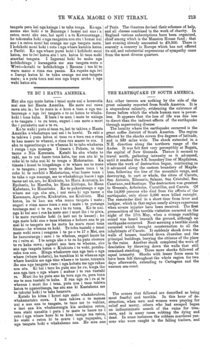 TE WAKA MAORI O NIU TIRANI. 213 tangata pera kei nga kainga i te taha tonga. Ko nga mema ano hoki o te Runanga i homai nui ano i a ratou moni ake ano, hei apiti i a te Kawanatanga ; he tokomaha hoki o nga rangatira noa atu i homai nui ano i a ratou moni hei oranga mo nga tangata mate. I kohikohi moni hoki i roto i nga whare karakia katoa o Parihi. Ko nga whare purei hoki i kohikohi moni katoa, me te iwi katoa atu i uru katoa ki taua mahi atawhai tangata. I Ingarani hoki he maha nga kohikohinga i karangatia mo aua tangata mate o Wiwi—kotahi te kohikohinga i Ranana i tae ki te waru mano e rima rau pauna. Ka rupeke nga iwi o Iuropi katoa ki te tuku oranga mo aua tangata mate; a e puta tonu mai aua nga kupu aroha i nga wahi katoa atu. TE RU I HAUTA AMERIKA. HEI aha nga mate katoa i tenei mate nui e korerotia mai ana kei Hauta Amerika. He mate nui rawa rawa atu ia; he tu mate ia e kore e taea e nga ma- tauranga o nga iwi tangata o te ao katoa te whaka- hoki i tona kaha. E hara i te mea i mate te nuinga o te tangata i te ru tonu, engari i ona mate o muri iho i putaketia mai e te ru. Ko te wahi i puta ai taua ru, kei te takiwa o Hauta Amerika e whakatupu mai nei i te kawhi. Te rahi o te takiwa i puta katoa ai taua ru e toru rau e rima te kau maero te whanui, e rima rau maero te roa. I ahu te ngateritanga o te whenua ki te taha whakarua i runga i nga maunga, I timata i Pokata, te tino taone o Niu Karanata. Katahi ka ahu whaka te raki, me te nui haere tona kaha, tae noa atu ki te rohe ki te taha mai ki te tonga o Makatarina. Ka timata i konei te hingahinga o te whare me te mate o te tangata ; pena tonu te ahua haere tonu i te rohe ki te rawhiti o Makatarina, whai haere tonu i te taha o nga maunga, me te whakahinga haere i nga taone nei na, ara, ko Kiukiuta, ko Hana Anatonia, ko Epoherio, ko Hareiha, ko Hana Kiritopa, ko Hana Kahetano, ko Hanatieko. Ko te pakarutanga o nga whare me nga aha atu, i nui rawa ki nga taone o Karamaro, Aporita, Kiukiutira, me Kiukiuta. Hui katoa, ka te kau ma wha mano tangata i mate ; engari e rima mano tonu o ena i mate i te putanga toutanga mai o te ru, ara i te ru tonu. Ko te nui- nga ki hai ano i roa ka mate ano i muri iho i te piwa, i te mate rurutake hoki (e kati nei te kauae) ; ko nga mate hoki ena o taua whenua e hohoro ana te pa mai ki te tangata me ka motu ka maru ranei tona tinana—he whenua ra hoki. Te tohu tuatahi o tenei mate wehi rawa i rongona i te po o te 17 o Mei, ara he harurutanga i raro i te whenua, engari kaore he ru i reira ai. I te aonga ake o te ra ka puta ohorere te ru kaha rawa ; ngateri ana tera te whenua, oho ana nga tangata katoa o Kiukiuta i te wehi, porahu- rahu noa ana. Hinga whakarere ana nga tara o nga whare (whare kohatu), ka turakina ki te whenua nga whare karakia me nga tino whare o te taone, tanumia iho ana nga tangata i raro i nga kohatu me nga rakau noa atu. Ki hai i taro ka puta ano he ru, hinga iho aua nga tara o nga whare i mahue i te rua tuatahi ra Muri iho ka puta ano ka toru nga ru, pera tonu me te mea tuatahi te kaha. E rua nga ra i ru ai te whenua i muri iho i tena, puta noa i taua takiwa katoa te ngateritanga, tae atu ana ki Kaatahena me te takutai hoki i te taha hauauru. Katahi ka kitea i konei nga mahi whakahouhou, whakamataku rawa. I taua takiwa o te mamae nui e aue ana te tangata, te tane me te wahine, e inoi ana kia whakaorangia kia arohaina ratou, tera etahi nanakia i puta i te mate te haere na i roto i nga whare horo ki te kimi taonga ma ratou, ko etahi o ratou ki te -muru i nga tupapaku, i nga tangata hoki e whakahemo ana. He mea ano of Paris. The theatres devised their schemes of help, and all classes combined in the work of charity. In England various subscriptions have been organized, chief among which is the Mansion House fund ; that last evening already amounted to £8,500. There is scarcely a country in Europe which has not offered its aid, and substantial expressions of sympathy came from the most diverse quarters. THE EARTHQUAKE IN SOUTH AMERICA. ALL other terrors are nothing by the side of the great calamity reported from South America. It is a stupendous calamity, evidencing the existence of forces before which the whole human race is power- less. It appears that the loss of life was due less to direct than the indirect effects of the earthquake through supervening disease. The locality where the earthquake occurred is the great coffee district of South America. The region affected by the shocks covers five degrees of latitude, and is 500 miles wide. The shock extended in a N.E. direction along the northern range of the Andes. It was felt first very perceptibly at Bogata, the capital of New Granada. Thence it seemed to travel north, gathering intensity as it advanced, until it reached the S.E. boundary line of Magdalena, where the work of destruction began, continuing, as it advanced along the eastern boundary of Magda- lena, following the line of the mountain range, and destroying, in part or whole, the cities of Cucuta, San Antonia, Elbosario, Salazar, San Cristobal, San Cazetano, and Santiago. The destruction was greatest in Gramalo, Arboledas, Cucutillas, and Cucuta. Of the 14,000 persons who died from the effects of the earthquake, only about 5,000 were killed outright. The remainder died in a short time from lever and lockjaw, which in that region nearly always supervene when severe injuries have been received. The first premonition of the terrible visitation occurred on the night of the 17th May, when a strange rumbling sound was heard beneath the ground, although no earthquake occurred. Next morning a terrible shock occurred which brought consternation to all the inhabitants of Cucuta. It suddenly shook down the walls of houses, tumbled down churches and the principal buildings, burying the citizens of the place in the ruins. Another shock completed the work of desolation by throwing down the walls that still remained standing. Three more shocks followed of equal intensity. Shocks with lesser
