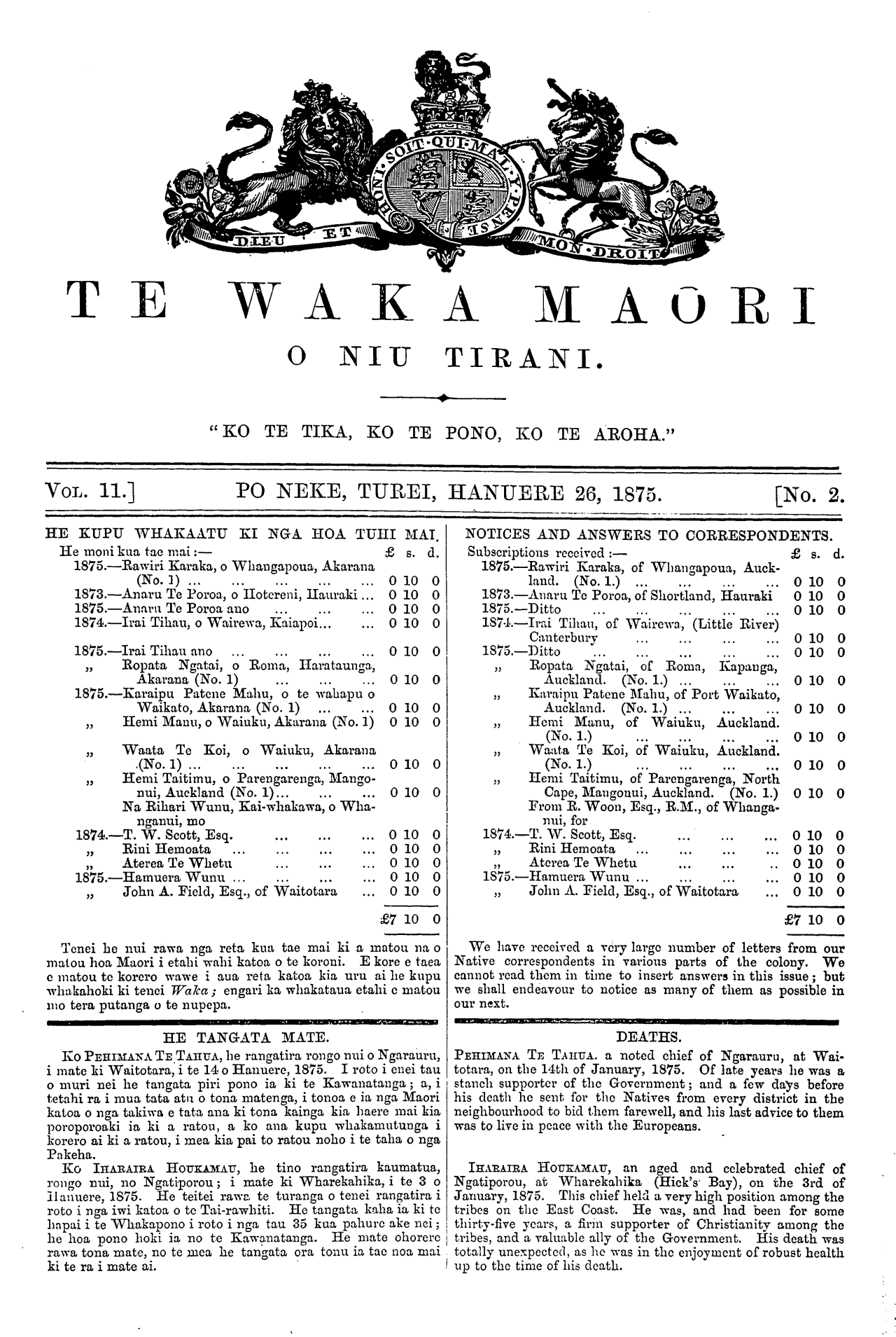 Te Waka Maori o Niu Tirani 1871-1877: Volume 11, Number 2. 26 January 1875 |