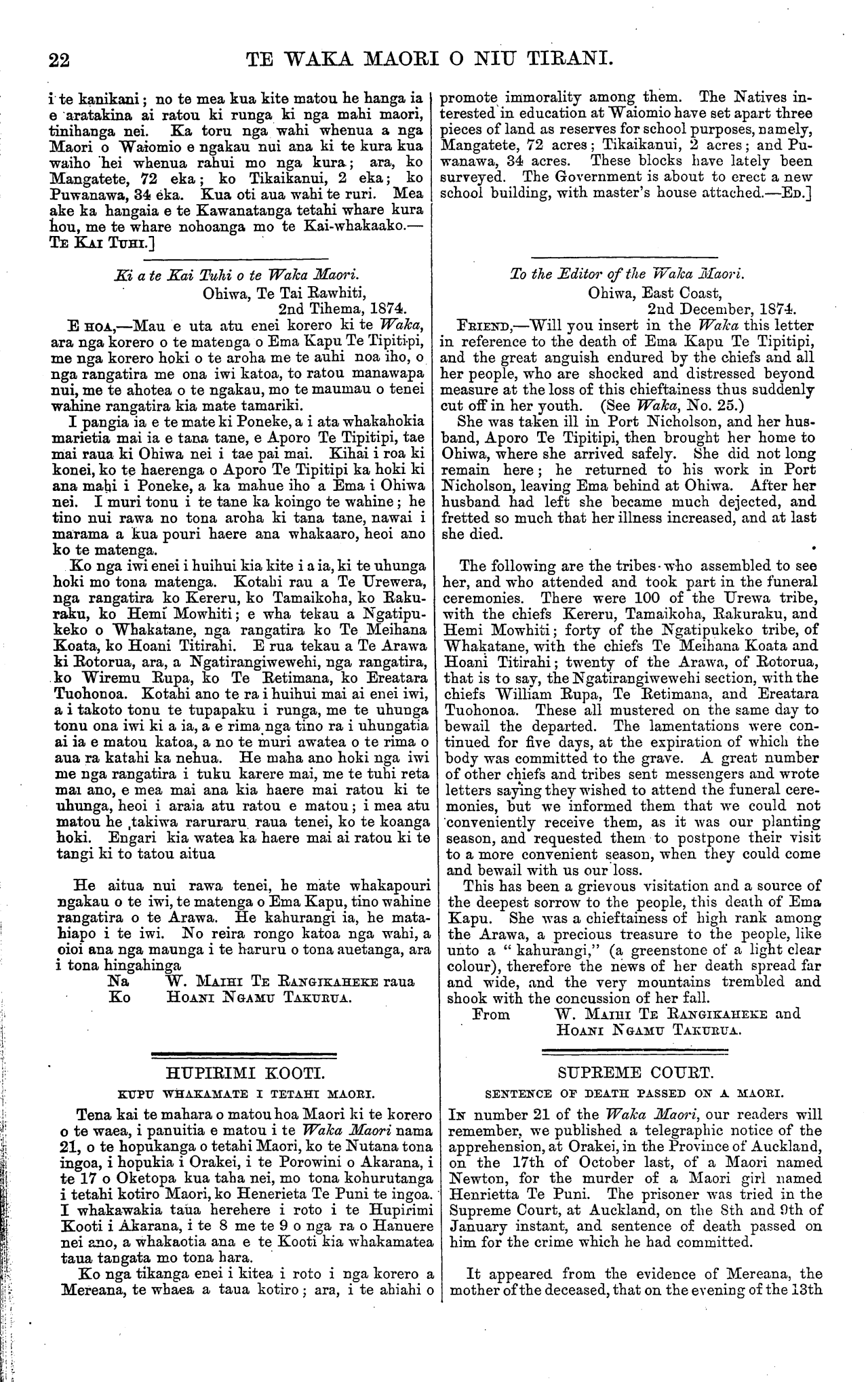22 TE WAEA MAORI O NIU TIRANI. i te kanikani; no te mea kua kite matou he hanga ia e aratakina ai ratou ki runga ki nga mahi maori, tinihanga nei. Ka toru nga wahi whenua a nga Maori o Waiomio e ngakau nui ana ki te kura kua waiho hei whenua rahui mo nga kura.; ara, ko Mangatete, 72 eka; ko Tikaikanui, 2 eka; ko Puwanawa, 34 eka. Kua oti aua wahi te ruri. Mea ake ka hangaia e te Kawanatanga tetahi whare kura hou, me te whare nohoanga mo te Kai-whakaako.— TE KAI TUHI.] Ki a te Kai Tuhi o te Waka Maori. Ohiwa, Te Tai Rawhiti, 2nd Tihema, 1874. E HOA,—Mau e uta atu enei korero ki te Waka, ara nga korero o te matenga o Ema Kapu Te Tipitipi, me nga korero hoki o te aroha me te auhi noa iho, o nga rangatira me ona iwi katoa, to ratou manawapa nui, me te ahotea o te ngakau, mo te maumau o tenei wahine rangatira kia mate tamariki. I pangia ia e te mate ki Poneke, a i ata whakahokia marietia mai ia e tana tane, e Aporo Te Tipitipi, tae mai raua ki Ohiwa nei i tae pai mai. Kihai i roa ki konei, ko te haerenga o Aporo Te Tipitipi ka hoki ki ana mahi i Poneke, a ka mahue iho a Ema i Ohiwa nei. I muri tonu i te tane ka koingo te wahine; he tino nui rawa no tona aroha ki tana tane, nawai i marama a kua pouri haere ana whakaaro, heoi ano ko te matenga. Ko nga iwi enei i huihui kia kite i a ia, ki te uhunga hoki mo tona matenga. Kotahi rau a Te Urewera, nga rangatira ko Kereru, ko Tamaikoha, ko Raku- raku, ko Hemi Mowhiti; e wha tekau a Ngatipu- keko o Whakatane, nga rangatira ko Te Meihana Koata, ko Hoani Titirahi. E rua tekau a Te Arawa ki Rotorua, ara, a Ngatirangiwewehi, nga rangatira, ko Wiremu Rupa, ko Te Retimana, ko Ereatara Tuohonoa. Kotahi ano te ra i huihui mai ai enei iwi, a i takoto tonu te tupapaku i runga, me te uhunga tonu ona iwi ki a ia, a e rima nga tino ra i uhungatia ai ia e matou katoa, a no te muri awatea o te rima o aua ra katahi ka nehua. He maha ano hoki nga iwi me nga rangatira i tuku karere mai, me te tuhi reta mai ano, e mea mai ana kia haere mai ratou ki te uhunga, heoi i araia atu ratou e matou; i mea atu matou he takiwa raruraru raua tenei, ko te koanga hoki. Engari kia watea ka haere mai ai ratou ki te tangi ki to tatou aitua He aitua nui rawa tenei, he mate whakapouri ngakau o te iwi, te matenga o Ema Kapu, tino wahine rangatira o te Arawa. He kahurangi ia, he mata- hiapo i te iwi. No reira rongo katoa nga wahi, a oioi ana nga maunga i te haruru o tona auetanga, ara i tona hingahinga Na W. MAIHI TE RANGIKAHEKE raua Ko HOANI NGAMU TAKURUA. HUPIRIMI KOOTI. KUPU WHAKAMATE I TETAHI MAORI. Tena kai te mahara o matou hoa Maori ki te kore.ro o te waea, i panuitia e matou i te Waka Maori nama 21, o te hopukanga o tetahi Maori, ko te Nutana tona ingoa, i hopukia i Orakei, i te Porowini o Akarana, i te 17 o Oketopa kua taha nei, mo tona kohurutanga i tetahi kotiro Maori, ko Henerieta Te Puni te ingoa. I whakawakia taua herehere i roto i te Hupirimi Kooti i Akarana, i te 8 me te 9 o nga ra o Hanuere nei ano, a whakaotia ana e te Kooti kia whakamatea taua tangata mo tona hara. Ko nga tikanga enei i kitea i roto i nga korero a Mereana, te whaea a taua kotiro ; ara, i te ahiahi o promote immorality among them. The Natives in- terested in education at Waiomio have set apart three pieces of land as reserves for school purposes, namely, Mangatete, 72 acres ; Tikaikanui, 2 acres ; and Pu- wanawa, 34 acres. These blocks have lately been surveyed. The Government is about to erect a new school building, with master's house attached.—ED.] To the Editor of the Waka Maori. Ohiwa, East Coast, 2nd December, 1874. FRIEND,—Will you insert in the Waka this letter in reference to the death of Ema Kapu Te Tipitipi, and the great anguish endured by the chiefs and all her people, who are shocked and distressed beyond measure at the loss of this chieftainess thus suddenly cut off in her youth. (See Waka, No. 25.) She was taken ill in Port Nicholson, and her hus- band, Aporo Te Tipitipi, then brought her home to Ohiwa, where she arrived safely. She did not long remain here; he returned to his work in Port Nicholson, leaving Ema behind at Ohiwa. After her husband had left she became much dejected, and fretted so much that her illness increased, and at last she died. • The following are the tribes who assembled to see her, and who attended and took part in the funeral ceremonies. There were 100 of the Urewa tribe, with the chiefs Kereru, Tamaikoha, Rakuraku, and Hemi Mowhiti; forty of the Ngatipukeko tribe, of Whakatane, with the chiefs Te Meihana Koata and Hoani Titirahi; twenty of the Arawa, of Rotorua, that is to say, the Ngatirangiwewehi section, with the chiefs William Rupa, Te Retimana, and Ereatara Tuohonoa. These all mustered on the same day to bewail the departed. The lamentations were con- tinued for five days, at the expiration of which the body was committed to the grave. A great number of other chiefs and tribes sent messengers and wrote letters saying they wished to attend the funeral cere- monies, but we informed them that we could not conveniently receive them, as it was our planting season, and requested them to postpone their visit to a more convenient season, when they could come and bewail with us our loss. This has been a grievous visitation and a source of the deepest sorrow to the people, this death of Ema Kapu. She was a chieftainess of high rank among the Arawa, a precious treasure to the people, like unto a " kahurangi," (a greenstone of a light clear colour), therefore the news of her death spread far and wide, and the very mountains trembled and shook with the concussion of her fall. From W. MAIHI TE RANGIKAHEKE and HOANI NGAMU TAKURUA. SUPREME COURT. SENTENCE OF DEATH PASSED ON A MAORI. IN number 21 of the Waka Maori, our readers will remember, we published a telegraphic notice of the apprehension, at Orakei, in the Province of Auckland, on the 17th of October last, of a Maori named Newton, for the murder of a Maori girl named Henrietta Te Puni. The prisoner was tried