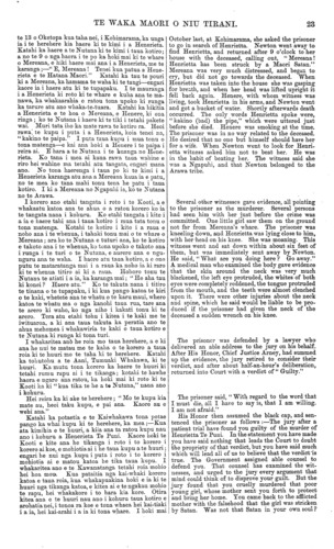 TE WAKA MAORI O NIU TIRANI. 23 te 13 o Oketopa kua taha nei, i Kohimarama, ka unga ia i te herehere kia haere ki te kimi i a Henerieta. Katahi ka haere a te Nutana ki te kimi i taua kotiro a no te 9 o nga haora i te po ka hoki mai ki te whare o Mereana, e hiki haere mai ana i a Henerieta, me te karanga;—" E, Mereana ! Tenei kua patua a Hene- rieta e te Hatana Maori." Katahi ka tau te pouri ki a Mereana, ka hamama te waha ki te tangi—engari kaore ia i haere atu ki te tupapaku. I te mauranga i a Henerieta Id roto ki te whare e kuha ana te ma- nawa, ka whakaarahia e ratou tona upoko ki runga ka tarure atu ano whaka-te-tuara. Katahi ka hikitia a Henerieta e te hoa o Mereana, e Henere, ki ona ringa ; ko te Nutana i haere ki te tiki i tetahi pakete wai. Muri tata iho ka mate rawa te kotiro ra. Heoi rawa te kupu i puta i a Henerieta, koia tenei na, "kakino te paipa." I puta taua kupu i mua tonu o tona matenga—e kai ana hoki a Henere i te paipa i reira ai. E hara a te Nutana i te huanga no Hene- rieta. Ko tana i mea ai kaua rawa taua wahine e riro hei wahine ma tetahi atu tangata, engari mana ano. No toua haerenga i taua po ki te kimi i a Henerieta karanga atu ana a Mereana kaua ia e patu, no te mea ko tana mahi tonu tena he patu i taua kotiro. I ki a Mereana no Ngapuhi ia, ko te Nutana no te Arawa. I korero ano etahi tangata i roto i te Kooti, a e whakaatu katoa ana te ahua o a ratou korero ko ia te tangata nana i kohuru. Ko etahi tangata i kite i a ia e haere tahi ana i taua kotiro i mua tata tonu o tona matenga. Kotahi te kotiro i kite i a raua e noho ana i te whenua, i tahaki tonu mai o te whare o Mereana; ara ko te Nutana e tuturi ana, ko te kotiro e takoto ana i te whenua, ko tona upoko e takoto ana i runga i te turi o te Nutana, e aurere ana e ngu- nguru ana te waha. I haere atu taua kotiro, a e ono putu te mataratanga mai i a raua ka noho ia ki raro ki te whenua titiro ai ki a raua. Hohoro tonu te Nutana te atiati i a ia, ka karanga mai; " He aha tau ki konei ? Haere atu." Ko te takuta nana i titiro te tinana o te tupapaku, i ki kua pango katoa te kiri o te kaki, whetete ana te whatu o to karu maui, whero katoa te whatu ma o nga kanohi taua rua, tare ana te arero ki waho, ko nga niho i kakati tonu ki te arero. Tera atu etahi tohu i kitea i te kaki me te iwituaroa, a ki ana taua takuta ka peratia ano te ahua mehemea i whakawiria te kaki o taua kotiro e te Nutana ki runga ki tona turi. I whakaritea ano he roia mo taua herehere, a e ki ana he nui te matau me te kaha o te korero a taua roia ki te huuri mo te taha ki to herehere. Katahi ka tohutohu a te Aani, Tumuaki Whakawa, ki te huuri. Ka mutu tona korero ka haere te huuri ki tetahi rumu rapu ai i te tikanga; kotahi te hawhe haora e ngaro aua ratou, ka hoki mai ki roto ki te Kooti ka ki <( kua tika te he a te Nutana," uaua ano i kohuru. Hei reira ka ki ake te herehere; " Mo te kupu kia mate au, heoi taku kupu, e pai ana. Kaore au e wehi ana." Katahi ka potaetia e te Kaiwhakawa tona potae pango ka whai kupu ki te herehere, ka mea ;—Kua ata kimihia e te huuri, a kiia ana ta ratou kupu nau ano i kohuru a Henerieta Te Puni. Kaore hoki te Kooti e kite ana he tikanga i roto i to korero i korero ai koe, e mohiotia ai i he taua kupu a te huuri; engari he nui nga kupu i puta i roto i to korero i mohiotia ai e matou katoa he tika taua kupu. I whakaritea ano e te Kawanatanga tetahi roia mohio hei hoa mou. Kua pataitia nga kai-whaki korero katoa e taua roia, kua whakapuakina hoki e ia ki te huuri nga tikanga katoa, e kitea ai e te ngakau mohio te rapu, hei whakakore i to hara kia kore. Otira kitea ana e te huuri nau ano i kohuru taua kotiro e arohatia nei, i tonoa ra koe e tona whaea hei kai-tiaki i a ia, hei kai-arahi i a ia ki tona whare. I hoki mai October last, at Kohimarama, she asked the prisoner to go in search of Henrietta. Newton went away to find Henrietta, and returned after 9 o'clock to her house with the deceased, calling out, " Mereana! Henrietta has been struck by a Maori Satan." Mereana was very much distressed, and began to cry, but did not go towards the deceased. When Henrietta was taken into the house she was gasping for breath, and when her head was lifted upright it fell back again. Henere, with whom witness was living, took Henrietta in his arms, and Newton went and got a bucket of water. Shortly afterwards death occurred. The only words Henrietta spoke were, "kakino (bad) the pipe," which were uttered just before she died. Henere was smoking at the time. The prisoner was in no way related to the deceased. He desired that no one but himself should have her for a wife. When Newton went to look for Henri- etta witness asked him not to beat her. He was in the habit of beating her. The witness said she was a Ngapuhi, and that Newton belonged to the Arawa tribe. Several other witnesses gave evidence, all pointing to the prisoner as the murderer. Several persons had seen him with her just before the crime was committed. One little girl saw them on the ground not far from Mereana's whare. The prisoner was kneeling down, and Henrietta was lying close to him, with her head on his knee. She was moaning. This witness went and sat down within about six feet of them, but was immediately sent away by Newton. He said, "What are you doing here? Go away." A medical man who examined the body gave evidence that the skin around the neck was very much blackened, the left eye protruded, the whites of both eyes were completely reddened, the tongue protruded from the mouth, and the teeth were almost clenched upon it. There were other injuries about the neck and spine, which he said would be liable to be pro- duced if the prisoner had given the neck of the deceased a sudden wrench on his knee. The prisoner was defended by a lawyer who delivered an able address to the jury on his behalf. After His Honor, Chief Justice Arney, had summed up the evidence, the jury retired to consider their verdict, and after about half-an-hour's deliberation, return