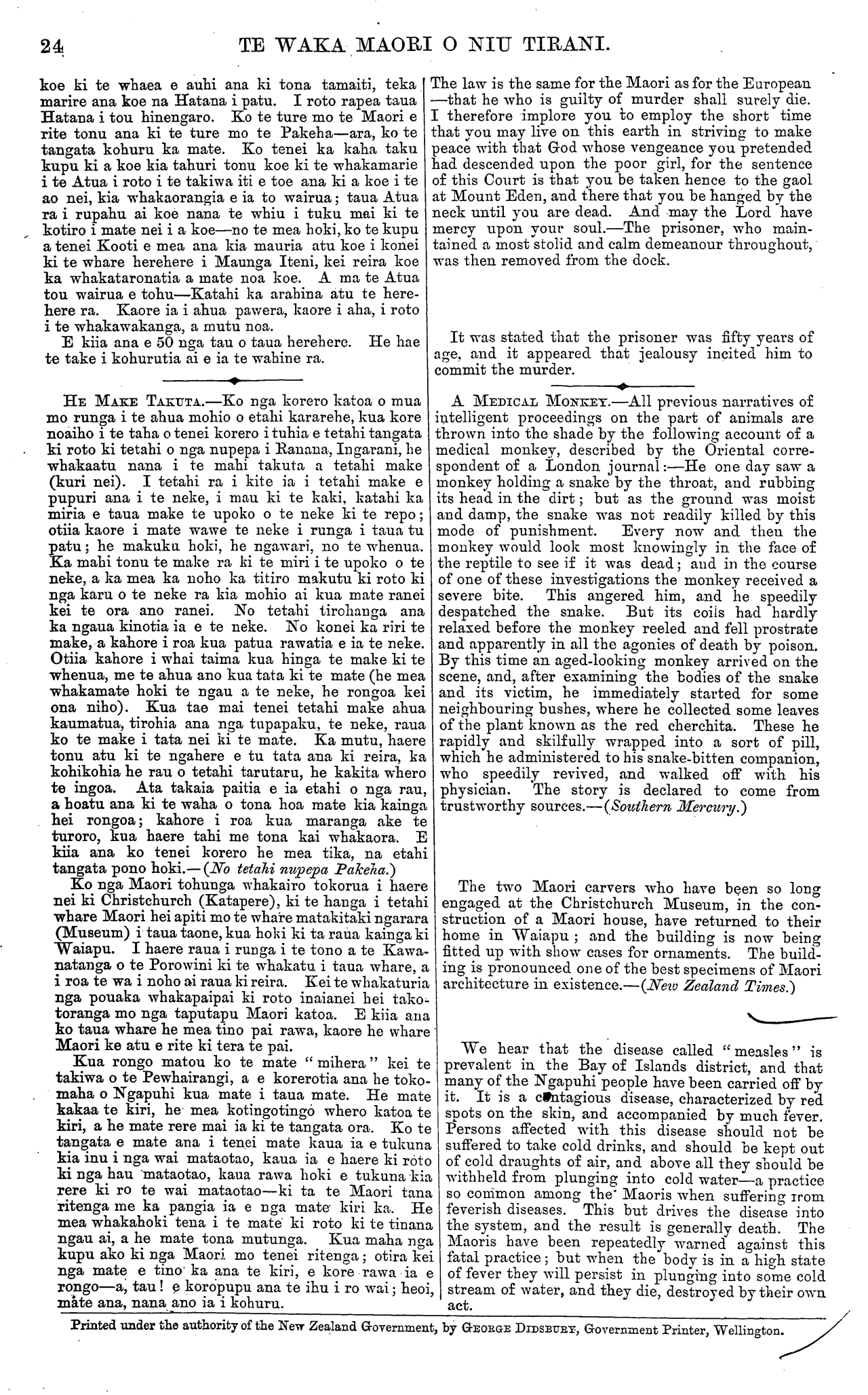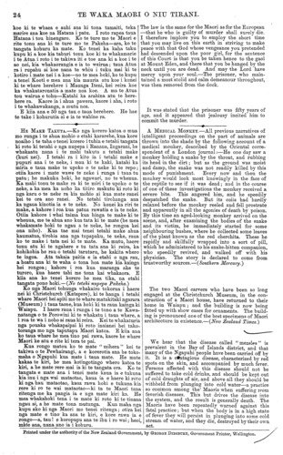 24 TE WAKA MAORI O NIU TIRANI. koe ki te whaea e auhi ana ki tona tamaiti, teka marire ana koe na Hatana i patu. I roto rapea taua Hatana i tou hinengaro. Ko te ture mo te Maori e rite tonu ana ki te ture mo te Pakeha—ara, ko te tangata kohuru ka mate. Ko tenei ka kaha taku kupu ki a koe kia tahuri tonu koe ki te whakamarie i te Atua i roto i te takiwa iti e toe ana ki a koe i te ao nei, kia whakaorangia e ia to wairua; taua Atua ra i rupahu ai koe nana te whiu i tuku mai ki te kotiro i mate nei i a koe—no te mea hoki, ko te kupu a tenei Kooti e mea ana kia mauria atu koe i konei ki te whare herehere i Maunga Iteni, kei reira koe ka whakataronatia a mate noa koe. A ma te Atua tou wairua e tohu—Katahi ka arahina atu te here- here ra. Kaore ia i ahua pawera, kaore i aha, i roto i te whakawakanga, a mutu noa. E kiia ana e 50 nga tau o taua herehere. He hae te take i kohurutia ai e ia te wahine ra. HE MAKE TAKUTA.—Ko nga korero katoa o mua mo runga i te ahua mohio o etahi kararehe, kua kore noaiho i te taha o tenei korero i tuhia e tetahi tangata ki roto ki tetahi o nga nupepa i Ranana, Ingarani, he whakaatu nana i te mahi takuta a tetahi make (kuri nei). I tetahi ra i kite ia i tetahi make e pupuri ana i te neke, i mau ki te kaki, katahi ka miria e taua make te upoko o te neke ki te repo ; otiia kaore i mate wawe te neke i runga i taua tu patu ; he makuku hoki, he ngawari, no te whenua. Ka mahi tonu te make ra ki te miri i te upoko o te neke, a ka mea ka noho ka titiro makutu ki roto ki nga karu o te neke ra kia mohio ai kua mate ranei kei te ora ano ranei. No tetahi tirohanga ana ka ngaua kinotia ia e te neke. No konei ka riri te make, a kahore i roa kua patua rawatia e ia te neke. Otiia kahore i whai taima kua hinga te make ki te whenua, me te ahua ano kua tata ki te mate (he mea whakamate hoki te ngau a te neke, he rongoa kei ona niho). Kua tae mai tenei tetahi make ahua kaumatua, tirohia ana nga tupapaku, te neke, raua ko te make i tata nei ki te mate. Ka mutu, haere tonu atu ki te ngahere e tu tata ana ki reira, ka kohikohia he rau o tetahi tarutaru, he kakita whero te ingoa. Ata takaia paitia e ia etahi o nga rau, a hoatu ana ki te waha o tona hoa mate kia kainga hei rongoa; kahore i roa kua maranga ake te turoro, kua haere tahi me tona kai whakaora. E kiia ana ko tenei korero he mea tika, na etahi tangata pono hoki.—(No tetahi nupepa Pokeno,) Ko nga Maori tohunga whakairo tokorua i haere nei ki Christchurch (Katapere), ki te hanga i tetahi whare Maori hei apiti mo te whare matakitaki ngarara (Museum) i taua taone, kua hold ki ta raua kainga ki Waiapu. I haere raua i runga i te tono a te Kawa- natanga o te Porowini ki te whakatu i taua whare, a i roa te wa i noho ai raua ki reira. Kei te whakaturia nga pouaka whakapaipai ki roto inaianei hei tako- toranga mo nga taputapu Maori katoa. E kiia ana ko taua whare he mea tino pai rawa, kaore he whare Maori ke atu e rite ki tera te pai. Kua rongo matou ko te mate " mihera" kei te takiwa o te Pewhairangi, a e korerotia ana he toko- maha o Ngapuhi kua mate i taua mate. He mate kakaa te kiri, he mea kotingotingo whero katoa te kiri, a he mate rere mai ia ki te tangata ora. Ko te tangata e mate ana i tenei mate kaua ia e tukuna kia inu i nga wai mataotao, kaua ia e haere ki roto ki nga hau "mataotao, kaua rawa hoki e tukuna kia rere ki ro te wai mataotao—ki ta te Maori tana ritenga me ka pangia ia e nga mate" kiri ka. He mea whakahoki tena i te mate ki roto ki te tinana ngau ai, a he mate tona mutunga. Kua maha nga kupu ako ki nga Maori mo tenei ritenga; otira kei nga mate e tino ka ana te kiri, e kore rawa ia e rongo—a, tau! e koropupu ana te ihu i ro wai; heoi, mate ana, nana ano ia i kohuru. The law is the same for the Maori as for the European —that he who is guilty of murder shall surely die. I therefore implore you to employ the short time that you may live on this earth in striving to make peace with that God whose vengeance you pretended had descended upon the poor girl, for the sentence of this Court is that you be taken hence to the gaol at Mount Eden, and there that you be hanged by the neck until you are dead. And may the Lord have mercy upon your soul.—The prisoner, who main- tained a most stolid and calm demeanour throughout, was then removed from the dock. It was stated that the prisoner was fifty years of age, and it appeared that jealousy incited him to commit the murder. A MEDICAL MONKEY.—All previous narratives of intelligent proceedings on the part of animals are thrown into the shade by the following account of a medical monkey, described by the Oriental corre- spondent of a London journal:—He one day saw a monkey holding a snake by the throat, and rubbing its head in the dirt; but as the ground was moist and damp, the snake was not readily killed by this mode of punishment. Every now and then the monkey would look most knowingly in the face of the reptile to see if it was dead; and in the course of one of these investigations the monkey received a severe bite. This angered him, and he speedily despatched the snake. But its coils had hardly relaxed before the monkey reeled and fell prostrate and apparently in all the agonies of death by poison. By this time an aged-looking monkey arrived on the scene, and, after examining the bodies of the snake and its victim, he immediately started for some neighbouring bushes, where he collected some leaves of the plant known as the red cherchita. These he rapidly and skilfully wrapped into a sort of pill, which he administered to his snake-bitten companion, who speedily revived, and walked off with his physician. The story is declared to come from trustworthy sources.—(Southern Mercury.) The two Maori carvers who have been so long engaged at the Christchurch Museum, in the con- struction of a Maori house, have returned to their home in Waiapu ; and the building is now being fitted up with show cases for ornaments. The build- ing is pronounced one of the best speci