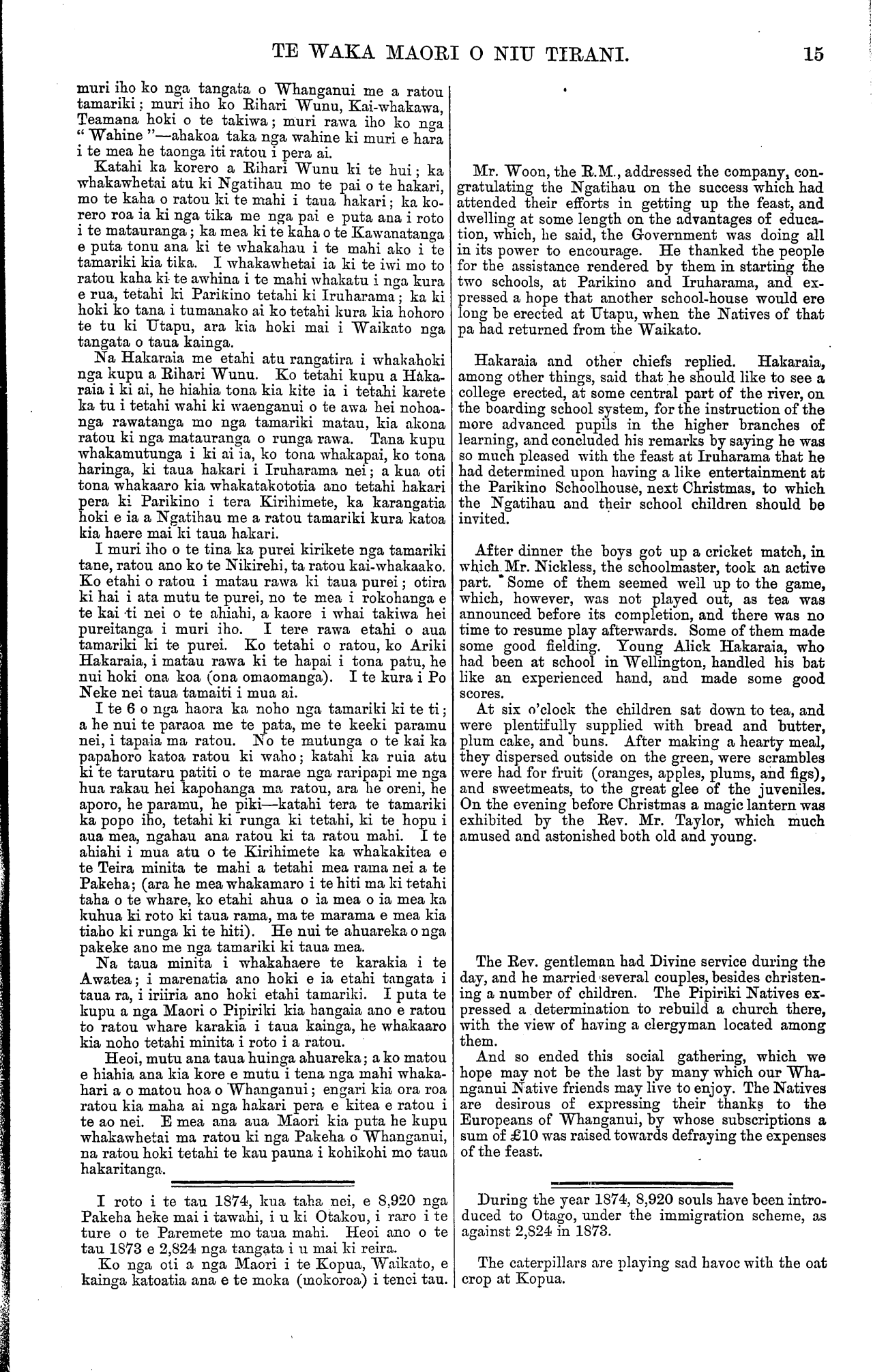 14 TE WAKA MAORI O NIU TIRANI. Ko TE PAEA, te tuahine o Tawhiao, i Te Kuiti, i te 21 o Hanuere, 1875. Ko RIRI, he kuia pouaru na Hohepa Tamaihengia kua mate, nei he rangatira no Ngatitoa. I mate taua kuia ki Taka- puahia, Porirua, i te 15 o Hanuere, 1875. TE UTU MO TE WAKA. Ko te utu mo te Waka Maori i te tau ka te 10s., he mea utu ki mua. Ka tukuna atu i te meera ki te tangata e hiahia ana me ka tukua mai e ia aua moni ki te Kai Tuhi ki Po Neke nei. PO NEKE, TUREI, HANUERE 26, 1875. KUA MAORI, IRUHARAMA, WHANGANUI. I TAKOTO te hakari i taua kura i te ra Kirihimete nei, i tino hari rawa nga matua, nga tamariki, me nga manuhiri katoa i taua hakari. Ko taua tikanga whakatu hui i roto i nga tau katoa e nui haere tonu ana, a he ritenga pai rawa ia i runga i te mahi kura Maori puta noa i te motu katoa nei. He tikanga whakatupu aroha ia i roto i nga kai-whakaako me nga akonga, he whakakotahi i nga matua me nga kai-whakaako me nga tamariki, he whakakaha hoki i te katoa kia kaha ai te whakahaere i ta ratou mahi pai—he mahi hoki ia e whakaneke ake ana* i te turanga o te iwi Maori o Niu Tirani nei; he mahi ia mana e whakawhiwhi te iwi Maori ki nga painga katoa e mau nei i te iwi Pakeha, ara ki te kore e he taua mahi pai i te iwi Maori ake ano i runga i te mahi haurangi, kai waipiro. I te hakari e korero nei matou he nui nga Maori o nga kainga i roto i te awa katoa i hui ki reira, nga kainga o te taha ki runga o Iruharama o te taha ki raro hoki—he mea kakahu katoa i te kahu whaka- paipai. I pai rawa taua rangi, a kaore rawa i kitea tetahi mea he hei whakararuraru i taua hui, he aroha he pai anake te tikanga taea noa te mutunga. He nui rawa te kai a Ngatihau ma nga manuhiri, i mahue noa etahi, kaore i taea te kai—ko tona ahua tonu hoki tena o te hui Maori. E toru nga waka nunui nana i kawe atu i te taone o Whanganui ki te whenua i te kura nga kai ma to hui. I hangaia ki nga rakau papa, a nga Maori, tetahi tepara roa, puta rawa ki tetahi pito ki tetahi pito o te rumu o te kura, hei papa kai ma nga matua o nga tamariki me etahi atu tangata matua; ko nga tamariki kura, e whitu te kau, i noho ki nga papa i te taha o nga pakitara o te whare. Kotahi te " pai," (he paraoa te pai, he kiko kei roto), kotahi te paraoa rohi nei, me te wahi putini paramu nei, me te paneke tini-pia, i whakata- kototia ki te aroaro o ia tamaiti o ia tamaiti; ko te papa nui ia, keke aua i te taimaha o te kai i takaia e nga Maori; ara he pikaokao i tunua ki te oumu; he poaka, mea tunu etahi, mea paata etahi; he taewa; he kumara; he taro ; me era atu kai pai. I haria ake i te pa aua kai e nga wahine me nga tane, i runga i te ritenga Maori nei ano ki te mau kai ma nga manu- hiri i ana hui. Ka mutu te whakapai a te Teira, minita, katahi ano ka timata te kai. Ka kai nga matua, ka kai nga tamariki—he aha kia korerotia te kai, he hanga e whakaparahakotia ana koia te kai ? He maha nga inumanga ki te tangata kia ora roa. I inu ratou ki a te Kuini i te tuatahi, me te karanga ake kia ora roa ia, kia hari tonu i roto i nga ra o tona oranga; muri iho ka inu ki te Piriniha o Weera me te Pirinihi o Weera (tona wahine), me te whanau katoa a te Kuini, kia ora tonu; muri iho ko te Kawana me tona wahine, ko taua kupu ano te kupu; muri iho ko te Kawanatanga; muri iho ko te Tumu- aki o te Kawanatanga me Ta Tanara Makarini; TE PAEA (Sophia), sister of Tawhiao, at Te Kuiti, on the 21st of January, 1875. RIRIA, the aged widow of the late Hohepa Tamaihengia, a chief of Ngatitoa, at Takapuahia, Porirua, on the 15th of January, 1875. TERMS OF SUBSCRIPTION. The Subscription to the Waka Maori is 10s. per year, payable in advance. Persons desirous of becoming subscribers can have the paper posted to their address by forwarding that amount to the Editor in Wellington. WELLINGTON, TUESDAY, JANUARY 26, 1875. IRUHARAMA NATIVE SCHOOL, WHANGANUI. A FEAST was given in connection with the above school on Christmas last, at which parents, children, and visitors enjoyed themselves exceedingly. This practice of having such yearly reunions is becoming quite common, and is a pleasing feature in con- nection with Native schools throughout the country. Its effect must, of necessity,, be to create a kindly feeling between the teacher and the taught, to cement the union between parents, teachers, and children, and to encourage all in the vigorous pro- secution of their good work—a work which is doing so much to improve the position of the Native race in New Zealand; and which, if not neutralized by habits of intemperance among the Native people themselves, will eventually confer upon them all the advantages enjoyed by the Pakeha. At the feast in question there was a large gathering of Natives from the different settlements on the river, above and below Iruharama, all dressed in holiday attire, The weather proved most propitious, nothing occurred to mar the enjoyment, and the utmost harmony and good feeling prevailed through- out. The Native tribes made liberal provision for the visitors, the quantity of food being, as usual on such occasions, more than sufficient. Three large canoes conveyed the provisions from the town of Whanganui to the school-grounds. With the aid of some timber, supplied by the Natives, a long table was made, reaching from one end of the school-room to the other, for the accommodation of the parents and elderly Natives, whilst the school children, numbering seventy, were seated at the desks along the side walls. A meat pie, a bread roll, and a large piece of plum pudding, with a pannikin of ginger- beer, were laid for each scholar; and the large table literally groaned with provisions, cooked by the Natives, consisting of baked fowls, roasted and boiled pork, potatoes, kumara, taro, and other delicacies. This food was brought up from the pa by a proces- sion of women and men in the usual Maori style. Grace having been said by the Rev. Mr. Taylor, the feeding commenced. It is unnecessary to say that ample justice was done to the good things by bo