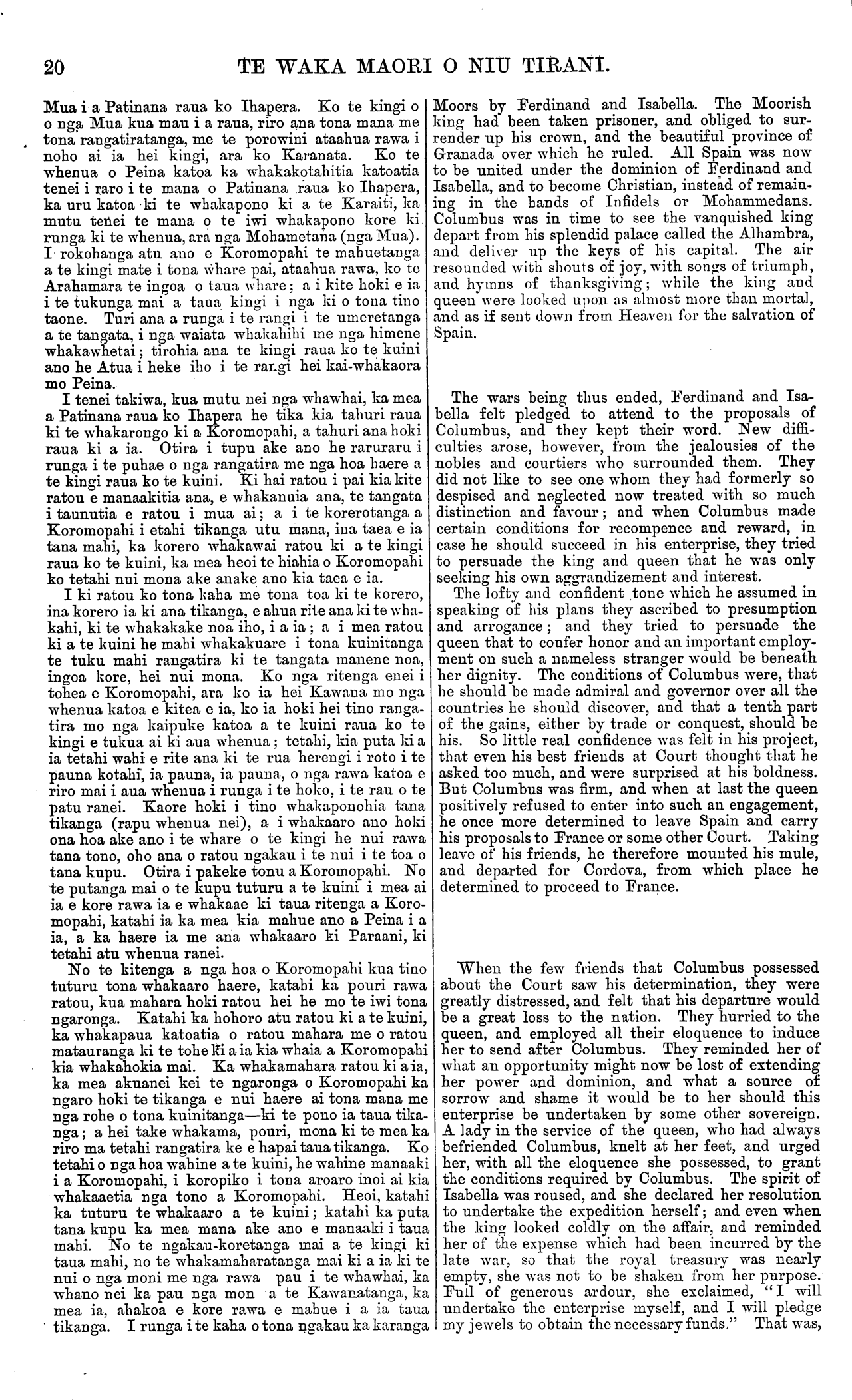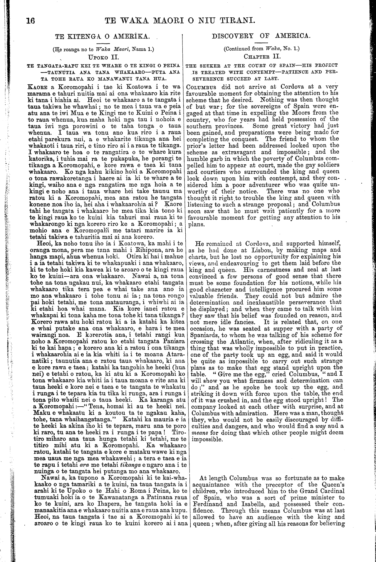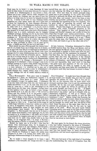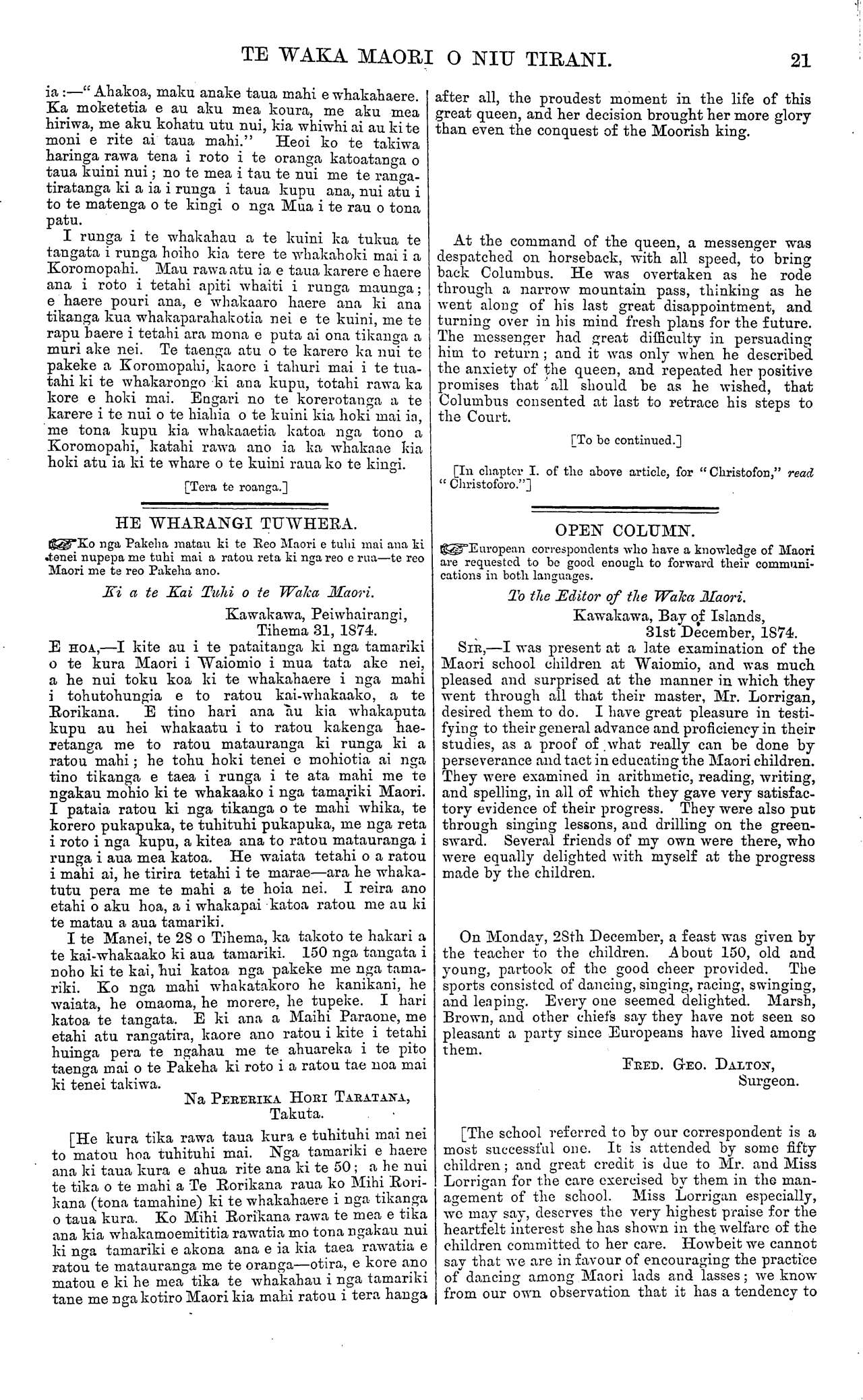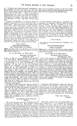 TE WAKA MAORI O NIU TIRANI. 21 ia :—" Ahakoa, maku anake taua mahi e whakahaere. Ka moketetia e au aku mea koura, me aku mea hiriwa, me aku kohatu utu nui, kia whiwhi ai au ki te moni e rite ai taua mahi." Heoi ko te takiwa haringa rawa tena i roto i te oranga katoatanga o taua kuini nui; no te mea i tau te nui me te ranga- tiratanga ki a ia i runga i taua kupu ana, nui atu i to te matenga o te kingi o nga Mua i te rau o tona patu. I runga i te whakahau a te kuini ka tukua te tangata i runga hoiho kia tere te whakahoki mai i a Koromopahi. Mau rawa atu ia e taua karere e haere ana i roto i tetahi apiti whaiti i runga maunga; e haere pouri ana, e whakaaro haere ana ki ana tikanga kua whakaparahakotia nei e te kuini, me te rapu haere i tetahi ara mona e puta ai ona tikanga a muri ake nei. Te taenga atu o te karere ka nui te pakeke a Koromopahi, kaore i tahuri mai i te tua- tahi ki te whakarongo ki ana kupu, totahi rawa ka kore e hoki mai. Engari no te korerotanga a te karere i te nui o te hiahia o te kuini kia hoki mai ia, me tona kupu kia whakaaetia katoa nga tono a Koromopahi, katahi rawa ano ia ka whakaae kia hoki atu ia ki te whare o te kuini raua ko te kingi. [Tera te roanga.] HE WHARANGI TUWHERA. Ko nga Pakeha matau ki to Reo Maori e tuhi mai ana ki tenei nupepa me tuhi mai a ratou reta ki nga reo e rua—te reo Maori me te reo Pakeha ano. Ki a te Kai Tuhi o te Waka Maori. Kawakawa, Peiwhairangi, Tihema 31, 1874. E HOA,—I kite au i te pataitanga ki nga tamariki o te kura Maori i Waiomio i mua tata ake nei, a he nui toku koa ki te whakahaere i nga mahi i tohutohungia e to ratou kai-whakaako, a te Rorikana. E tino hari ana au kia whakaputa kupu au hei whakaatu i to ratou kakenga hae- retanga me to ratou matauranga ki runga ki a ratou mahi; he tohu hoki tenei e mohiotia ai nga tino tikanga e taea i runga i te ata mahi me te ngakau mohio ki te whakaako i nga tamariki Maori. I pataia ratou ki nga tikanga o te mahi whika, te korero pukapuka, te tuhituhi pukapuka, me nga reta i roto i nga kupu, a kitea ana to ratou matauranga i runga i aua mea katoa. He waiata tetahi o a ratou i mahi ai, he tirira tetahi i te marae—ara he whaka- tutu pera me te mahi a te hoia nei. I reira ano etahi o aku hoa, a i whakapai katoa ratou me au ki te matau a aua tamariki. I te Manei, te 28 o Tihema, ka takoto te hakari a te kai-whakaako ki aua tamariki. 150 nga tangata i noho ki te kai, hui katoa nga pakeke me nga tama- riki. Ko nga mahi whakatakoro he kanikani, he waiata, he omaoma, he morere, he tupeke. I hari katoa te tangata. E ki ana a Maihi Paraone, me etahi atu rangatira, kaore ano ratou i kite i tetahi huinga pera te ngahau me te ahuareka i te pito taenga mai o te Pakeha ki roto i a ratou tae noa mai ki tenei takiwa. Na PERERIKA HORI TARATANA, Takuta. [He kura tika rawa taua kura e tuhituhi mai nei to matou hoa tuhituhi mai. Nga tamariki e haere ana ki taua kura e ahua rite ana Id te 50, a he nui te tika o te mahi a Te Eorikana raua ko Mihi Rori- kana (tona tamahine) ki te whakahaere i nga tikanga o taua kura. Ko Mihi Eorikana rawa te mea e tika ana kia whakamoemititia rawatia mo tona ngakau nui ki nga tamariki e akona ana e ia kia taea rawatia e ratou te matauranga me te oranga—otira, e kore ano matou e ki he mea tika te whakahau i nga tamariki tane me nga kotiro Maori kia mahi ratou i tera hanga after all, the proudest moment in the life of this great queen, and her decision brought her more glory than even the conquest of the Moorish king. At the command of the queen, a messenger was despatched on horseback, with all speed, to bring back Columbus. He was overtaken as he rode through a narrow mountain pass, thinking as he went along of his last great disappointment, and turning over in his mind fresh plans for the future. The messenger had great difficulty in persuading him to return ; and it was only when he described the anxiety of the queen, and repeated her positive promises that all should be as he wished, that Columbus consented at last to retrace his steps to the Court. [To bo continued,] [In chapter I. of the above article, for " Christofon," read " Christoforo."] OPEN COLUMN. European correspondents who have a knowledge of Maori are requested to be good enough to forward their communi- cations in both languages. To the Editor of the Waka Maori. Kawakawa, Bay of Islands, 31st December, 1874. SIR,—I was present at a late examination of the Maori school children at Waiomio, and was much pleased and surprised at the manner in which they went through all that their master, Mr. Lorrigan, desired them to do. I have great pleasure in testi- fying to their general advance and proficiency in their studies, as a proof of what really can be done by perseverance and tact in educating the Maori children. They were examined in arithmetic, reading, writing, and spelling, in all of which they gave very satisfac- tory evidence of their progress. They were also put through singing lessons, and drilling on the green- sward. Several friends of my own were there, who were equally delighted with myself at the progress made by the children. On Monday, 28th December, a feast was given by the teacher to the children. About 150, old and young, partook of the good cheer provided. The sports consisted of dancing, singing, racing, swinging, and leaping. Every one seemed delighted. Marsh, Brown, and other chiefs say they have not seen so pleasant a party since Europeans have lived among them. FRED. GEO. DALTON, Surgeon. [The school referred to by our correspondent is a most successful one. It is attended by some fifty children; and great credit is due to Mr. and Miss Lorrigan for the care exercised by them in the man- agement of the school. Miss Lorrigan especially, we may say, deserves the very highest praise for the heartfelt interest she has shown in the. welfare of the children committed to her care. Howbeit we cannot say that we are in favour of encouraging the practice of" dancing among Maori lads and lasses 