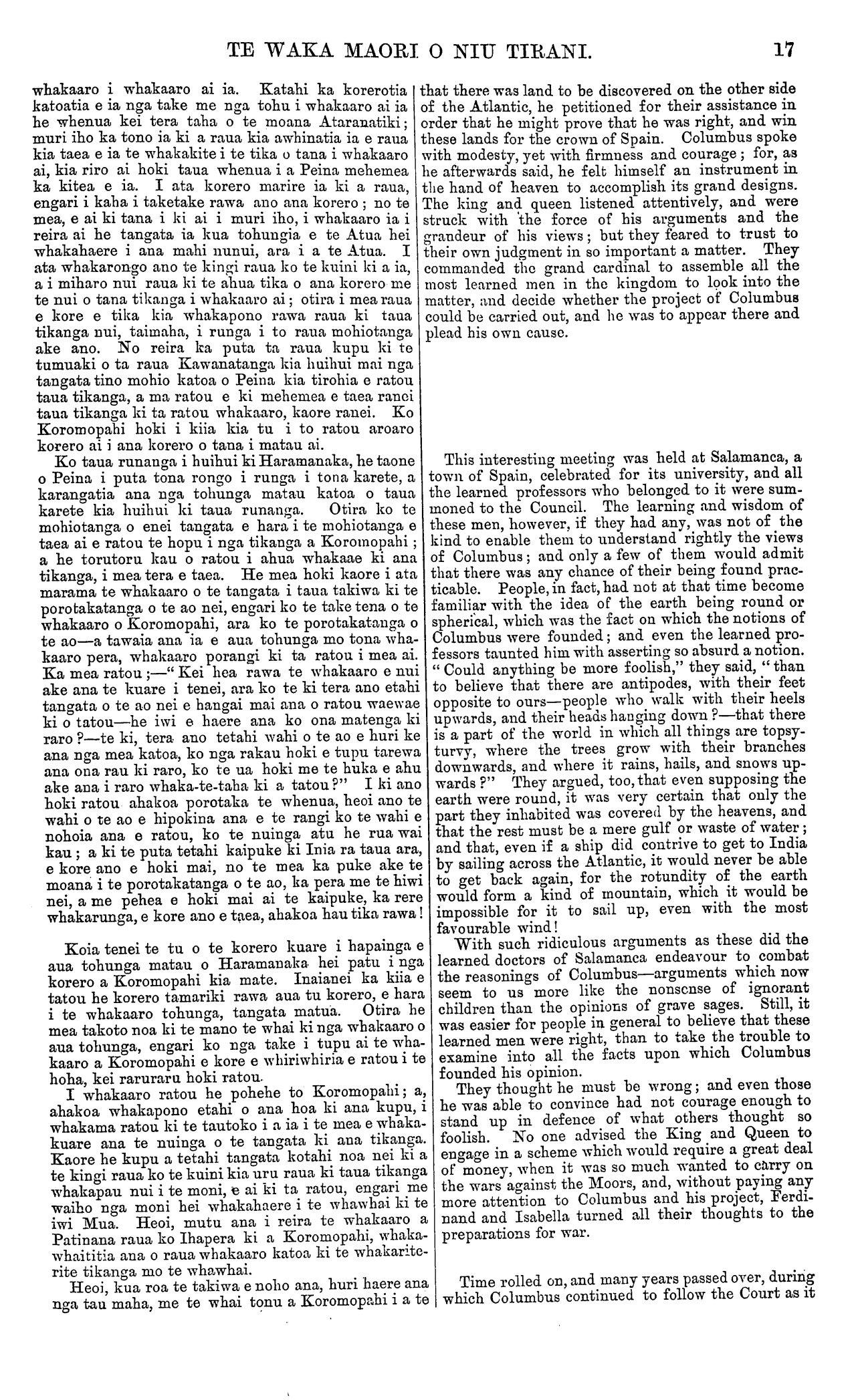 TE WAKA MAORI O NIU TIRANI. 17 whakaaro i whakaaro ai ia. Katahi ka korerotia katoatia e ia nga take me nga tohu i whakaaro ai ia he whenua kei tera taha o te moana Ataranatiki ; muri iho ka tono ia ki a raua kia awhinatia ia e raua kia taea e ia te whakakite i te tika o tana i whakaaro ai, kia riro ai hoki taua whenua i a Peina mehemea ka kitea e ia. I ata korero marire ia ki a raua, engari i kaha i taketake rawa ano ana korero ; no te mea, e ai ki tana i ki ai i muri iho, i whakaaro ia i reira ai he tangata ia kua tohungia e te Atua hei whakahaere i ana mahi nunui, ara i a te Atua. I ata whakarongo ano te kingi raua ko te kuini ki a ia, a i miharo nui raua ki te ahua tika o ana korero me te nui o tana tikanga i whakaaro ai; otira i mea raua e kore e tika kia whakapono rawa raua ki taua tikanga nui, taimaha, i runga i to raua mohiotanga ake ano. No reira ka puta ta raua kupu ki te tumuaki o ta raua Kawanatanga kia huihui mai nga tangata tino mohio katoa o Peina kia tirohia e ratou taua tikanga, a ma ratou e ki mehemea e taea ranei taua tikanga ki ta ratou whakaaro, kaore ranei. Ko Koromopahi hoki i kiia kia tu i to ratou aroaro korero ai i ana korero o tana i matau ai. Ko taua runanga i huihui ki Haramanaka, he taone o Peina i puta tona rongo i runga i tona karete, a karangatia ana nga tohunga matau katoa o taua karete kia huihui ki taua runanga. Otira ko te mohiotanga o enei tangata e hara i te mohiotanga e taea ai e ratou te hopu i nga tikanga a Koromopahi ; a he torutoru kau o ratou i ahua whakaae ki ana tikanga, i mea tera e taea. He mea hoki kaore i ata marama te whakaaro o te tangata i taua takiwa ki te porotakatanga o te ao nei, engari ko te take tena o te whakaaro o Koromopahi, ara ko te porotakatanga o te ao—a tawaia ana ia e aua tohunga mo tona wha- kaaro pera, whakaaro porangi ki ta ratou i mea ai. Ka mea ratou ;—" Kei hea rawa te whakaaro e nui ake ana te kuare i tenei, ara ko te ki tera ano etahi tangata o te ao nei e hangai mai ana o ratou waewae ki o tatou—he iwi e haere ana ko ona matenga ki raro ?—te ki, tera ano tetahi wahi o te ao e huri ke ana nga mea katoa, ko nga rakau hoki e tupu tarewa ana ona rau ki raro, ko te ua hoki me te huka e ahu ake aua i raro whaka-te-taha ki a tatou?" I ki ano hoki ratou ahakoa porotaka te whenua, heoi ano te wahi o te ao e hipokina ana e te rangi ko te wahi e nohoia ana e ratou, ko te nuinga atu he rua wai kau ; a ki te puta tetahi kaipuke ki Inia ra taua ara, e kore ano e hoki mai, no te mea ka puke ake te moana i te porotakatanga o te ao, ka pera me te hiwi nei, a me pehea e hoki mai ai te kaipuke, ka rere whakarunga, e kore ano e taea, ahakoa hau tika rawa! Koia tenei te tu o te korero kuare i hapainga e aua tohunga matau o Haramanaka hei patu i nga korero a Koromopahi kia mate. Inaianei ka kiia e tatou he korero tamariki rawa aua tu korero, e hara i te whakaaro tohunga, tangata matua. Otira he mea takoto noa ki te mano te whai ki nga whakaaro o aua tohunga, engari ko nga take i tupu ai te wha- kaaro a Koromopahi e kore e whiriwhiria e ratou i te hoha, kei raruraru hoki ratou. I whakaaro ratou he pohehe to Koromopahi; a, ahakoa whakapono etahi o ana hoa ki ana kupu, i whakama ratou ki te tautoko i a ia i te mea e whaka- kuare ana te nuinga o te tangata ki aua tikanga. Kaore he kupu a tetahi tangata kotahi noa nei ki a te kingi raua ko te kuini kia uru raua ki taua tikanga whakapau nui i te moni, e ai ki ta ratou, engari me waiho nga moni hei whakahaere i te whawha.i ki te iwi Mua. Heoi, mutu ana i reira te whakaaro a Patinana raua ko Ihapera ki a Koromopahi, whaka- whaititia ana o raua whakaaro katoa ki te whakarite- rite tikanga mo te whawhai. Heoi, kua roa te takiwa e noho ana, huri haere ana nga tau maha, me te whai tonu a Koromopahi i a te that there was land to be discovered on the other side of the Atlantic, he petitioned for their assistance in order that he might prove that he was right, and win these lands for the crown of Spain. Columbus spoke with modesty, yet with firmness and courage ; for, as he afterwards said, he felt himself an instrument in the hand of heaven to accomplish its grand designs. The king and queen listened attentively, and were struck with the force of his arguments and the grandeur of his views ; but they feared to trust to their own judgment in so important a matter. They commanded the grand cardinal to assemble all the most learned men in the kingdom to look into the matter, and decide whether the project of Columbus could be carried out, and he was to appear there and plead his own cause. This interesting meeting was held at Salamanca, a town of Spain, celebrated for its university, and all the learned professors who belonged to it were sum- moned to the Council. The learning and wisdom of these men, however, if they had any, was not of the kind to enable them to understand rightly the views of Columbus ; and only a few of them would admit that there was any chance of their being found prac- ticable. People, in fact, had not at that time become familiar with the idea of the earth being round or spherical, which was the fact on which the notions of Columbus were founded; and even the learned pro- fessors taunted him with asserting so absurd a notion. " Could anything be more foolish," they said, " than to believe that there are antipodes, with their feet opposite to ours—people who walk with their heels upwards, and their heads hanging down ?—that there is a part of the world in which all things are topsy- turvy, where the trees grow with their branches downwards, and where it rains, hails, and snows up- wards ?" They argued, too, that even supposing the earth were round, it was very certain that only the part they inhabited was covered by the heavens, and that the rest must be a mere gulf or waste of water; and that, even if a ship did contrive to get to India by sailing across the Atlantic, it would never be able to get back again, for the rotundity of the earth would form a kind of mo