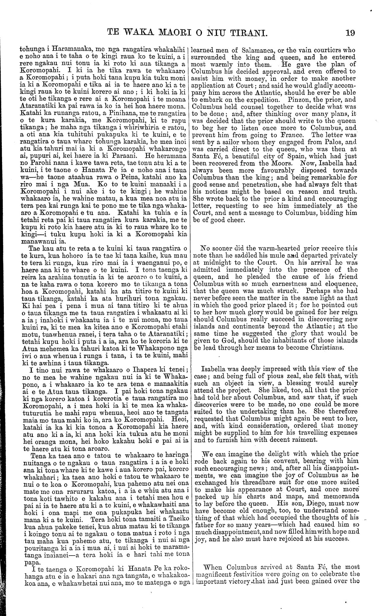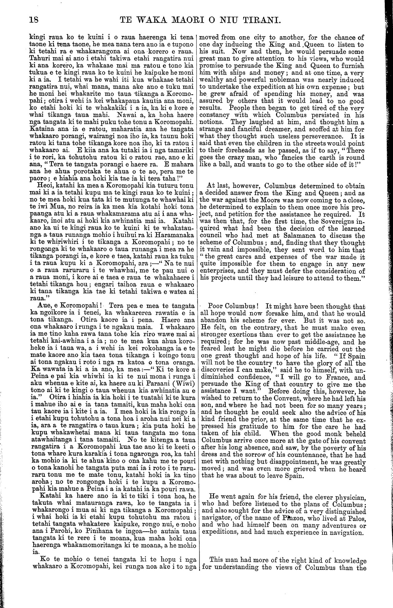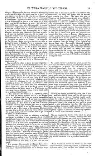 TE WAKA MAORI O NIU TIRANI. 19 tohunga i Haramanaka, mo nga rangatira whakahihi e noho ana i te taha o te kingi raua ko te kuini, a i rere ngakau nui tonu ia ki roto ki aua tikanga a Koromopahi. I ki ia he tika rawa te whakaaro a Koromopahi; i puta hoki tana kupu kia tuku moni ia ki a Koromopahi e tika ai ia te haere ano ki a te kingi raua ko te kuini korero ai ano ; i ki hoki ia ki te oti he tikanga e rere ai a Koromopahi i te moana Ataranatiki ka pai rawa ia ko ia hei hoa haere mona. Katahi ka runanga ratou, a Pinihana, me te rangatira o te kura karakia, me Koromopahi, ki te rapu tikanga ; he maha nga tikanga i whiriwhiria e ratou, a oti ana kia tuhituhi pukapuka ki te kuini, e te rangatira o taua whare tohunga karakia, he mea inoi atu kia tahuri mai ia ki a Koromopahi whakarongo ai, pupuri ai, kei haere ia ki Paraani. He heramana no Parohi nana i kawe tawa reta, tae tonu atu ki a te kuini, i te taone o Hanata Pe ia e noho ana i taua wa—he taone ataahua rawa o Peina, katahi ano ka riro mai i nga Mua. Ko to te kuini manaaki i a Koromopahi i nui ake i to te kingi; he wahine whakaaro ia, he wahine matau, a kua mea noa atu ia tera pea kai runga kai te pono me te tika nga whaka- aro a Koromopahi e tu ana. Katahi ka tuhia e ia tetahi reta pai ki taua rangatira kura karakia, me te kupu ki roto kia haere atu ia ki to raua whare ko te kingi—i tuku kupu hoki ia ki a Koromopahi kia manawanui ia. Tae kau atu te reta a te kuini ki taua rangatira o te kura, kua hohoro ia te tae ki tana kaihe, kua mau te tera ki runga, kua riro mai ia i waenganui po, e haere ana ki te whare o te kuini. I tona taenga ki reira ka arahina tonutia ia ki te aroaro o te kuini, a na te kaha rawa o tona korero mo te tikanga a tona hoa a Koromopahi, katahi ka ata titiro to kuini ki taua tikanga, katahi ka ata hurihuri toua ngakau. Ki hai pea i pena i mua ai tana titiro ki te ahua o taua tikanga me ta taua rangatira i whakaatu ai ki a ia ; inahoki i whakaatu ia i te nui moua, mo taua kuini ra, ki te mea ka kitea ano e Koromopahi et.ahi motu, tuawhenua ranei, i tera taha o te Ataranatiki; tetahi kupu hoki i puta i a ia, ara ko te kororia ki te Atua mehemea ka tahuri katoa ki te Whakapono nga iwi o aua whenua i runga i tana, i ta te kuini, mahi ki te awhina i taua tikanga. I tino nui rawa te whakaaro o Ihapera ki tenei; no te mea he wahine ngakau nui ia ki te Whaka- pono, a i whakaaro ia ko te ara tena e manaakitia ai e te Atua taua tikanga. I pai hoki tona ngakau ki nga korero katoa i korerotia e taua rangatira mo Koromopahi, a i mea hoki ia ki te mea ka whaka- tuturutia he mahi rapu whenua, heoi ano te tangata maia mo taua mahi ko ia, ara ko Koromopahi. Heoi, katahi ia ka ki kia tonoa a Koromopahi kia haere atu ano ki a ia, ki ana hoki kia tukua atu he moni hei oranga mona, hei hoko kakahu hoki e pai ai ia te haere atu ki tona aroaro. Tena ka taea ano e tatou te whakaaro te haringa nuitanga o te ngakau o taua rangatira i a ia e hoki ana ki tona whare ki te kawe i aua korero pai, korero whakahari; ka taea ano hoki e tatou te whakaaro te nui o te koa o Koromopahi, kua pahemo atu nei ona mate me ona raruraru katoa, i a ia e whiu atu ana i tona koti tawhito e kakahu ana i tetahi mea hou e pai ai ia te haere atu ki a te kuini, e whakawhaiti ana hoki i ona mapi me ona pukapuka hei whakaatu mana ki a te kuini. Tera hoki toua tamaiti a Taeiko kua ahua pakeke tenei, kua ahua matau ki te tikanga i koingo tonu ai te ngakau o tona matua i roto i nga tau maha kua pahemo atu, te tikanga i nui ai nga pouritanga ki a ia i mua ai, i nui ai hoki te marama- tanga inaianei—a tera hoki ia e hari tahi me tona papa. I te taenga o Koromopahi Id Hanata Pe ka roko- hanga atu e ia e hakari ana nga tangata, o whakakoa- koa ana, e whakawhetai nui ana, mo te matenga o nga learned men of Salamanca, or the vain courtiers who surrounded the king and queen, and he entered most warmly into them. He gave the plan of Columbus his decided approval, and even offered to assist him with money, in order to make another application at Court; and said he would gladly accom- pany him across the Atlantic, should he ever be able to embark on the expedition. Pinzon, the prior, and Columbus held counsel together to decide what was to be done ; and, after thinking over many plans, it was decided that the prior should write to the queen to beg her to listen once more to Columbus, and prevent him from going to France. The letter was sent by a sailor whom they engaged from Palos, and was carried direct to the queen, who was then at Santa Fe, a beautiful city of Spain, which had just been recovered from the Moors. Now, Isabella had always been more favourably disposed towards Columbus than the king; and being remarkable for good sense and penetration, she had always felt that his notions might be based on reason and truth. She wrote back to the prior a kind and encouraging letter, requesting to see him immediately at the Court, and sent a message to Columbus, bidding him be of good cheer. No sooner did the warm-hearted prior receive this note than he saddled his mule and departed privately at midnight to the Court. On his arrival he was admitted immediately into the presence of the queen, and ho pleaded the cause of his friend Columbus with so much earnestness and eloquence, that the queen was much struck. Perhaps she had never before seen the matter in the same light as that in which the good prior placed it; for ho pointed out to her how much glory would be gained for her reign should Columbus really succeed in discovering new islands and continents beyond the Atlantic ; at the same time he suggested the glory that would be given to God, should the inhabitants of those islands be lead through her means to become Christians. Isabella was deeply impresed with this view of the case; and being full of pious zeal, she felt that, with such an object in view, a blessing would surely attend the project. She liked, too, all that the prior- had told her about Columbus, and saw that