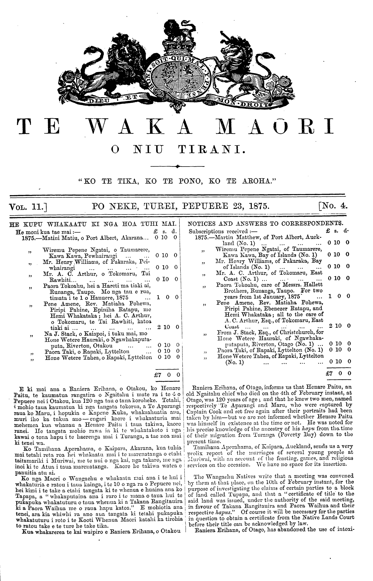 Te Waka Maori o Niu Tirani 1871-1877: Volume 11, Number 4. 23 February 1875 |
