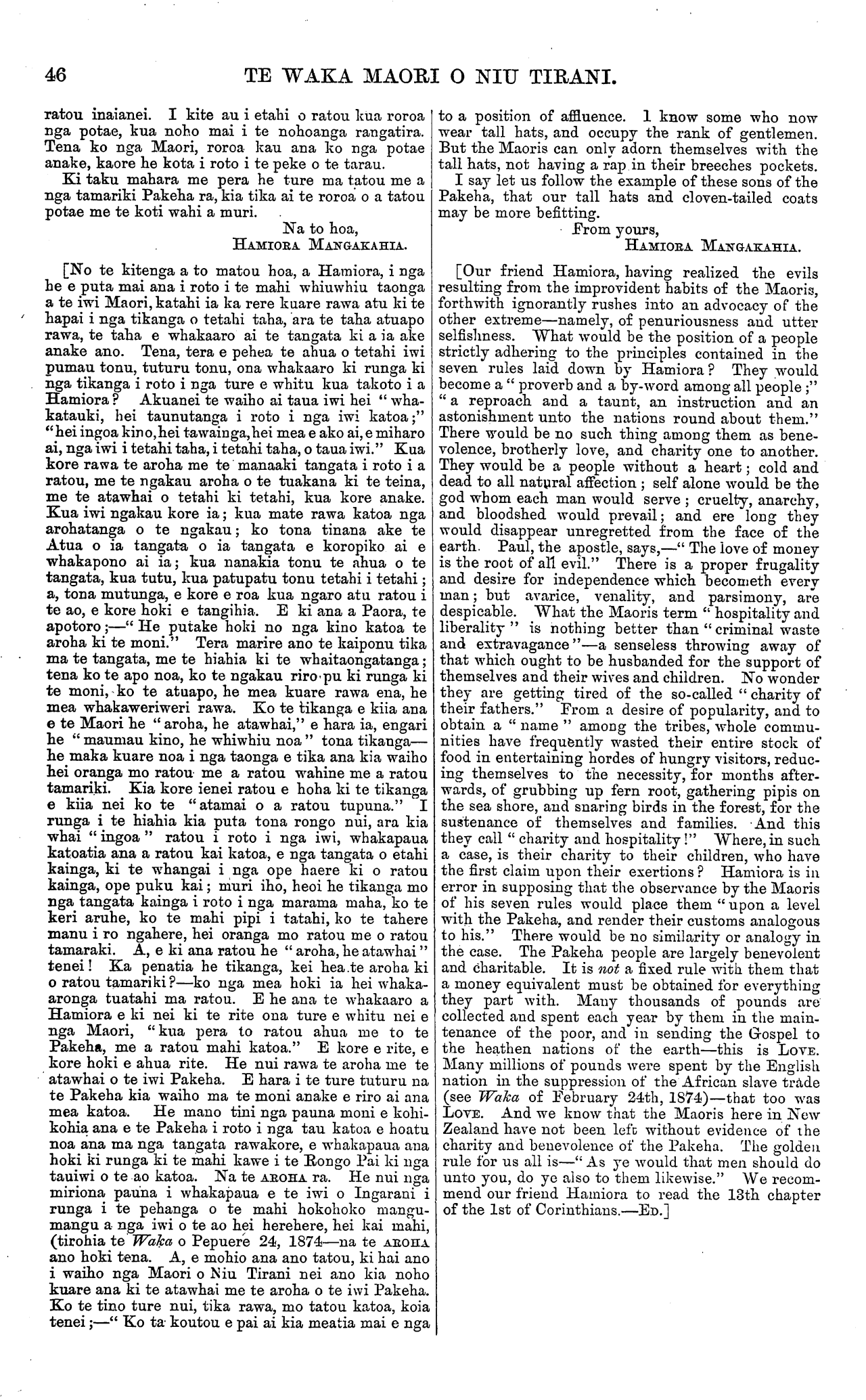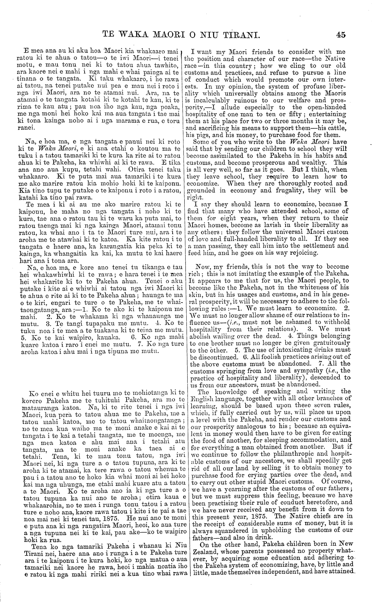 TE WAKA MAORI O NIU TIRANI. 45 E mea ana au ki aku hoa Maori kia whakaaro mai ratou ki te ahua o tatou—o te iwi Maori—i tenei motu, e mau tonu nei ki to tatou ahua tawhito, ara kaore nei e mahi i nga mahi e whai painga ai te tinana o te tangata. Ki taku whakaaro, i he rawa ai tatou, na tenei putake nui pea e mau noi i roto i nga iwi Maori, ara no te atamai nui. Ara, na te atamai o te tangata kotahi ki te kotahi te kau, ki te rima te kau atu ; pau noa iho nga kau, nga poaka, me nga moni hei hoko kai ma aua tangata i tae mai ki tona kainga noho ai i nga marama e rua, e toru ranei. Na, e hoa ma, e nga tangata e pamu nei ki roto ki te Waka Maori, e ki ana etahi o koutou ma te tuku i a tatou tamariki ki te kura ka rite ai to ratou ahua ki te Pakeha, ka whiwhi ai ki te rawa. E tika ana ano aua kupu, tetahi wahi. Otira tenei taku whakaaro. Ki te puta mai aua tamariki i te kura me ako marire ratou kia mohio hoki ki te kaiponu. Kia tino tupu te putake o te kaiponu i roto i a ratou, katahi ka tino pai rawa. Te mea i ki ai au me ako marire ratou ki te kaiponu, he maha no nga tangata i noho ki te kura, tae ana o ratou tau ki te waru ka puta mai, to ratou taenga mai ki nga kainga Maori, atamai tonu ratou, ka whai ano i ta to Maori ture nui, ara i te aroha me te atawhai ki to katoa. Ka kite ratou i to tangata e haere ana, ka karangatia kia peka ki te kainga, ka whangaitia ka kai, ka mutu te kai haere hari ana i tona ara. Na, o hoa ma, e kore ano tenei tu tikanga e tau hei whakawhiwhi ki to rawa ; e hara tenei i te mea hei whakarite ki to to Pakeha ahua. Tenei o aku putake i kite ai e whiwhi ai tatou nga iwi Maori ki te ahua o rite ai ki to te Pakeha ahua ; haunga to ma o te kiri, engari to ture o te Pakeha, me te whai- taongatanga, ara:—1. Ko te ako ki te kaiponu mo mahi. 2. Ko te whakama ki nga whanaunga me mutu. 3. Te tangi tupapaku me mutu. -4. Ko to tuku noa i te mea a te tuakana ki to teina mo mutu. 5. Ko te kai waipiro, kauaka. 6. Ko nga mahi kuare katoa i raro i enei mo mutu. 7. Ko nga ture aroha katoa i ahu mai i nga tipuna mo mutu. Ko enei e whitu hei tuuru mo to mohiotanga ki te korero Pakeha me te tuhituhi Pakeha, aru mo te matauranga katoa. Na, ki te rito tenei i nga iwi Maori, kua pera to tatou ahua mo to Pakeha, me a tatou mahi katoa, me to tatou whaitaongatanga; no te mea kua waiho ma te. moni anake e kai ai to tangata i te kai a tetahi tangata, me te moenga, me nga mea katoa e ahu mai aua i tetahi atu tangata, ma te moni anake ka taea ai e tetahi. Tena, ki te mau tonu tatou nga iwi Maori nei, ki nga ture a o tatou tupuna, ara ki te aroha ki te atamai, ka tere rawa o tatou whenua to pau i a tatou ano te hoko kia whai moni ai hei hoko kai ma nga uhunga, me etahi mahi kuare atu a tatou a te Maori. Ko te aroha ano ia Id nga ture a o tatou tupuna ka nui ano te aroha; otira kaua e whakaarohia, no te mea i runga tonu tatou i a ratou ture e noho ana, kaore rawa tatou i kite i te pai a tae noa mai nei ki tenei tau, 1875. He nui ano te moni e puta ana ki nga rangatira Maori, heoi, ko aua ture a nga tupuna nei ki te kai, pau ake—ko te waipiro hoki ka rua. Tena ko nga tamariki Pakeha i whanau ki Niu Tirani nei, haere ana ano i runga i a te Pakeha ture ara i te kaiponu i te kura hoki, ko nga matua o aua tamariki nei kaore he rawa, heoi i mahia noatia iho e ratou ki nga mahi ririki nei a kua tino whai rawa I want my Maori friends to consider with me the position and character of our race—the Native race —in this country; how we cling to our old customs and practices, and refuse to pursue a line of conduct which would promote our own inter- ests. In my opinion, the system of profuse liber- ality which universally obtains among the Maoris is incalculably ruinous to our welfare and pros- perity,—I allude especially to the open-handed hospitality of one man to ten or fifty ; entertaining them at his place for two or three months it may be, and sacrificing his means to support them—his cattle, his pigs, and his money, to purchase food for them. Some of you who write to the Waka Maori have said that by sending our children to school they will become assimilated to the Pakeha in his habits and customs, and become prosperous and wealthy. This is all very well, so far as it goes. But I think, when they leave school, they require to learn how to economize. When they are thoroughly rooted and grounded in economy and frugality, they will be right. I say they should learn to economize, because I find that many who have attended school, some of them for eight years, when they return to their Maori homes, become as lavish in their liberality as any others : they follow the universal Maori custom of love and full-handed liberality to all. If they see a man passing, they call him into the settlement and feed him, and he goes on his way rejoicing. Now, my friends, this is not the way to become rich ; this is not imitating the example of the Pakeha. It appears to me that for us, the Maori people, to become like the Pakeha, not in the whiteness of his skin, but in his usages and customs, and in his gene- ral prosperity, it will bo necessary to adhere to the fol- lowing rules :—1. Wo must learn to economize. 2. We must no longer allow shame of our relations to in- fluence us—( i.e., must not be ashamed to withhold hospitality from their relations). 3. We must abolish wailing over the dead. 4. Things belonging to one brother must no longer be given gratuitously to the other. 5. The use of intoxicating drinks must; bo discontinued. 6. All foolish practices arising out of the above customs must be abandoned. 7. All the customs springing from love and sympathy (i.e., the practice of hospitality and liberality), descended to us from our ancestors, must be abandoned. The knowledge of speaking and writing the English language, together with all other branches of learning, should be based upon these seven rules, which, if fully carried out by us, will place us upon a level with the Pakeha, and render our cus