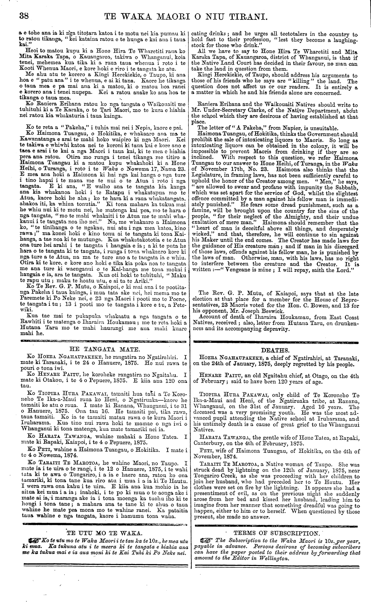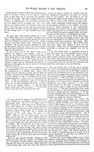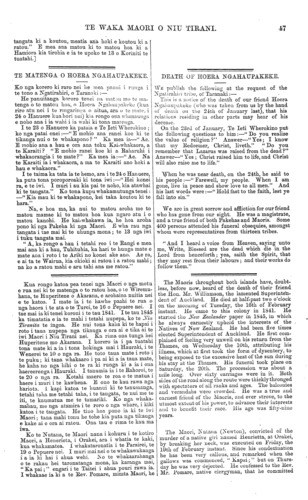 TE WAKA MAORI O NIU TIRANI. tangata ki a koutou, meatia ana hoki e koutou ki a ratou." E mea ana matou ki to matou hoa ki a Hamiora kia tirohia e ia te upoko te 13 o Koriniti te tuatahi.] TE MATENGA. O HOERA NGAHAUPAKEKE. Ko nga korero ki raro nei he men pamu i runga i te tono a Ngatirahiri, o Taranaki:— He panuitanga korero tenei na matou mo te ma- tenga o to matou hoa,, e Hoera N^aii;ii;o:iiu-ke (ku;i riro ;itu nei i tu ringann;.'a. o aitua, ara o tu in;ite1. i 24 o Hanuere kua hori nei) ki;i rongo ona v.-lianaung;;, e noho aua i ia wahi i ia wahi ki tona mai onga. I te 23 o Hanuere ka pataia e Te !eti 'Whcruldno ; ko nga patai enei:—" E mohio ana ranei koe ki te tikanga nui o te whakapono ? " Ka mea ia—" Ae. E mohio ana a hau e ora ana toku Kai-whakaora, a te Karaiti ? "E mohio ranei koe ki a Raharuhi i whakaorangia i te mate?" Ka mea ia:—"Ae. Na te Karaiti ia i whakaora, a ma te Karaiti ano hoki a hau e whakaora." I te taima ka tata ia te hemo, ara i te 24 o Hanuere, ka puta tona poroporoaki ki tona iwi:—" Hei konei ra, e te iwi. I muri i au kia pai te noho, kia atawhai ki te tangata." Ko tona kupu whakamutunga tenei: —" Kia mau ki te whakapono, kei taka koutou ki te hara." Na, e hoa ma, ka nui to matou aroha me to matou mamae ki to matou hoa kua ngaro atu i o matou kanohi. He kai-whakawa ia, he hoa aroha pono ki nga Pakeha ki nga Maori. £ wha rau nga tangata i tae mai ki te uhunga mona ; te 13 nga iwi i tuku tangata mai. " A, ka rongo a hau i tetahi reo i te Rangi e mea mai ana ki a hau, Tuhituhia, ka hari te hunga, mate e mate ana i roto i te Ariki no konei ake ano. Ae ra, e ai ta te Wairua, kia okioki ai ratou i a ratou mahi; na ko a ratou mahi e aru tahi ana me ratou." Kua rongo katoa pea tenei nga Maori o nga motu e rua nei ki te matenga o to ratou hoa, o te Wiremu- hana, te Huperitene o Akarana, e arohaina nuitia nei e te katoa. I mate ia i te hawhe paahi te rua o nga haora i te ata o te Turei, te 16 o Pepuere nei. I tae mai ia ki tenei koroni i te tau 1841. I te tau 1845 ka timatatia e ia te mahi i tetahi nupepa, ko te Niu Tiranita te ingoa. He nui tona kaha ki te hapai i roto i taua nupepa nga tikanga e ora ai e tika ai te iwi Maori i Niu Tirani nei. Ka rima ona tunga hei Huperitene mo Akarana. I korero ia i pa tuatahi tona mate ki a ia i tona hokinga mai i Hauraki, i te Wenerei te 10 o nga ra. He toto taua mate i roto i te puku; ki tana whakaaro i pa ai ki a ia taua mate, he kaha no nga hihi o te ra ki runga ki a ia i ona haereerenga i Hauraki. I tanumia ia i te Rahoroi, te te 20 o nga ra. Kotahi maero te roa o te matua i haere i muri i te kawhena. E ono te kau rawa nga hariota. 1 kapi katoa te huanui ki te tanumanga, tetahi taha me tetahi taha, i te tangata, te nui me te iti, te kaumatua me te tamariki. Ko nga whaka- mahau, me nga atamira i te roro o nga whare, i kiki katoa i te tangata. He tino hoa pono ia ki to iwi Maori; tana mahi tonu he tohe kia puta nga tikanga e kake ai e ora ai ratou. Ona tau e rima te kau ma iwa. Ko te Nutana, te Maori nana i kohuru i te kotiro Maori, a Henerieta, i Orakei, ara i whatia te kaki, kua whakamatea. 1 whakataronatia i te Parairei, te 19 o Pepuere nei. I muri mai nei o te whakawakanga i a ia ki hai i ahua wehi. No o te whakaarahanga o te rakau hei taronatanga mona, ka karanga mai, " Ka pai ; " engari i te Taitei i ahua pouri rawa ia. I whakaae ia ki a te Rev. Pomare, minita Maori, he DEATH OF HOERA NGAHAUPAKEKE. WE publish the following at the request of the N^ra,'i i ra,hiri tnln1, of Taranaki:— Titis is n noi!ce oi'' t!ie death of our friund Hoera X^anaup;'tl.eku (\\\\'ho v>-as taken from us by the hand ui' deAili on liio 21-th of January last), that his relatiuus residing in other parts may hear of his decease. On the 23rd of January, Te Leti Wherokino put the following questions to him :—" Do you realize the value of religion?" Answer—"Yes; I know that my Redeemer, Christ, liveth." " Do you remember that Lazarus was raised from the dead?" Answer—" Yes ; Christ raised him to life, and Christ will also raise me to life." When he was near death, on the 24th, he said to his people :—" Farewell, my people. When I am gone, live in peace and show love to all men." And his last words were:—" Holdfast to the faith, lest ye fall into sin." We arc in great sorrow and affliction for our friend who has gone from our sight. He was a magistrate, and a true friend of both Pakehas and Maoris. Some 400 persons attended his funeral obsequies, amongst whom were representatives from thirteen tribes. "And I heard a voice from Heaven, saying unto me, Write, Blessed are the dead which die in the Lord from henceforth; yea, saith the Spirit, that they may rest from their labours ; and their works do follow them." The Maoris throughout both islands have, doubt- less, before now, heard of the death of their friend the Hou. Mr. Williamson, the lamented Superinten- dent of Auckland. He died at half-past two o'clock on the morning oi Tuesday, the 16th of February instant. He came to this colony in 1841. He started the New Zealander paper in 1845, in which he always earnestly upheld the interests of the Natives of New Zealand. He had been five times elected Superintendent of Auckland. He first com- plained of feeling very unwell on his return from the Thames, on Wednesday the 10th, attributing his illness, which at first took the form of dysentery, to being exposed to the excessive heat of the sun during his stay at the Thames. His funeral took place on Saturday, the 20th. The procession was about a mile long. Over sixty carriages were in it. Both sides of the road along the route were thickly thronged with spectators of all ranks and ages. The balconies and verandahs were crowded. He was a true and earnest friend of the Maoris, and ever strove, to the utmost extent oi" his power, tu advance their interests and to benefit their race. His age was fifty-nine years. The Maori, Nutana (Newton), convicted of the murder of a native girl named Hen