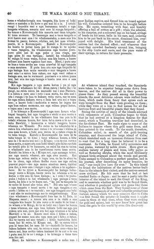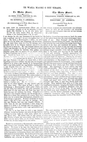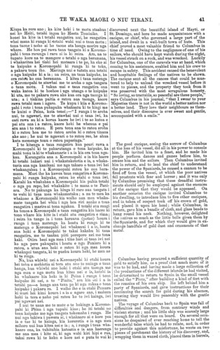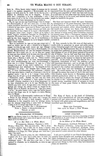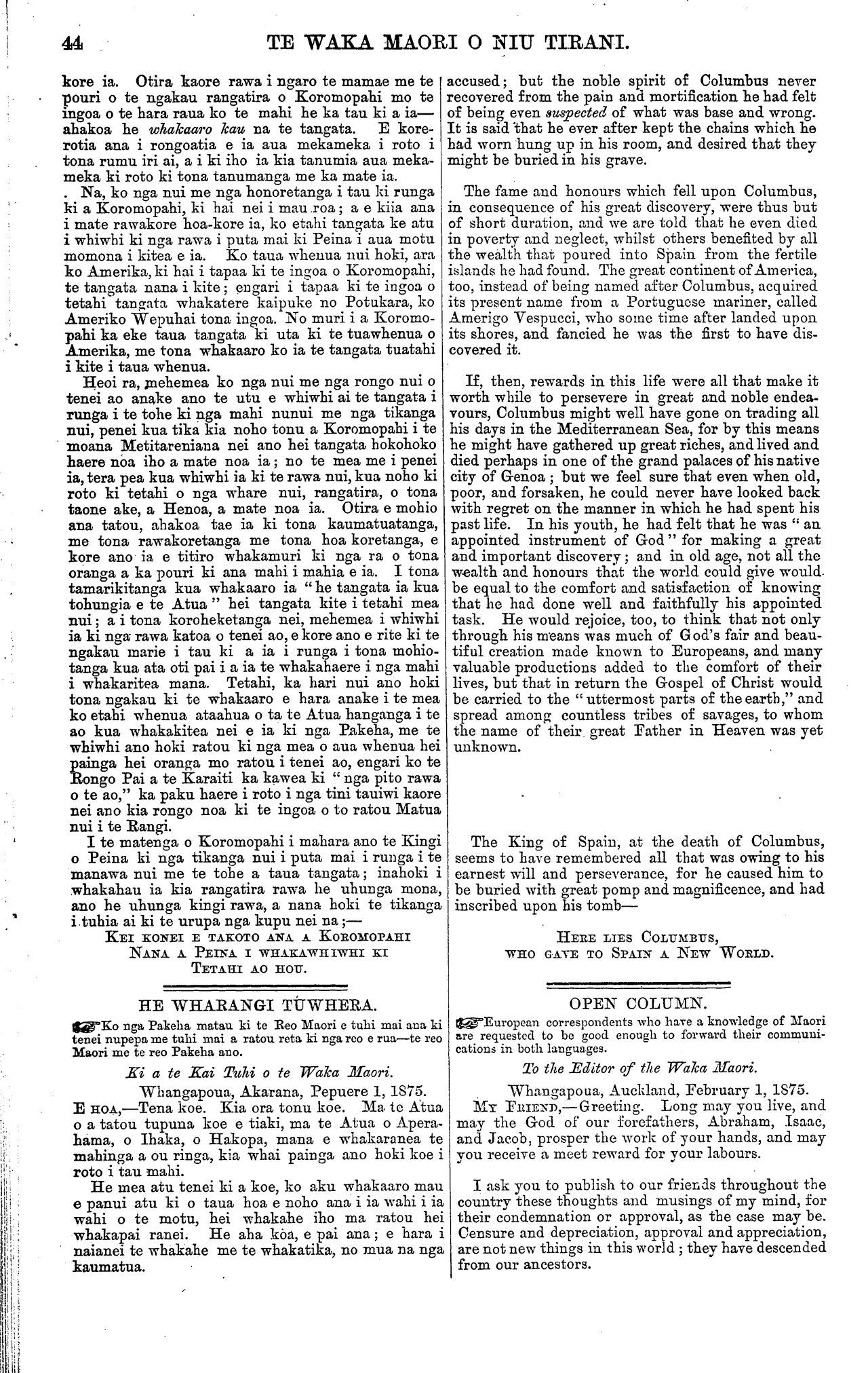 TE WAKA MAORI O NIU TIRANI. kore ia. Otira kaore rawa i ngaro te mamae me te pouri o te ngakau rangatira o Koromopahi mo te ingoa o te hara raua ko te mahi he ka tau ki a ia— ahakoa he whakaaro kau na te tangata. E kore- rotia ana i rongoatia e ia aua mekameka i roto i tona rumu iri ai, a i ki iho ia kia tanumia aua meka- meka ki roto ki tona tanumanga me ka mate ia. Na, ko nga nui me nga honoretanga i tau ki runga ki a Koromopahi, ki hai nei i mau roa; a e kiia ana i mate rawakore hoa-kore ia, ko etahi tangata ke atu i whiwhi ki nga rawa i puta mai ki Peina i aua motu momona i kitea e ia. Ko taua whenua nui hoki, ara ko Amerika, ki hai i tapaa ki te ingoa o Koromopahi, te tangata nana i kite; engari i tapaa ki te ingoa o tetahi tangata whakatere kaipuke no Potukara, ko Ameriko Wepuhai tona ingoa. No muri i a Koromo- pahi ka eke taua tangata ki uta ki te tuawhenua o Amerika, me tona whakaaro ko ia te tangata tuatahi i kite i taua whenua. Heoi ra, mehemea ko nga nui me nga rongo nui o tenei ao anake ano te utu e whiwhi ai te tangata i runga i te tohe ki nga mahi nunui me nga tikanga nui, penei kua tika kia noho tonu a Koromopahi i te moana Metitareniana nei ano hei tangata hokohoko haere noa iho a mate noa ia; no te mea me i penei ia, tera pea kua whiwhi ia ki te rawa nui, kua noho ki roto ki tetahi o nga whare nui, rangatira, o tona taone ake, a Henoa, a mate noa ia. Otira e mohio ana tatou, ahakoa tae ia ki tona kaumatuatanga, me tona rawakoretanga me tona hoa koretanga, e kore ano ia e titiro whakamuri ki nga ra o tona oranga a ka pouri ki ana mahi i mahia e ia. I tona tamarikitanga kua whakaaro ia " he tangata ia kua tohungia e te Atua " hei tangata kite i tetahi mea nui; a i tona koroheketanga nei, mehemea i whiwhi ia ki nga rawa katoa o tenei ao, e kore ano e rite ki te ngakau marie i tau ki a ia i runga i tona mohio- tanga kua ata oti pai i a ia te whakahaere i nga mahi i whakaritea mana. Tetahi, ka hari nui ano hoki tona ngakau ki te whakaaro e hara anake i te mea ko etahi whenua ataahua o ta te Atua hanganga i te ao kua whakakitea nei e ia ki nga Pakeha, me te whiwhi ano hoki ratou ki nga mea o aua whenua hei painga hei oranga mo ratou i tenei ao, engari ko te Kongo Pai a te Karaiti ka kawea ki " nga pito rawa o te ao," ka paku haere i roto i nga tini tauiwi kaore nei ano kia rongo noa ki te ingoa o to ratou Matua nui i te Rangi. I te matenga o Koromopahi i mahara ano te Kingi o Peina ki nga tikanga nui i puta mai i runga i te manawa nui me te tohe a taua tangata; inahoki i whakahau ia kia rangatira rawa he uhunga mona, ano he uhunga kingi rawa, a nana hoki te tikanga i tuhia ai ki te urupa nga kupu nei na;— KEI KONEI E TAKOTO ANA A KOROMOPAHI NANA A PEINA I WHAKAWHIWHI KI TETAHI AO HOU. HE WHARANGI TUWHERA. Ko nga Pakeha matau ki te Reo Maori e tuhi mai ana ki tenei nupepa me tuhi mai a ratou reta ki nga reo e rua—te reo Maori me te reo Pakeha ano. Ki a te Kai Tuhi o te Waka Maori. Whangapoua, Akarana, Pepuere 1, 1875. E HOA,—Tena koe. Kia ora tonu koe. Ma. to Atua o a tatou tupuna koe e tiaki, ma te Atua o Apera- hama, o Ihaka, o Hakopa, mana e whakaranea te mahinga a ou ringa, kia whai painga ano hoki koe i roto i tau mahi. He mea atu tenei ki a koe, ko aku whakaaro mau e panui atu ki o taua hoa e noho ana i ia wahi i ia wahi o te motu, hei whakahe iho ma ratou hei whakapai ranei. He aha koa, e pai ana ; e hara i naianei te whakahe me te whakatika, no mua na nga kaumatua. accused; but the noble spirit of Columbus never recovered from the pain and mortification he had felt of being even suspected of what was base and wrong. It is said that he ever after kept the chains which he had worn hung up in his room, and desired that they might be buried in his grave. The fame and honours which fell upon Columbus, in consequence of his great discovery, were thus but of short duration, and we are told that; he even died in poverty and neglect, whilst others benefited by all the wealth that poured into Spain from the fertile islands ho had found. The great continent of America, too, instead of being named after Columbus, acquired its present name from a Portuguese mariner, called Amerigo Vespucci, who some timo after landed upon its shores, and fancied he was the first to have dis- covered it. If, then, rewards in this life were all that make it worth while to persevere in great and noble endea- vours, Columbus might well have gone on trading all his days in the Mediterranean Sea, for by this means he might have gathered up great riches, and lived and died perhaps in one of the grand palaces of his native city of Genoa ; but we feel sure that even when old, poor, and forsaken, he could never have looked back with regret on the manner in which he had spent his past life. In his youth, he had felt that he was " an appointed instrument of God" for making a great and important discovery; and in old age, not all the wealth and honours that the world could give would be equal to the comfort and satisfaction of knowing that he had done well and faithfully his appointed task. He would rejoice, too, to think that not only through his means was much of God's fair and beau- tiful creation made known to Europeans, and many valuable productions added to the comfort of their lives, but that in return the Gospel of Christ would be carried to the "uttermost parts of the earth," and spread among countless tribes of savages, to whom the name of their great Father in Heaven was yet unknown. The King of Spain, at the death of Columbus, seems to have remembered all that was owing to his earnest will and perseverance, for he caused him to be buried with great pomp and magnificence, and had inscribed upon his tomb— HERE LIES COLUMBUS, WHO GAVE TO SPAIN A NEW WORLD. OPEN COLUMN. European correspondents who have a knowledge of Maori are requested to be good enough to forward their communi- cations in both languages. To the Editor of the Waka Maori. Whangapoua, Auckland, February 1, 1875. MY FRIEND,—Gre
