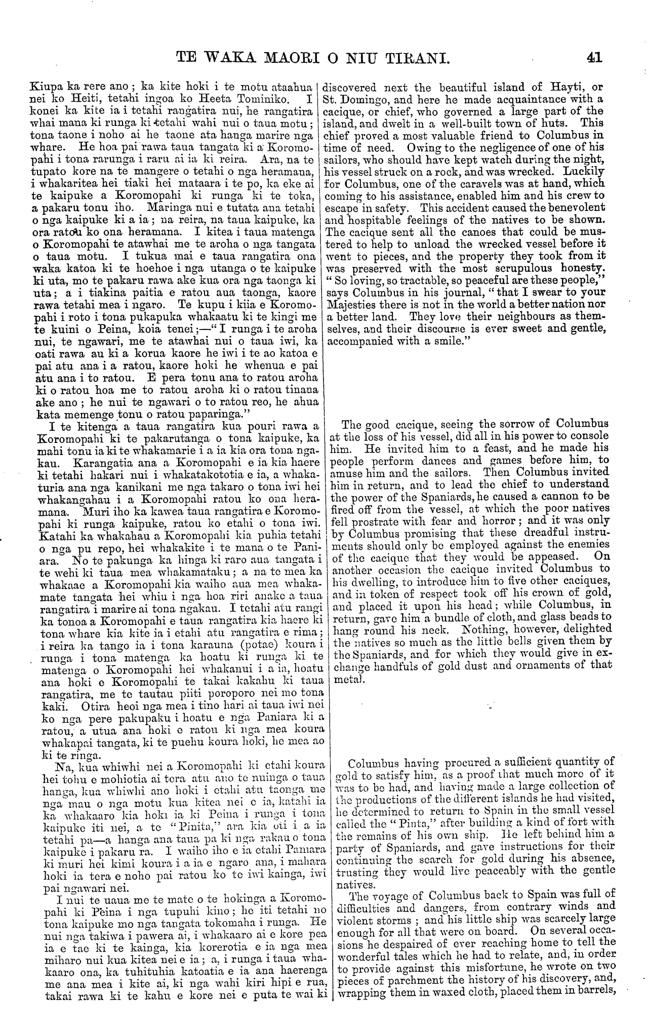 TE WAKA MAORI O NIU TIRANI. 41 Kiupa ka rere ano ; ka kite hoki i te motu ataahua nei ko Heiti, tetahi ingoa ko Heeta, Tominiko. I konei ka kite ia i tetahi rangatira nui, he rangatira whai mana ki runga ki tetahi wahi nui o taua motu ; tona taone i noho ai he taone ata hanga marire nga whare. He hoa pai rawa taua tangata ki a Koromo- pahi i tona rarunga i raru ai ia ki reira. Ara, na te tupato kore na te mangere o tetahi o nga heramana, i whakaritea hei tiaki hei mataara i te po, ka eke ai te kaipuke a Koromopahi ki runga ki te toka, a pakaru tonu iho. Maringa nui e tutata aua tetahi o nga kaipuke ki a ia ; ua reira, na taua kaipuke, ka ora ratou ko ona heramana. I kitea i taua matenga o Koromopahi te atawhai me te aroha o nga tangata o taua motu. I tukua mai e taua rangatira ona waka katoa ki te hoehoe i nga utanga o te kaipuke ki uta, mo te pakaru rawa ake kua ora nga taonga ki uta; a i tiakina paitia e ratou aua taonga, kaore rawa tetahi mea i ngaro. Te kupu i kiia e Koromo- pahi i roto i tona pukapuka whakaatu ki te kingi me te kuini o Peina, koia tenei;—" I runga i te aroha nui, te ngawari, me te atawhai nui o taua iwi, ka oati rawa au ki a korua kaore he iwi i te ao katoa e pai atu aua i a ratou, kaore hoki he whenua e pai atu ana i to ratou. E pera tonu ana to ratou aroha ki o ratou hoa me to ratou aroha ki o ratou tinana ake ano ; he nui te ngawari o to ratou reo, he ahua kata memenge tonu o ratou paparinga." I te kitenga a taua rangatira kua pouri rawa a Koromopahi ki to pakarutanga o tona kaipuke, ka mahi tonu ia ki te whakamarie i a ia kia ora toua nga- kau. Karangatia ana a Koromopahi e ia kia haere ki tetahi hakari nui i whakatakototia e ia, a whaka- turia ana nga kanikani me nga takaro o tona iwi hei whakangahau i a Koromopahi ratou ko ona hera- mana. Muri iho ka kawea taua rangatira e Koromo- pahi ki runga kaipuke, ratou ko etahi o tona iwi. Katahi ka whakahau a Koromopahi kia puhia tetahi o nga pu repo, hei whakakite i te mana o te Pani- ara. No te pakunga ka hinga ki raro aua tangata i te wehi ki taua mea whakamataku; a na to mea ka whakaae a Koromopahi kia waiho aua mea whaka- mate tangata hei whiu i nga hoa riri anake a taua rangatira i marire ai tona ngakau. I tetahi atu rangi ka tonoa a Koromopahi e taua rangatira kia haere ki tona whare kia kite ia i etahi atu rangatira e rima; i reira ka tango ia i tona karauna (potae) koura i , runga i tona matenga ka hoatu ki runga Id te matenga o Koromopahi hei whakanui i a ia, hoatu ana hoki e Koromopahi te takai kakahu ki taua rangatira, me to tautau piiti poroporo nei mo tona kaki. Otira heoi nga mea i tino hari ai taua iwi nei ko nga pere pakupaku i hoatu e nga Paniara ki a ratou, a utua ana hoki o ratou ki nga mea koura whakapai tangata, ki te puehu koura hoki, he mea ao ki te ringa. Na, kua whiwhi nei a Koromopahi ki etahi koura hei tohu e mohiotia ai tera atu ar.o to nuinga o taua hanga, kua whiwhi ano hoki i etahi atu taonga, me nga mau o nga motu kua kitea nei e ia, katahi ia ka whakaaro kia hoki ia ki Peina i runga i tona kaipuke iti nei, a to "Pinita," ara, kia oti i a ia tetahi pa—a hanga, ana taua pa ki nga rakau o toua kaipuke i pakaru ra. I waiho iho o ia etahi Paniara ki muri hei kimi koura i a ia e ngaro ana, i mahara hoki ia tora e noho pai ratou ko to iwi kainga, iwi pai ngawari nei. I nui te uaua mo te mate o te hokinga a Koromo- pahi ki Peina i nga tupuhi kino ; he iti tetahi no tona kaipuke mo nga tangata tokomaha i runga. He nui nga takiwa i pawera ai, i whakaaro ai e kore pea ia e tao ki te kainga, kia korerotia e ia nga mea miharo nui kua kitea nei e ia; a; i runga i taua wha- kaaro ona, ka tuhituhia katoatia e ia ana haerenga me ana mea i kite ai, ki nga wahi kiri hipi e rua, takai rawa ki te kahu e kore nei e puta te wai ki discovered next the beautiful island of Hayti, or St. Domingo, and here he made acquaintance with a cacique, or chief, who governed a large part of the island, and dwelt in a well-built town of huts. This chief proved a most valuable friend to Columbus in. time of need. Owing to the negligence of one of his sailors, who should have kept watch during the night, his vessel struck on a rock, and was wrecked. Luckily for Columbus, one of the caravels was at hand, which coming to his assistance, enabled him and his crew to escape in safety. This accident caused the benevolent and hospitable feelings of the natives to be shown. The cacique sent all the canoes that could be mus- tered to help to unload the wrecked vessel before it went to pieces, and the property they took from it was preserved with the most scrupulous honesty. " So loving, so tractable, so peaceful are these people," says Columbus in his journal, " that I swear to your Majesties there is not in the world a better nation nor a better land. They love their neighbours as them- selves, and their discourse is ever sweet and gentle, accompanied with a smile." The good cacique, seeing the sorrow of Columbus at the loss of his vessel, did all in his power to console him. He invited him to a feast, and he made his people perform dances and games before him, to amuse him and the sailors. Then Columbus invited him in return, and to lead the chief to understand the power of the Spaniards, he caused a cannon to be fired off from the vessel, at which the poor natives fell prostrate with fear and horror ; and it was only by Columbus promising that these dreadful instru- ments should only be employed against the enemies of the cacique that they would be appeased. On another occasion the cacique invited Columbus to his dwelling, to introduce him to five other caciques, and in token of respect took off his crown of gold, and placed it upon his head ; while Columbus, in return, gave him a bundle of cloth, and glass beads to hang round his neck. Nothing, however, delighted the natives so much as the little bells given them by the Spaniards, and for which they would give in ex- change handfuls of gold dust and ornaments of that metal. Co