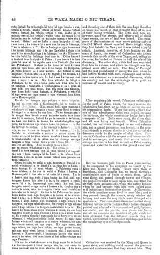 TE WAKA MAORI O NIU TIRANI. roto, katahi ka whaongia ki roto ki nga kaaho e rua, tetahi ki tetahi kaaho tetahi ki tetahi kaaho, tutaki rawa; katahi ka whiua tetahi o aua kaaho ki te moana tere ai, ko tetahi i waiho tonu ki runga ki te kaipuke, mo te tahuri te kaipuke mana e tere atu i te wai. Otira i nui te kaha o taua kaipuke iti nei, i ora tonu ; ka toru wiki e rere ana ka pa te karanga, " ko te whenua, e!" Ko te haringa o nga heramana i to ratou kitenga ano i te Ao Tawhito i ahua rite ano ki to ratou haringa i te kitenga i te Ao Hou ra— he tika hoki, he hokinga hari ano ia. Otira kaore i u tuatahi taua kaipuke ki Peina ; i pae haere i te hau puta ke ana ki te ngutu awa o te Teekahi (he awa kei Potukara). Katahi ia ka tomo ki roto ki taua awa ka rere tonu atu ka u ki te taone ki Rihipona, ki reira korero ai i ana korero. Ko tetahi o ana kaipuke i wehea atu i a ia i te tupuhi i te moana, a i mahara ia kua mate atu, ki hai i roa ka tae ora mai ano i muri i a ia. Na, kua whiwhi te kingi o Potukara ki te utu o tona mahi, ara kua kite ia i te tangata i taunutia i tinihangatia e ia i mua ai kua hoki ora mai tenei, kua ata puta ona tikanga, kua kore hoki tona kainga, a Potukara, e whiwhi ki nga rawa me nga mana o nga whenua kua kitea nei e Koromopahi. Katahi ka hangaa nga pakaru o toua kaipuke. ka oti ka rere ano a Koromopahi ki te taone ki Parohi (kei Peina). Kua maha hold nga marama i whakaaro u.i nga tangata o taua taone heoi to ratou kitenga i a ia ratou ko ona hoa. No te taenga atu o te rongo tera tetahi o aua kaipuke maia ra e tomo ana ki te wahapu, katahi ka pa te umere a te katoa, ka hari nui katoa te taone, ka whakatangihia nga pere, ka tutakina nga whare hoko, ka ponar:, - -^u iho ka turituri te "k;itea. I te ekenga o Koro"?- . ••"'ii Id uta, ka mui katoa te tangata Id to karari.;..- '•.1 p. ia. Katahi ka whakarite a matua ta ratou haere, ka haere katoa ki te tino whare karakia i taua taone ki te whakawhetai ki te Atua mo te rironga ma nga tangata o taua taone rawa e kite i taua t-ik;.-' - •, -"ui, ara i te Ao Hou. Ano he kingi ra\\\\ci a Koi •. ••. .:. me ta ratou whakanui i a ia. He ahn;i I:. . . ; 11 tenei ito tera taenga ona ki taua taone i te i^i^hi ra; ara i tona taenga ki te keeti o te whare kura katorika, i inoi ai ia kia homai tetahi mea paraoa ma tona tamaiti! Otira hei aha te mahi a nga tangata o Parohi i to mahi whakanui a te kingi i a ia, raua ko te kuini, i tona taenga ki to raua whare. I Pahirona raua i taua takiwa, a he roa te wahi o Peina i haerea e Koromopahi i tae atu ai ki reira ki a raua. I a ia e haere ana ma roto i nga taone ka hui mai nga tangata katoa kia kite i a ia, a ka umere o ratou waha ki a ia, haparangi ana tera; ko ona hoa, tangata maori o nga motu i haerea e ia, tirohia ana e ratou te ahua, ano he tangata i heke mai i tetahi ao noa atu no te rangi. Ka tae ia ki Pahirona ka papa- horo katoa mai nga tangata o te taone ki te whaka- taki i a ia ; a, i tona tira e haere ana i nga rori o te taone, i kapi katoa nga matapihi o nga whare i te tangata, me nga whakamahau; me runga o nga whare ano, i kapi katoa i te tangata matakitaki ki a ia. Ka haere ko taua maia rapu whenua ki mua, ko ona hoa tangata maori o nga whenuai kitea e ia i muri haere ai, ko o ratou tinana i panipania ki te horu o to ratou whenua," i whakapaipaitia i a hoki ratou ki nga mea koura whakapai tangata o o ratou whenua, me nga huruhuru manu, me nga pupu. Ko nga manu, me nga rakau, me nga hua rakau, me nga potae koura, me nga mea pera katoa i mauria mai i nga motu i haerea e Koromopahi, i hapainga katoa aua mea i mua o to ratou tira mau haere ai hei miharotanga ma nga Paniara. He nui te whakahonore a te kingi raua ko te kuini i a Koromopahi i tona taenga atu, he nui rawa to raua manaaki me to raua atawhai ki a ia. I tu rawa and throwing one of them into the sea, kept the other on board his vessel, so that it might float off in case of their being wrecked. The little ship bore up, however, amid the storms, and after a sail of about three weeks, the cry of land was heard. The trans- ports of the mariners at once more gaining sight of the Old World almost equalled their delight when they first beheld the New; and it was indeed a joyful return. Instead, however, of first landing on the coast of Spain, the vessel of Columbus was driven towards the mouth of the river Tagus, and, sailing up the river, he landed at Lisbon to tell the tale of his discovery. The other ship, which had been separated from him in a storm, and which he thought was lost, arrived soon after all safe. The King of Portugal had the just punishment of seeing the man whom he had before treated with such contempt and unfair- ness now returned as a successful discoverer, while his country had lost the advantage of so groat an increase of wealth and territory. After repairing his vessel, Columbus sailed again for the port of Palos, where, fur many months rhc- inhabitants had given up all hope oi' s-oeiii^ him and his companions again. When the ne.wa arrived l"Ii;ii one of t!ie adventurous ships was indeed cm.onu^ the harbour, the whole community broke forth into transports of joy. Bells wore rung, the sl:ops shin-, and all was hurry and tumult. When Columbus landed, the multitude thronged to see and welcome him, and a grand procession was formed to the prin- cipal church to return th;nika to God for ^o siiJ;;-i.nl a discovery made by the people of tli;ir phieo. '.\\'\\[c-\\' treated Columbus with the respect" ;iiid liunour usi!;i'h- paid to sovereigns, and made tli:it return iudc'.'.-L ;i strange contrast to his first arrival at Palos, craving bread and water for his child at the s;ate 'of a convent! But the honours paid him at Palos were nothing to be compared to his reception at Court by the King and Queen of Spain. They were then at Barcelona, and Columbus had to travel through a considerable part of Spain to reach them. As he went along, and passed through towns and villages, the people crowded to look upon hi