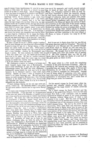 TE WAKA MAORI O NIU TIRANI. 43 raua ki runga i tona tapokoranga ki roto ki to raua whare, a i tohe raua kia kaua ia e tuturi i to raua aroaro ki te kihi i o raua ringa. (Ko te ritenga tena o mua ina haere te tangata ki te aroaro o nga Kingi). I te korerotanga a Koromopahi ki a raua i ana haerenga katoa, me te ataahua o nga motu kua kitea e ia ; i tona whakaaturanga hoki i nga manu me nga kuri hou i mauria mai e ia, me nga rakau, me nga rongoa utu nui kua kitea e ia, me nga pokuru koura me te puehu koura, me nga mea koura whakapai tangata no aua motu ; i tona whakakitenga rawa hoki ki a raua i nga tangata maori o aua motu i tera taha o te ao i riro mai i a ia, katahi raua ka tino koa ka tino hari nui rawa atu. I te mutunga o ana korero ka tuturi aua rangatira taua rua ka kuku i o raua ringi ka whakatoro ki te rangi, ka whaka- whetai atu ki te Atua mo tona atawhai nui i tukua mai nei ma raua te kitenga o te ao hou nei; muri iho ka haere katoa ratou ki te whare karakia a te kingi waiata ai i nga waiata whakawhetai. E hara i te mea ko te iwi o Peina anake i ngakau hari ki tenei kitenga nui kua kitea nei e Koromopahi. I puta te rongo ki nga iwi o Iuropi katoa, a i wha- kaaro nui ratou katoa ki taua mea. Otira kaore i mohio te.tahi tangata kotahi noa nei o aua iwi ki te nui o taua kitenga; ahakoa ko Koromopahi ano, kaore i mohio. Ki tana mahara ko tetahi wahi ia o Inia kua kitea nei e ia, me tetahi ara hou tuku tata e tae ai ki reira. Ki hai ia i mohio i reira ai, kaore hoki i mohio i muri iho i roto i nga ra o tona oranga, ko tetahi tino hawhe tera kua kitea nei e ia o te ao nui katoa "e noho nei tatou. Me whakapoto e matou te toenga o te korero mo tenei tangata ingoa rongo nui, a Koromopahi. I muri o tona whiwhinga ki nga utu me nga whaka- honoretanga katoa, me etahi atu tohu whakanui, i whakaaetia moua, katahi ka rere ano ia ki te taha hauauru ki te whakaoti marire i tana mahi rapu whenua. Katahi ka kore e wehi to tangata ki te haere i a ia i tenei haerenga ana. He nui nga hera- mana, me etahi rangatira Paniara ano, i tino tohe kia whakaae ia kia haere tahi ratou i a ia; he nui hoki nga kaipuke pai rawa i tukua ki a ia, ko ia tonu te rangatira mo aua kaipuke. I tenei rerenga tuarua nei he nui nga motu pai, nunui, i kitea e ia. Ko Hameika tetahi o aua motu, ko nga motu maha e huaina ana ko nga motu Karipi etahi. I te toru o ana rerenga ka kite ia i to motu e huaina ana ko Tirinitata. I kite ano hoki ia i te ngutu-awa o tera awa nui rawa a Te Orinoko, a i mohio ia ki te nui o taua awa he awa puta mai ia i tetahi tuawhenua nui rawa. He maha ano hoki ona ekenga ki uta ki te tuawhenua o Amerika, engari kaore rawa ia i mohio ki te nui rawa o taua whenua. Otira ko nga ra o Koromopahi e tata ana ki to mutunga e hara i te ra hei nui anake mona, hei whakahonoretanga mona. I rokohanga ia e to he nui atu i nga he kua pa ki te tangata o mua iho. Ara, i a ia ano e whakahaere ana i taua mahi kimi whenua hou, ka tukua etahi korero whakapae kino mona ki Peina, e etahi o nga tangata Paniara kua noho ki to Weta Inia (nga motu i kitea nei e ia)—he hae ki a ia me tona nui, he kore hoki no ratou e pai kia noho ki raro i tono mana. I tawaretia te kingi me te kuini ki aua korero whakapae teka, no reira ka puta ta raua kupu kia whakahokia a Koromopahi ki Peina kia whakawakia ia. Katahi ka hereherea ona ringaringa me ona waewae ki te mekameka, ka kawea ki runga kaipuke, ka whakahokia Id Peina. No te meatanga a ona kai tiaki kia tangohia nga mekameka, ki hai i whakaaetia e ia. I tohe tonu ia kia puta ia ki te aroaro o te kingi raua ko te kuini me ana mekameka ano, ki te whakahoki i nga whakapae mona. Ki hai i roa e korero ana ia kua mohio a Patinana raua ko Ihapera he parau aua korero, he tangata hara rose up at his approach, and would scarcely permit him to kneel at their feet and kiss their hands. When, too, Columbus related to them all that ho had done—described to them the beautiful islands he had found—showed them the specimens he had brought of unknown birds and animals, rare plants and drugs, lumps of gold and gold dust, or strangely formed golden ornaments—and, above all, when he presented to the King and Queen the natives of these new countries on the other side of the world, nothing could exceed their satisfaction and delight. As he finished his recital, the pious sovereigns sank on their knees, and, raising their clasped hands to heaven, poured forth thanks and praises to God for so great a providence, and then repairing to the royal chapel, a Te Deum, or hymn of praise, was sung by all the Court. And it was not in Spain alone that joy was felt at the great discovery made by Columbus. The news of it spread all over Europe, and the greatest interest was shown about it, though no one—not even Co- lumbus himself—was aware of the greatness of the discovery. He thought that he had found out but a part of India, and a new and nearer way of getting to it. He little imagined then, nor did he ever know, that he had been the finder of a new half of the great globe on which we live. We must relate in a few words the remaining history of the great discoverer Columbus. After re- ceiving all the rewards and honours that had been promised him, and many other marks of favour and distinction, he set forth on another voyage to the west, in order to complete his discoveries. Instead now of being afraid of venturing with him, sailors and even many private gentlemen eagerly sought for permission to accompany him, and a noble fleet of ships was put under his command. On his second voyage he found many other im- portant and valuable islands, among which was Jamaica and the large cluster of islands called the Caribbees. On a third voyage, he found Trinidad and the mouth of the great river Orinoco, which he felt sure must flow from a vast continent; and on several occasions he landed on parts of the great continent of America, without being aware of what a vast country it was a part. But the close of the life of Columb