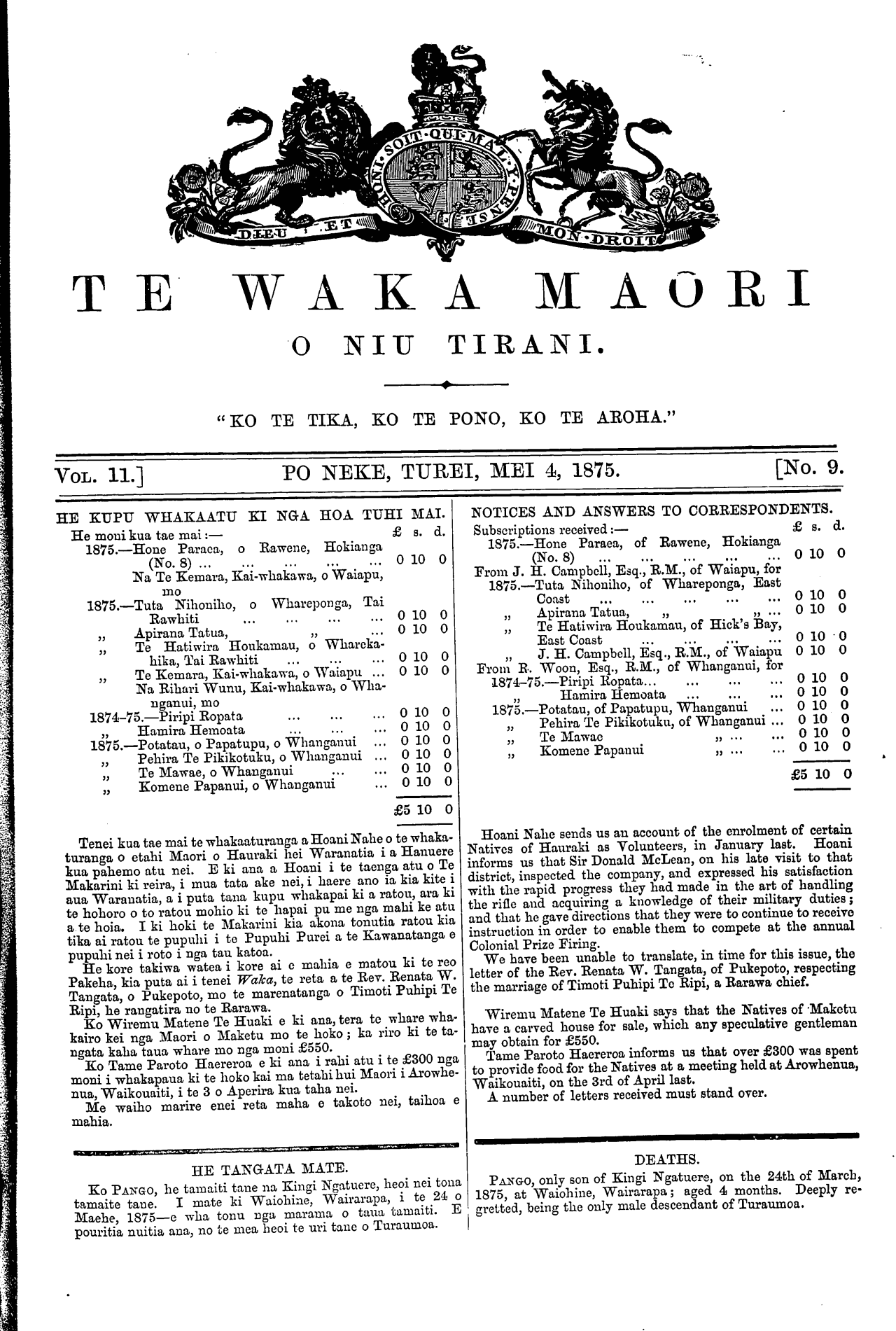 TE WAKA MAORI O KIU TIRANI. ———————————————————— "KO TE TIKA, KO TE PONO, KO TE AROHA." VOL. 11.] PO NEKE, TUREI, MEI 4, 1875.[No. 9. HE KUPU WHAKAATU KI NGA HOA TUHI MAI. He moni kua tae mai:— £ a. d. 1875.—Hone Paraoa, o Rawene, Hokianga (No. 8) ... ... ... ... ... O 10 O Na Te Kemara, Kai-whakawa, o Waiapu, mo 1875.—Tuta Nihoniho, o Whareponga, Tai Rawhiti ... ... ... ... O 10 O „ Apirana Tatua, „ ... O 10 O „ Te Hatiwira Houkamau, o Whareka- hika, Tai Rawhiti ... ... ... 010 O „ Te Kemara, Kaiwhakawa, o Waiapu ... 010 O Na Rihari Wunu, Kaiwhakawa, o Wha- nganui, mo 1874-75,—Piripi Ropata ... ... ... O 10 O „ Hamira Hemoata ... ... ... O 10 O 1875.—Potatau, o Papatupu, o Whanganui ... O 10 O „ Pehira Te Pikikotuku, o Whanganui ... 010 O „ Te Mawae, o Whanganui ... ... O 10 O „ Komene Papanui, o Whanganui ... 010 O £5 10 O Tenei kua tae mai te whakaaturanga a Hoani Nahe o te whaka- turanga o etahi Maori o Hauraki hei Waranatia i a Hanuere kua pahemo atu nei. E ki ana a Hoani i te taenga atu o Te Makarini ki reira, i mua tata ake nei, i haere ano ia kia kite i aua Waranatia, a i puta tana kupu whakapai ki a ratou, ara ki te hohoro o to ratou mohio ki te hapai pu me nga mahi ke atu a te hoia. I ki hoki te Makarini kia akona tonutia ratou kia tika ai ratou te pupuhi i to Pupuhi Purei a te Kawanatanga e pupuhi nei i roto i nga tau katoa. He kore takiwa watea i kore ai e mahia e matou ki te reo Pakeha, kia puta ai i tenei Waka, te reta a te Rev. Renata W. Tangata, o Pukepoto, mo te marenatanga o Timoti Puhipi Te Ripi, he rangatira no te Rarawa. Ko Wiremu Matene Te Huaki e ki ana tera to whare wha- kairo kei nga Maori o Maketu mo te hoko; ka riro ki te ta- ngata kaha taua whare mo nga moni £550. Ko Tame Paroto Haereroa e ki ana i rahi atu i te £300 nga moni i whakapaua ki te hoko kai ma tetahi hui Maori i Arowhe- nua. Waikouaiti, i te 3 o Aperira kua taha nei. Me waiho marire enei reta maha e takoto nei, taihoa e mahia. HE TANGATA MATE. Ko PANGO, he tamaiti tane na Kingi Ngatuere, heoi nei tona tamaite tane. I mate ki Waiohine, Wairarapa, i te 24: o Maehe, 1875—e wha tonu nga marama o taua tamaiti. E pouritia nuitia ana, no te mea heoi te uri tane o Turaumoa. | NOTICES AND ANSWERS TO CORRESPONDENTS. Subscriptions received:— £ s. d. 1875.—Hone Paraea, of Rawene, Hokianga (No. 8) ... ... ... ... ... O IO O From J. H. Campbell, Esq., R.M., of Waiapu, for 1875.—Tuta Nihoniho, of Whareponga, East Coast ... ... ... ... ... O IO O „ Apirana Tatua, „ „ ... O 10 O „ Te Hatiwira Houkamau, of Hick's Bay, East Coast ... ... ... ... O IO O „ J. H. Campbell, Esq., R.M., of Waiapu O IO O From R. Woon, Esq., R.M., of Whanganui, for 1874-75.—Piripi Ropata... ... ... . . O IO O „ Hamira Hemoata ... ... . . O 10 O 1875.—Potatau, of Papatupu, Whanganui . . O 10 O „ Pehira Te Pikikotuku, of Whanganui . . O 10 O „ Te Mawae „ ... . . O 10 O „ Komene Papanui „ ... . . O 10 O £5 10 O Hoani Nahe sends us au account of the enrolment of certain Natives of Hauraki as Volunteers, in January last. Hoani informs us that Sir Donald McLean, on his late visit to that district, inspected the company, and expressed his satisfaction with the rapid progress they had made in the art of handling the rifle and acquiring a knowledge of their military duties; and that he gave directions that they were to continue to receive instruction in order to enable them to compete at the annual Colonial Prize Firing. We have been unable to translate, in time for this issue, the letter of the Rev. Renata W. Tangata, of Pukepoto, respecting the marriage of Timoti Puhipi To Ripi, a Rarawa chief. Wiremu Matene Te Huaki says that the Natives of "Maketu have a carved house for sale, which any speculative gentleman may obtain for £550. Tame Paroto Haereroa informs us that over £300 was spent to provide food for the Natives at a meeting held at Arowhenua, Waikouaiti, on the 3rd of April last. A number of letters received must stand over. DEATHS. PANGO, only son of Kingi Ngatuere, on the 24th of March, 1875, at Waiohine, Wairarapa; aged 4 months. Deeply re- gretted, being the only male descendant of Turaumoa.
